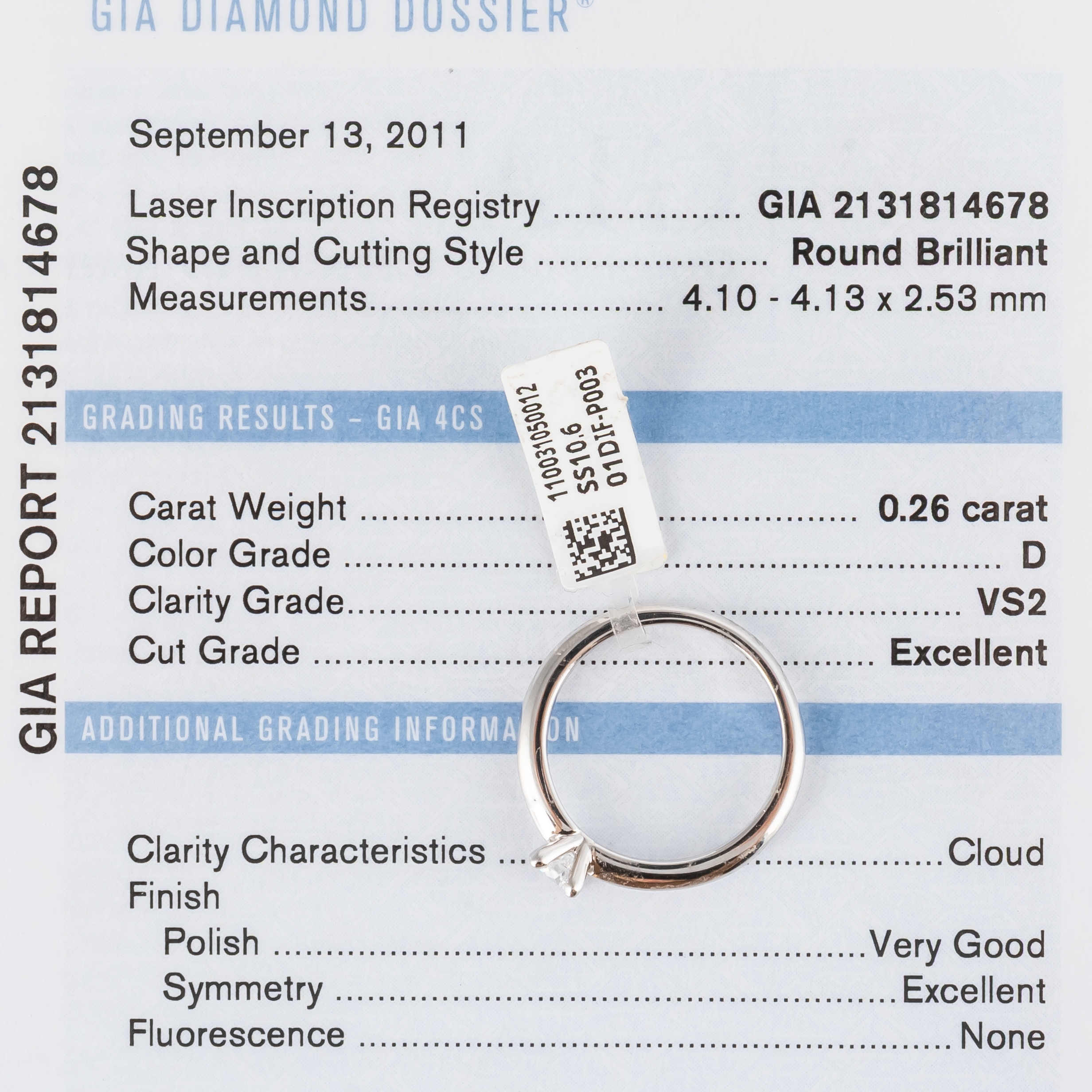 Mounted with a round brilliant cut diamond weighing 0.26 carats, with a colour of D and clarity of VS2, in platinum, size M, gross weight 4.72 grams, with a GIA certificate