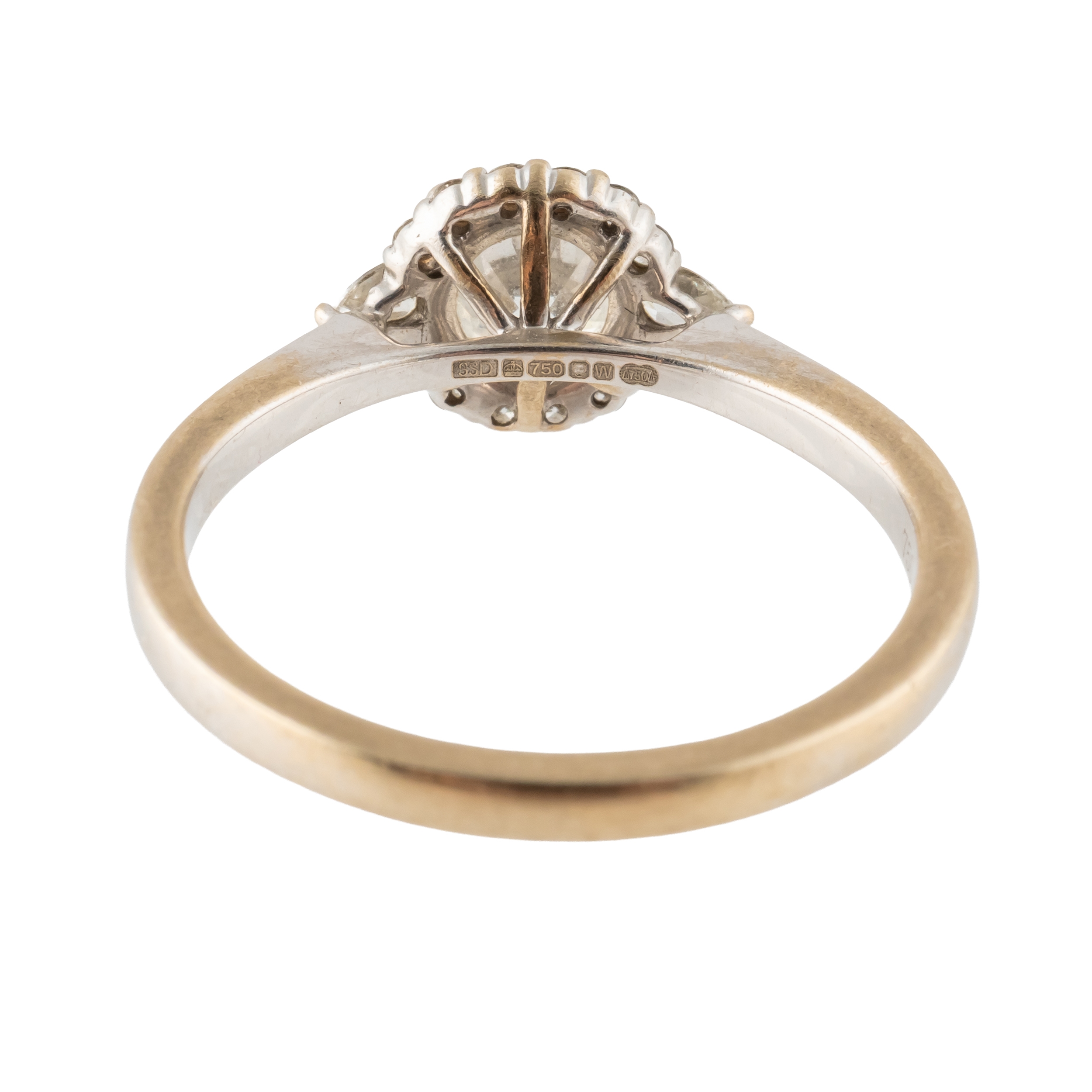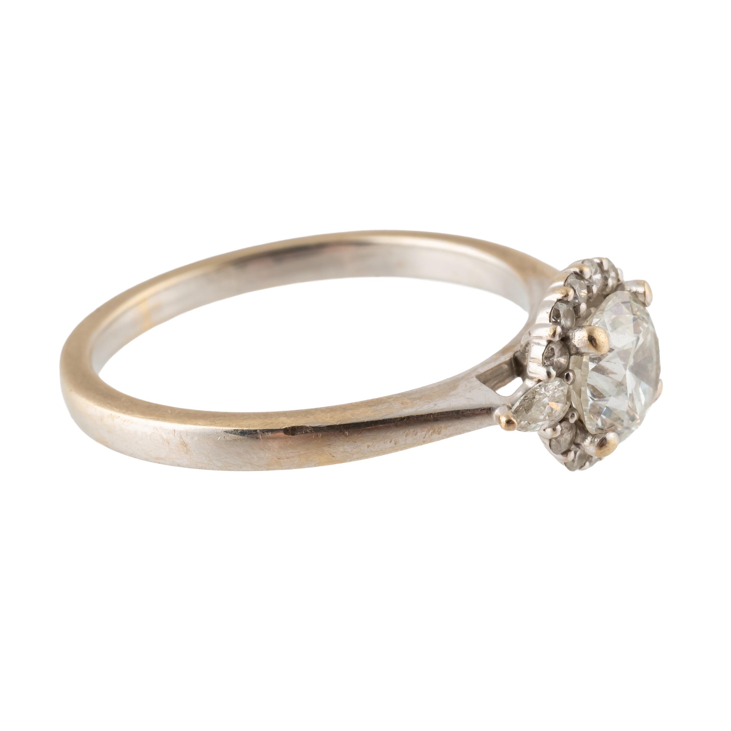 Claw set with the principal round brilliant cut diamond at the centre, between pear shaped diamond single stone sides, otherwise mounted with a surround of round brilliant cut diamonds, detailed 750, ring size Q, gross weight 3.7 grams, with a 77 DIAMONDS London specification document stating 1.01 CT G colour and VVS2 clarity