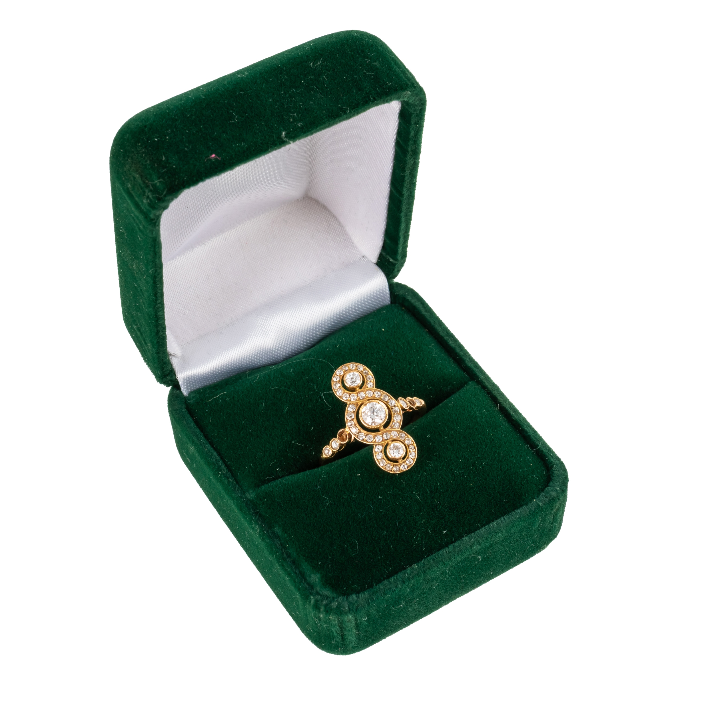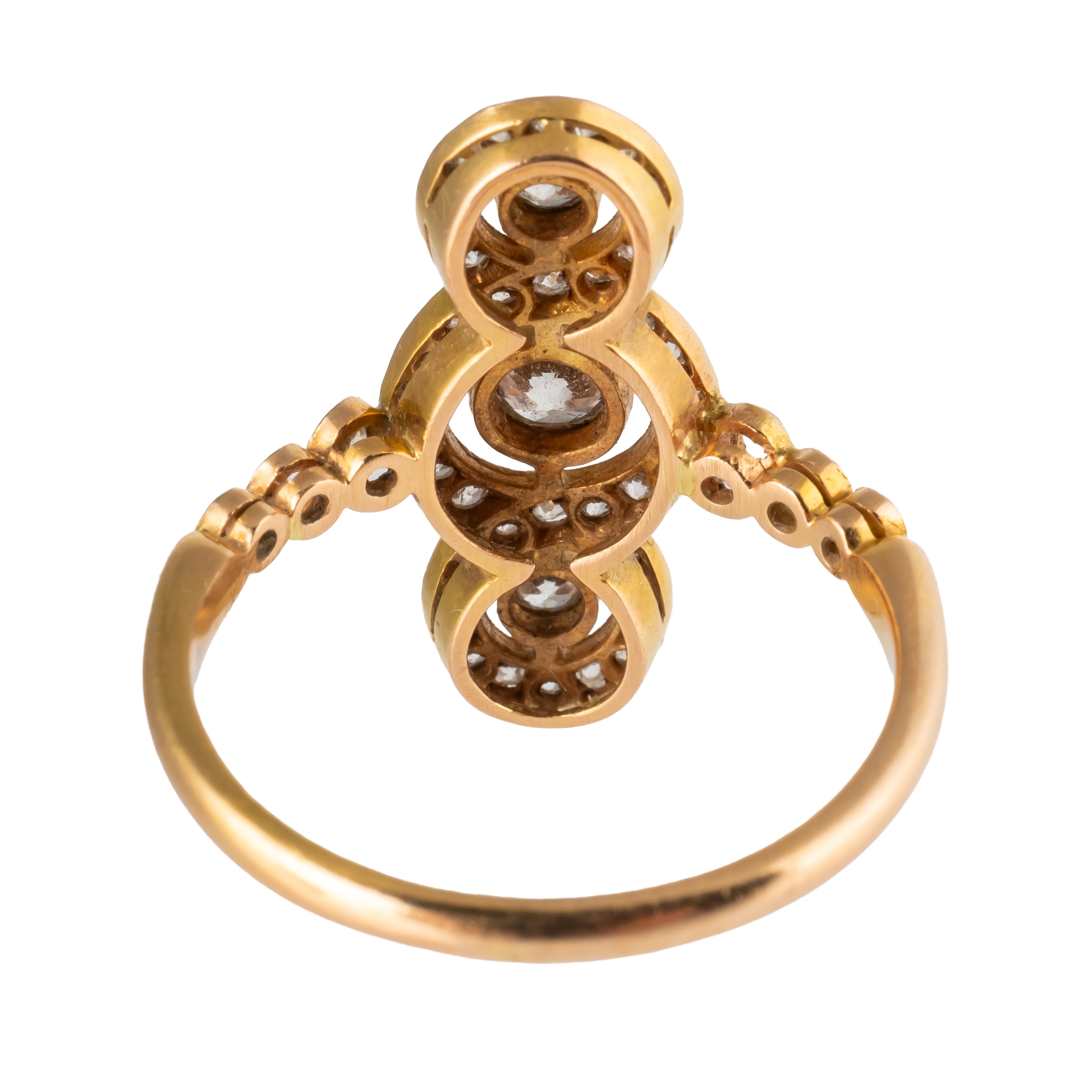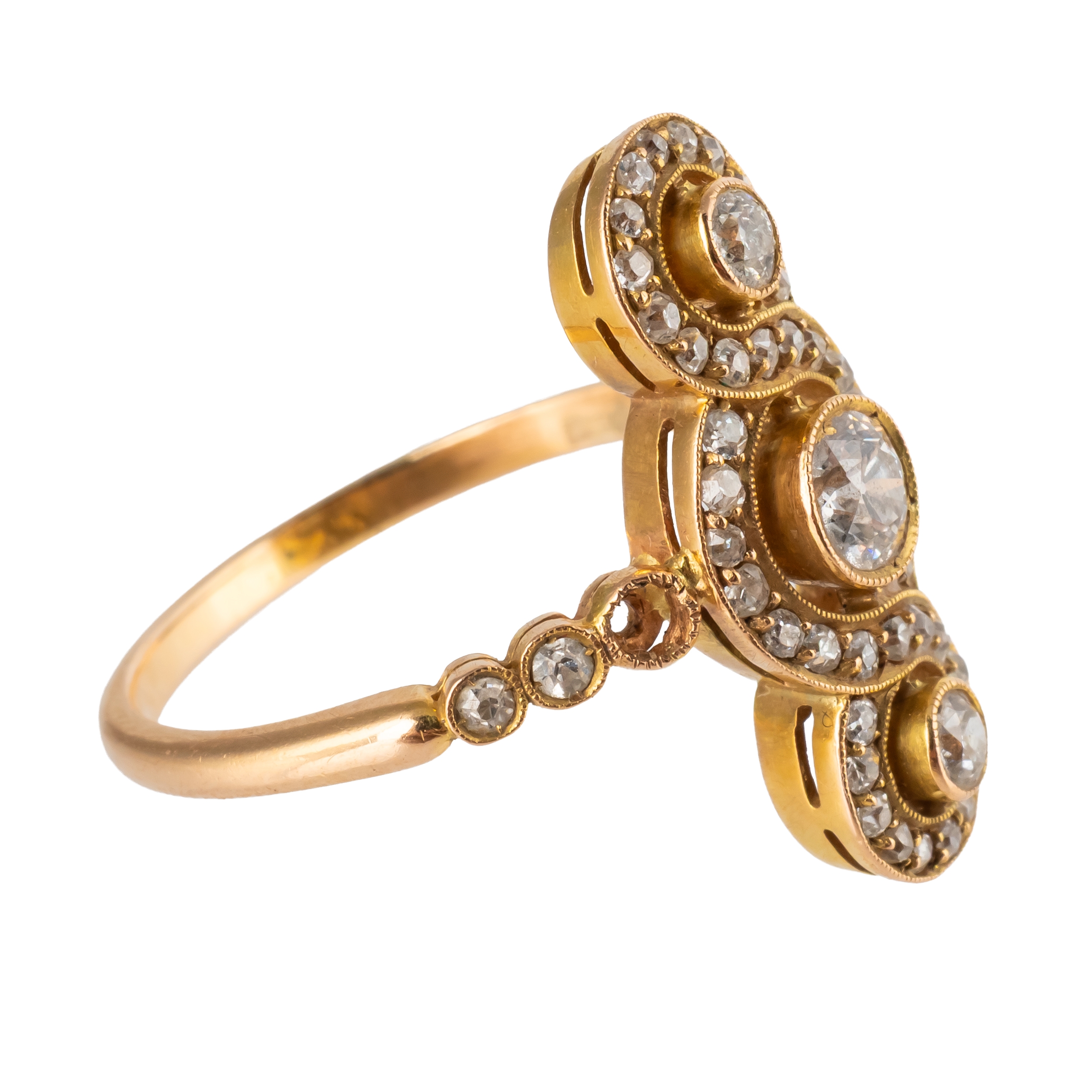 Of contemporary design, mounted with old cut diamonds (two lacking), in unmarked rose gold, size M½, gross weight 3.2 grams, with a box