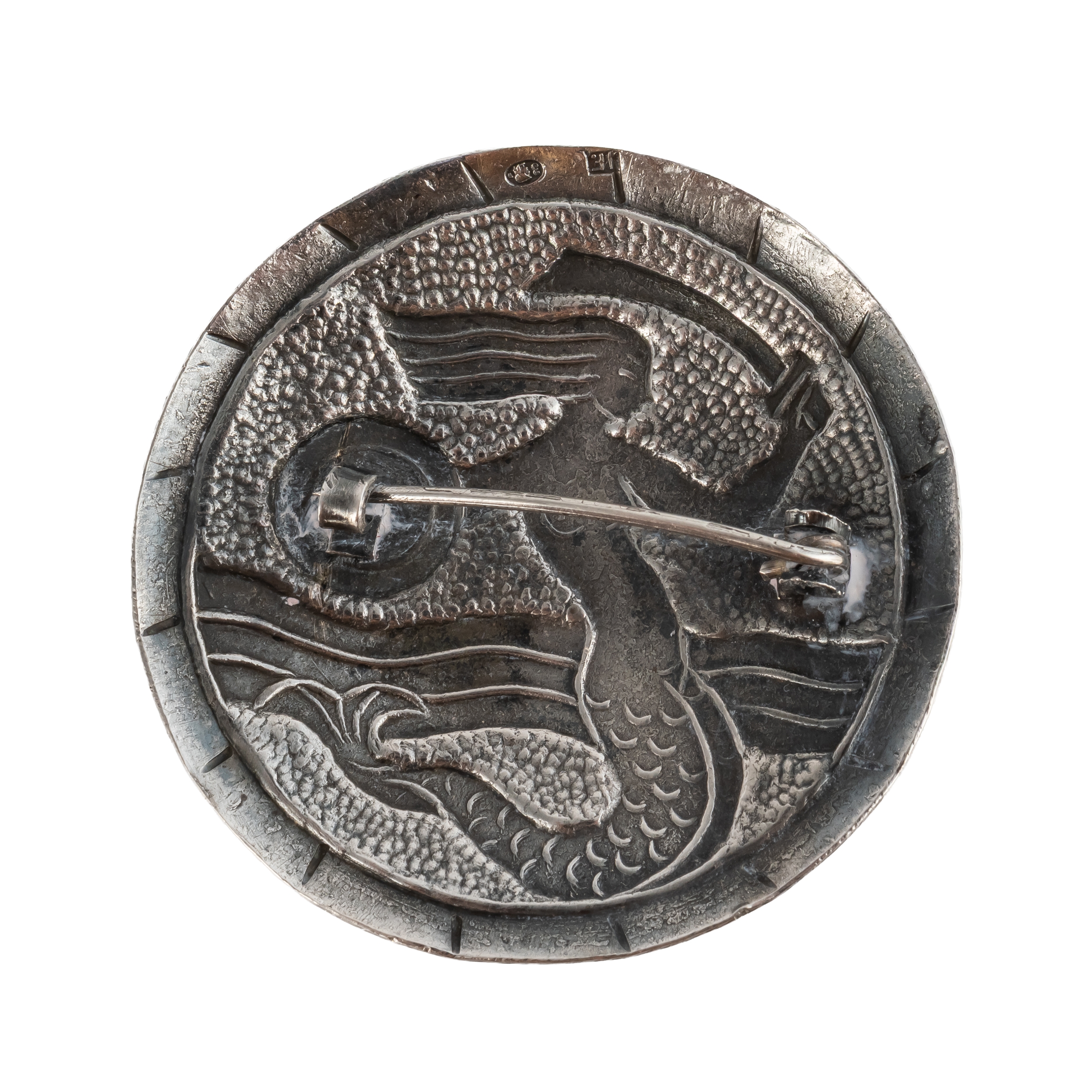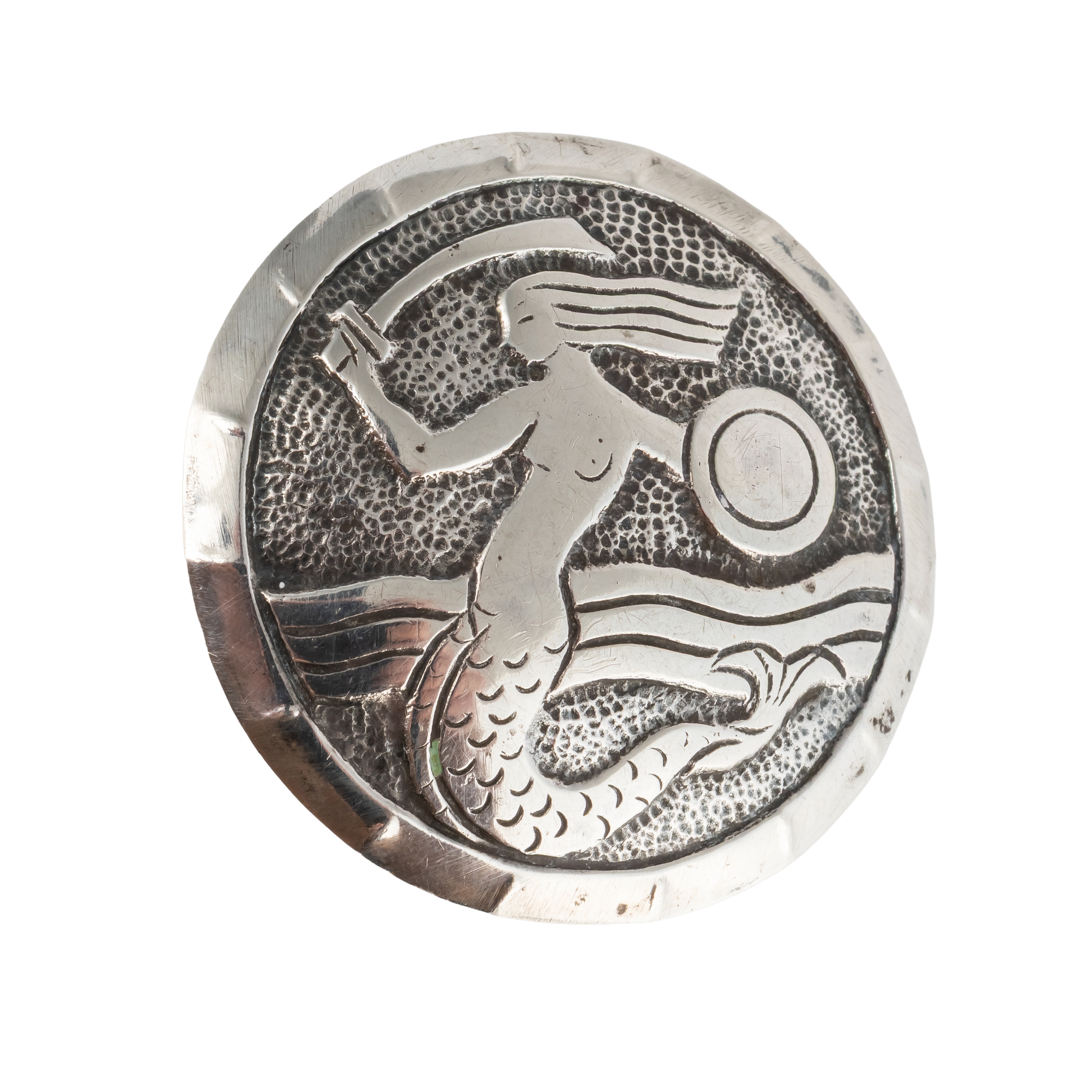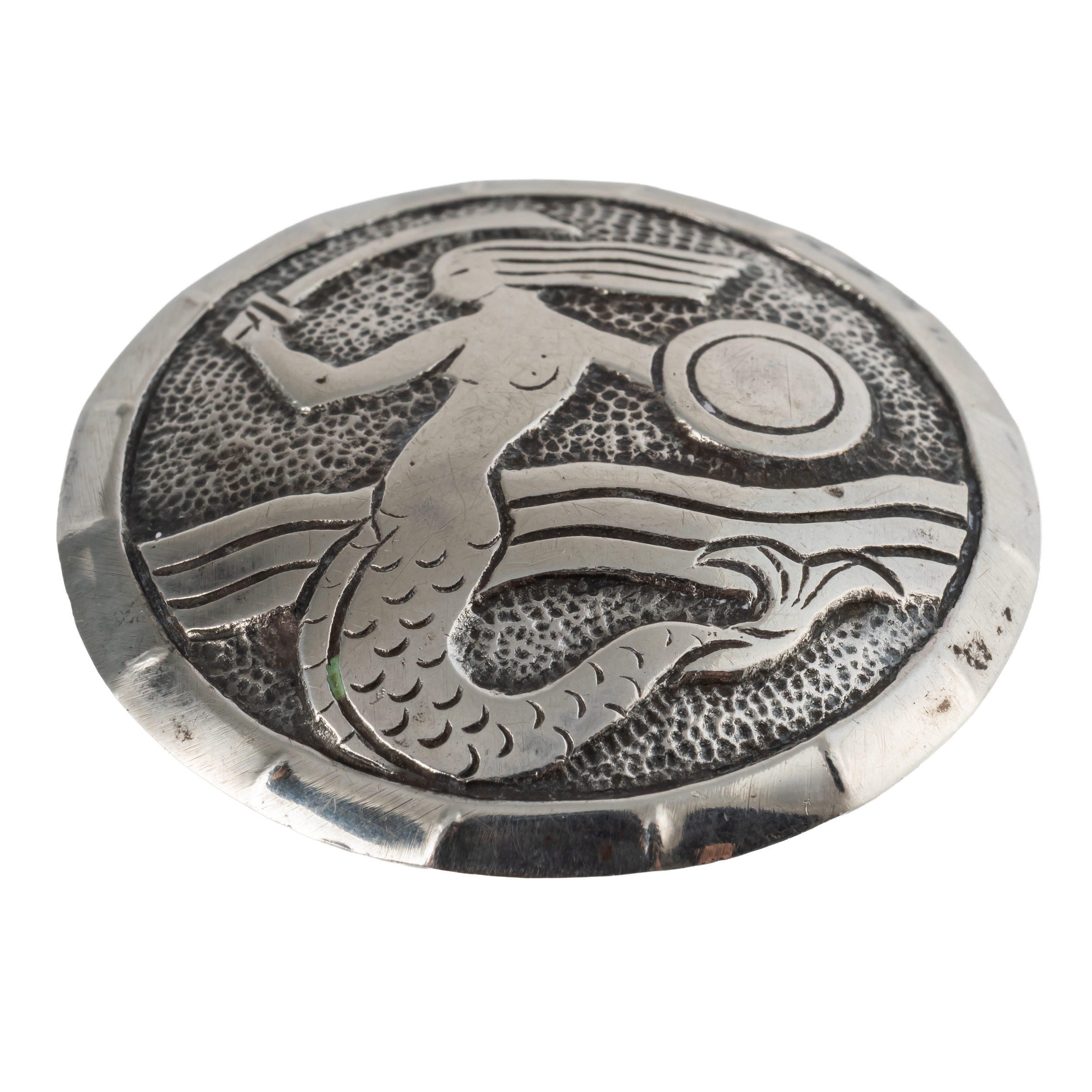 Depicting a mermaid with sword and shield, in silver, measuring 22.3mm in diameter, weight 10.2 grams