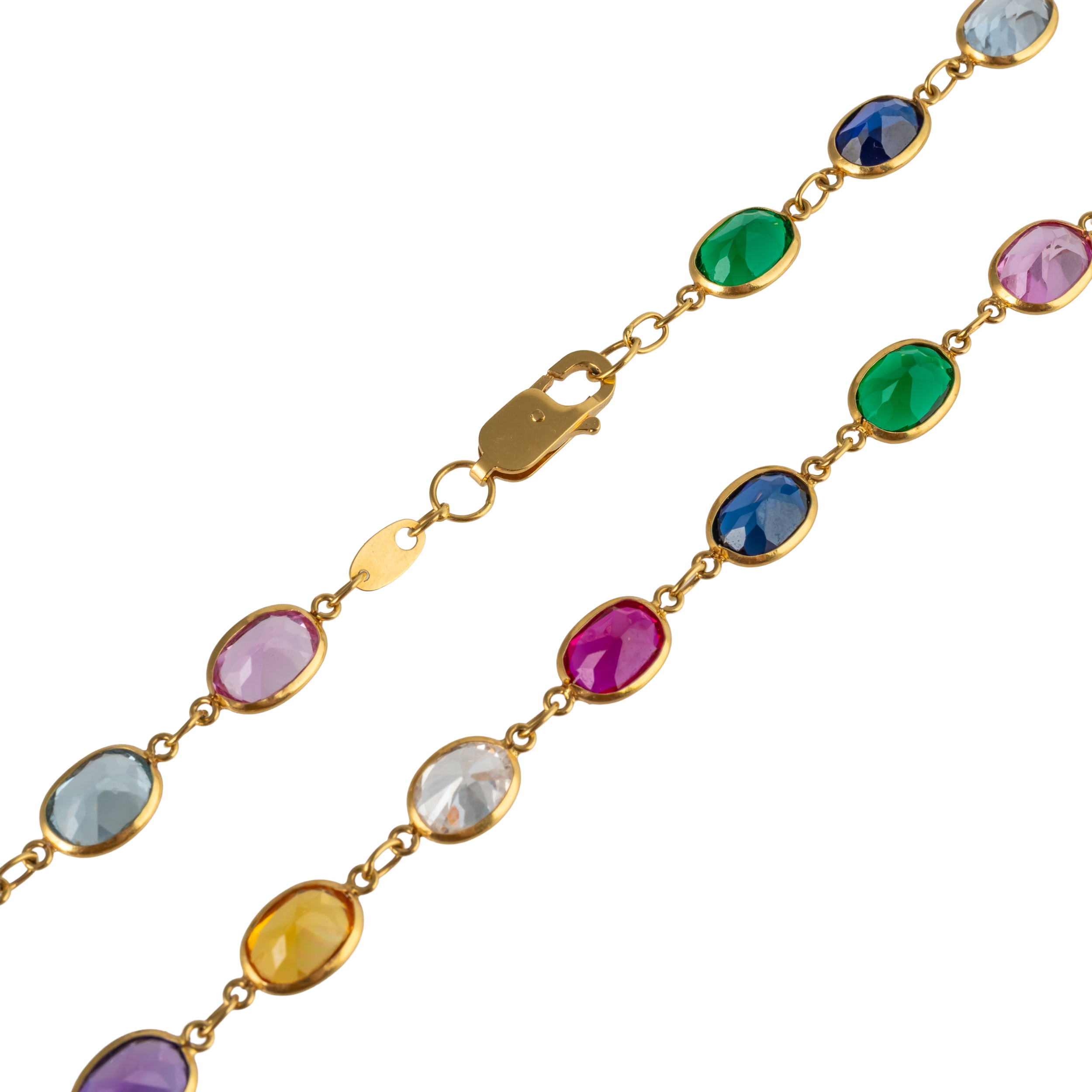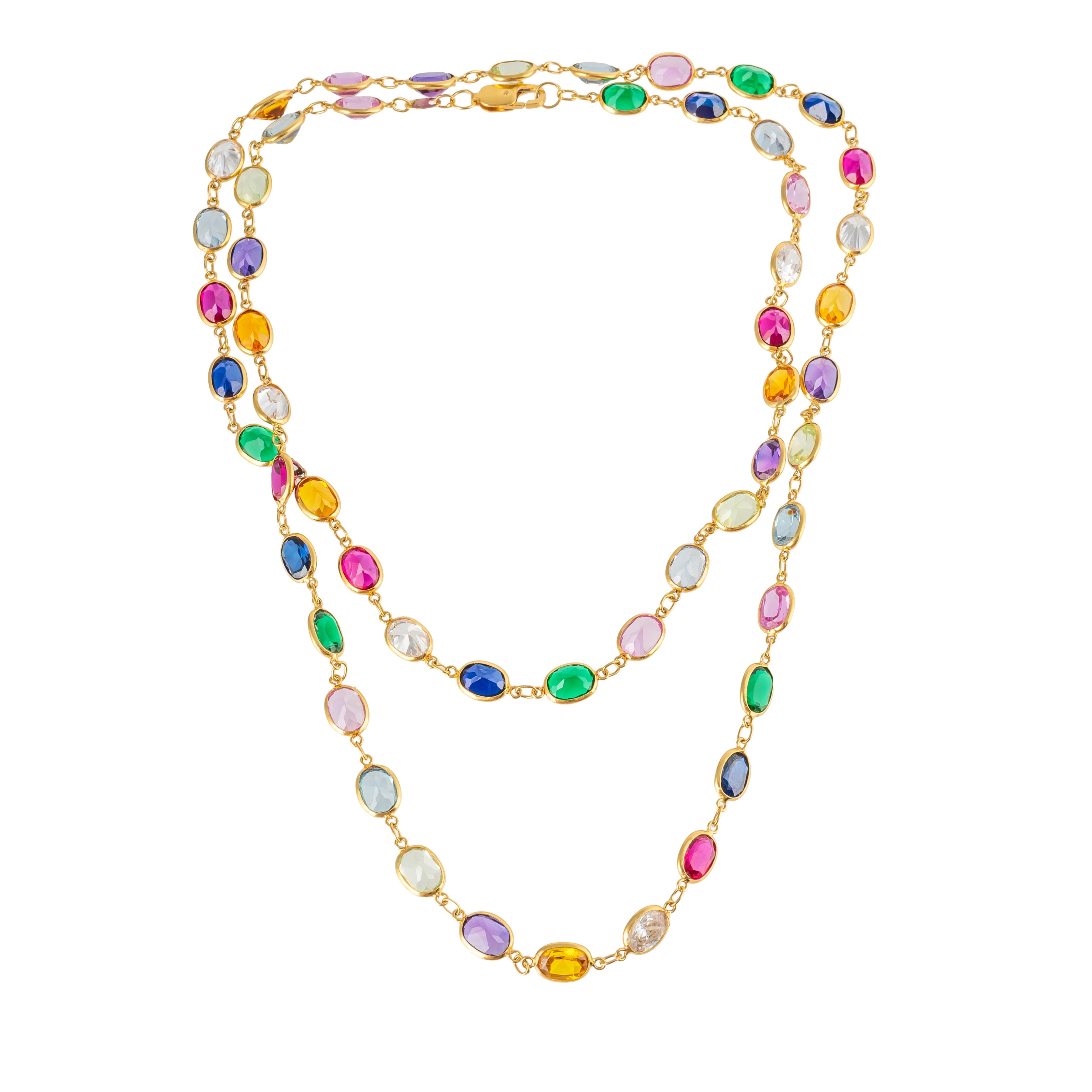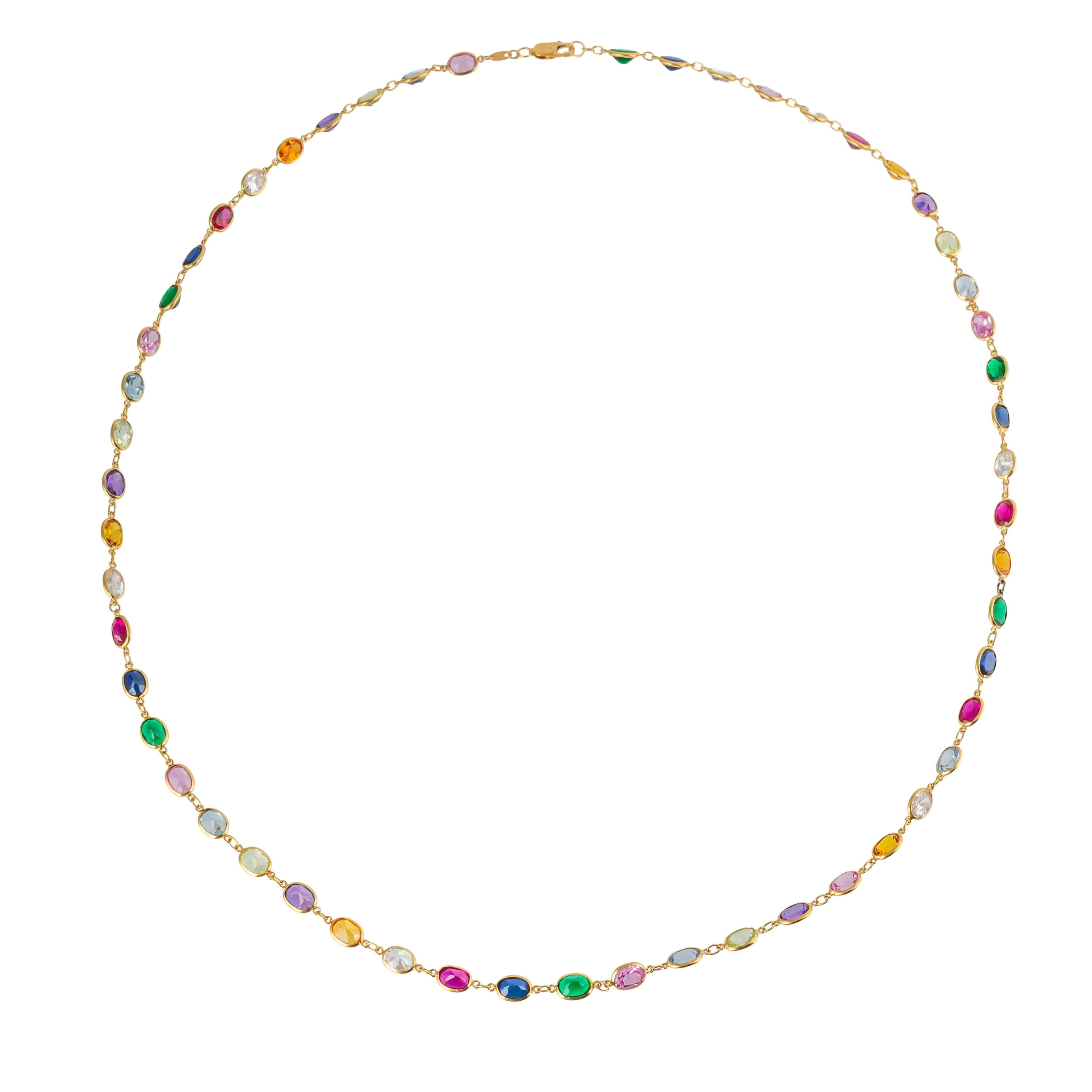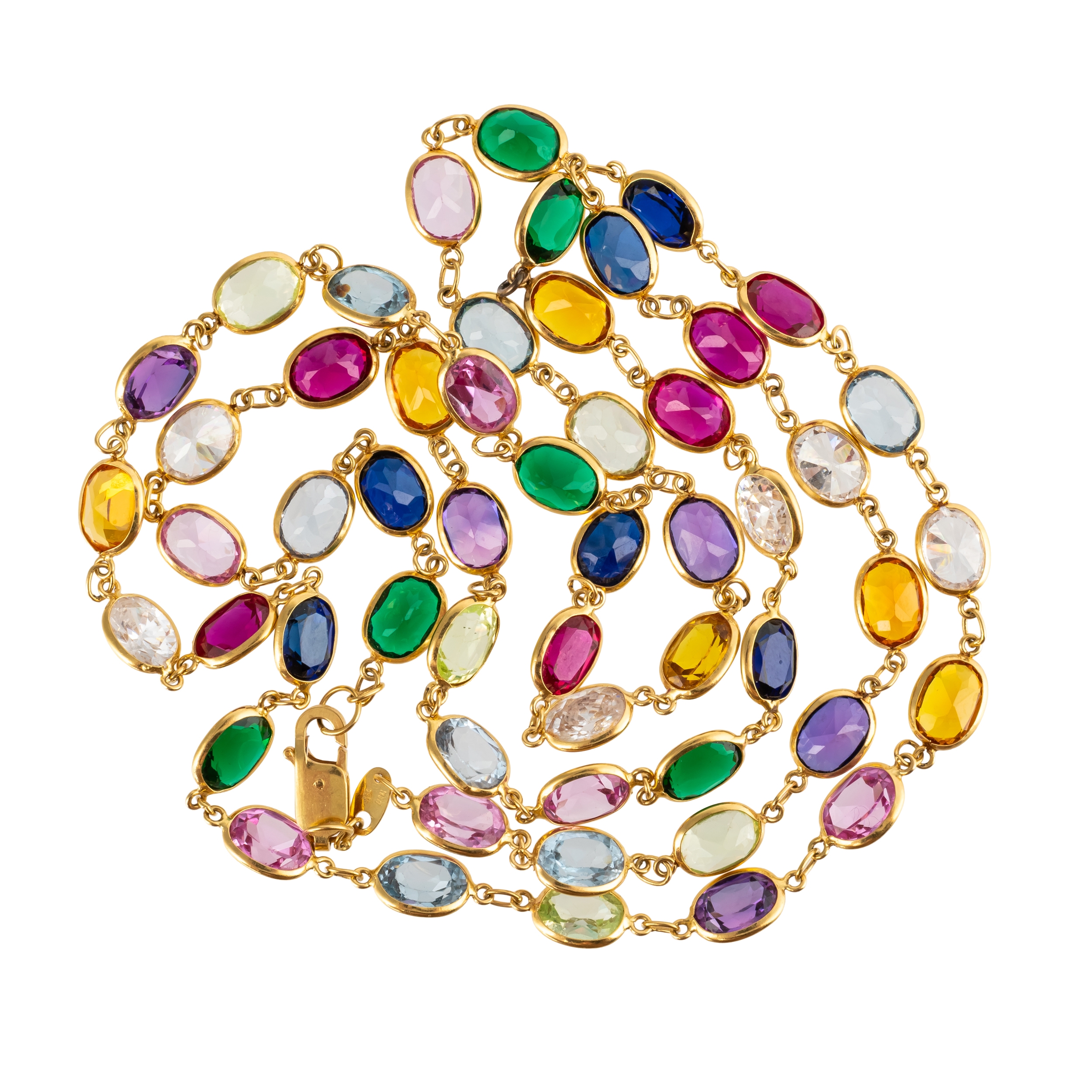Set with CZ's, synthetic sapphires and rubies, quartz and other stones, measuring 81.5cm in length, with lobster clasp, gross weight 27.8 grams
