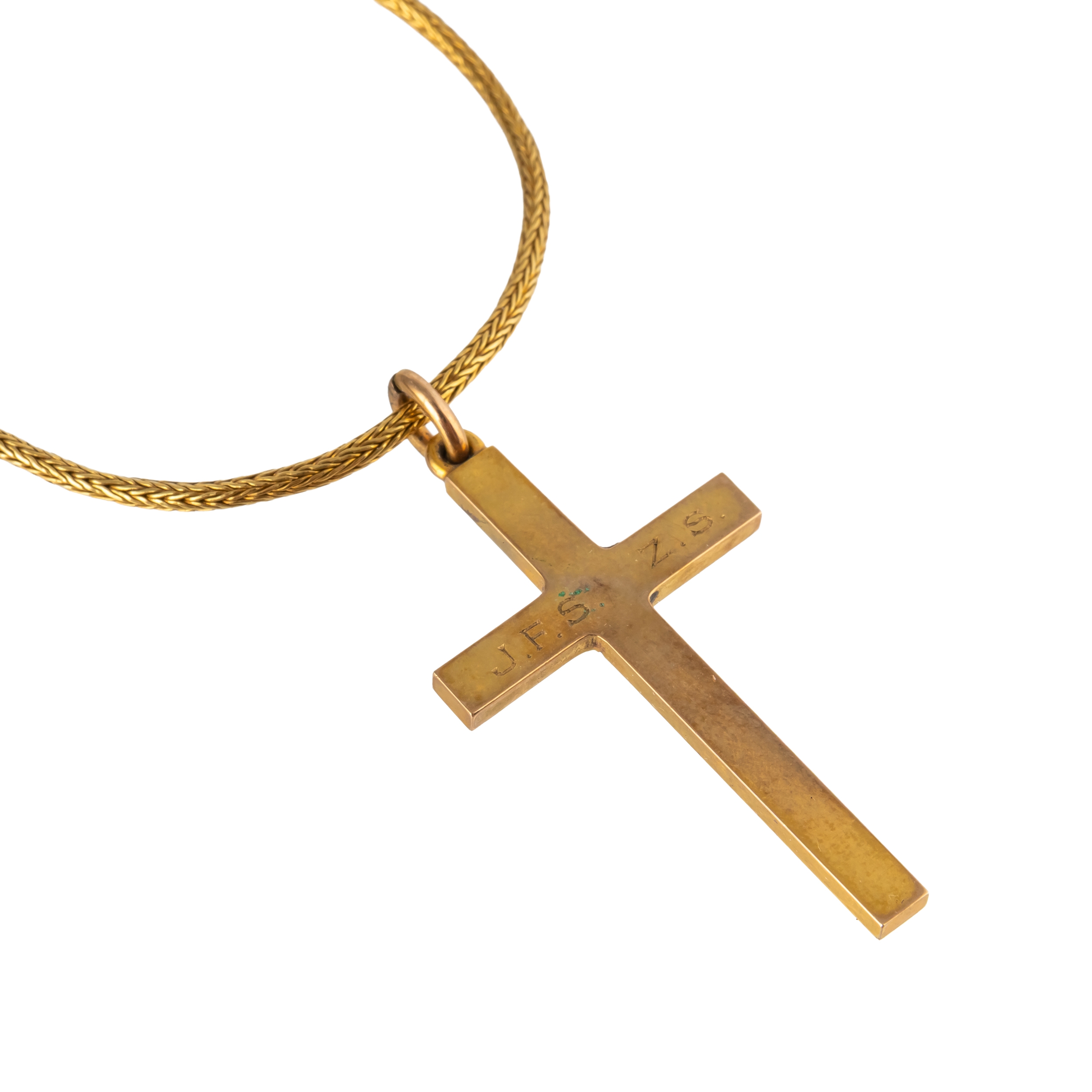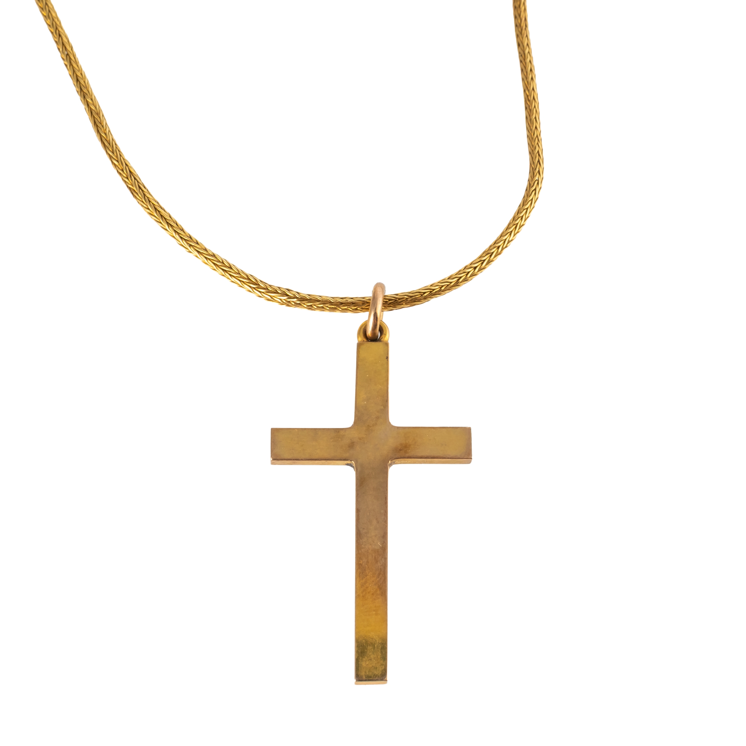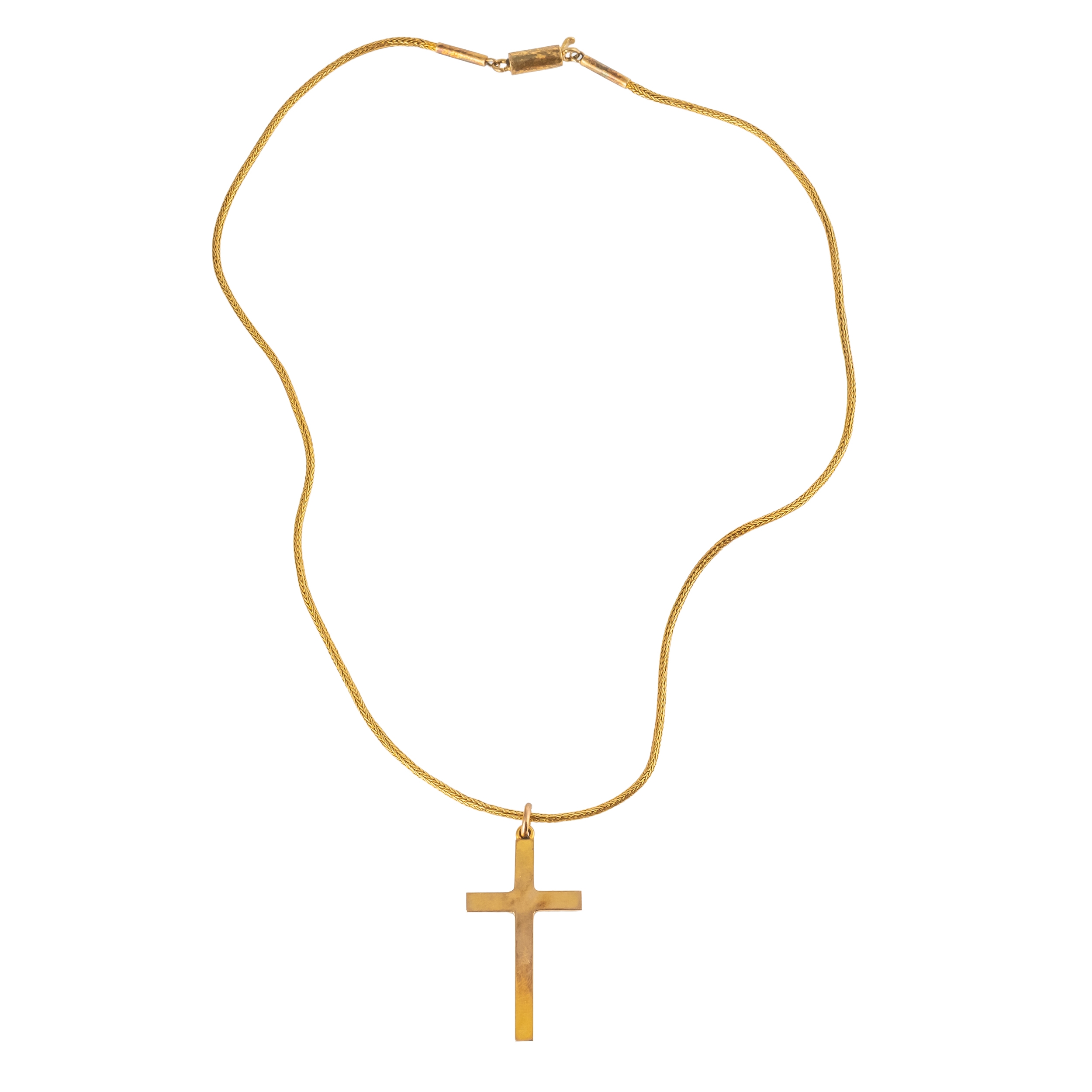 Including a cross pendant and a broken chain, both in unmarked gold, weight 8.4 grams, with a box