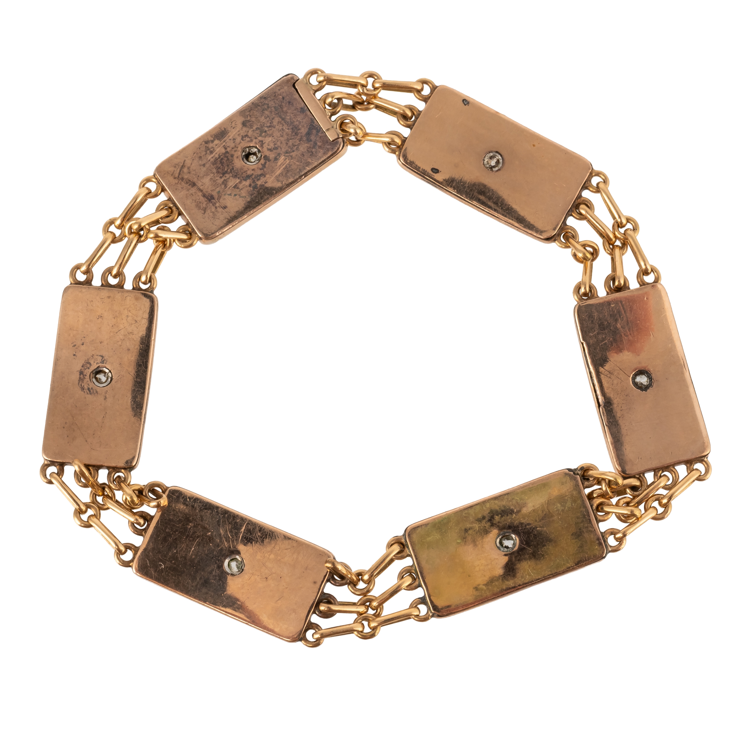With rectangular panels set with pink guilloche enamel and an old cut diamond, connected by long and short links, with a hidden box clasp, in unmarked gold, measuring 18cm in length, gross weight 19.3 grams