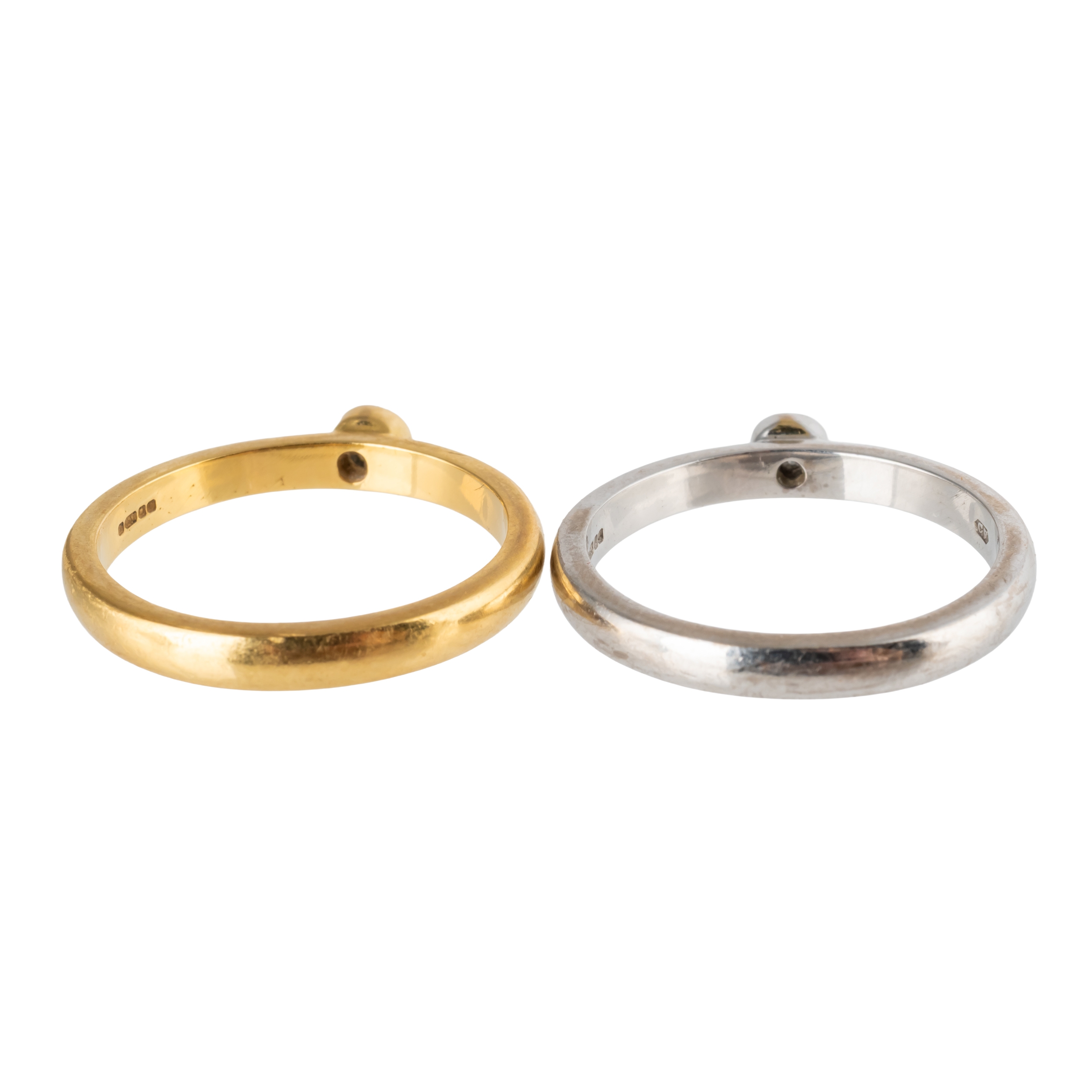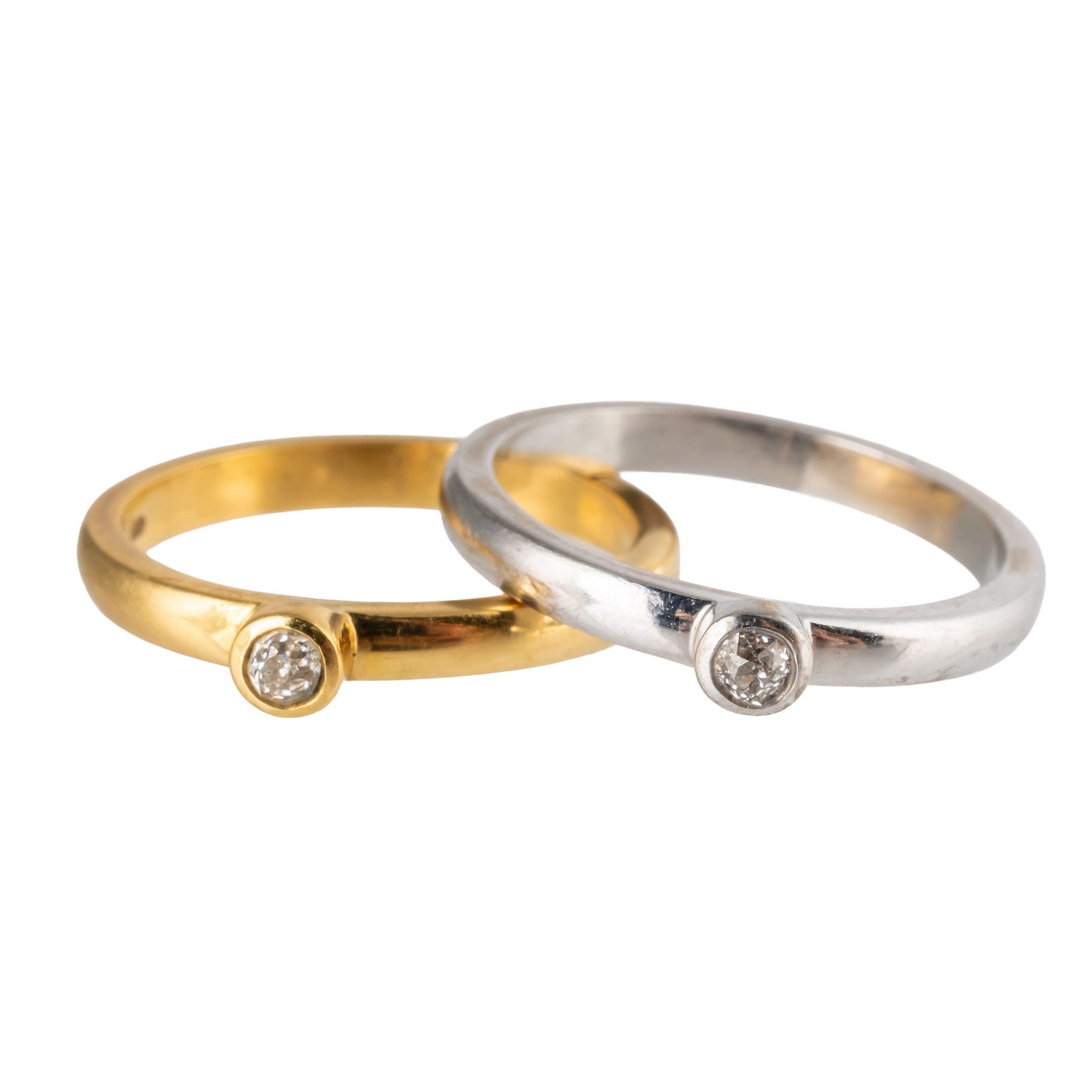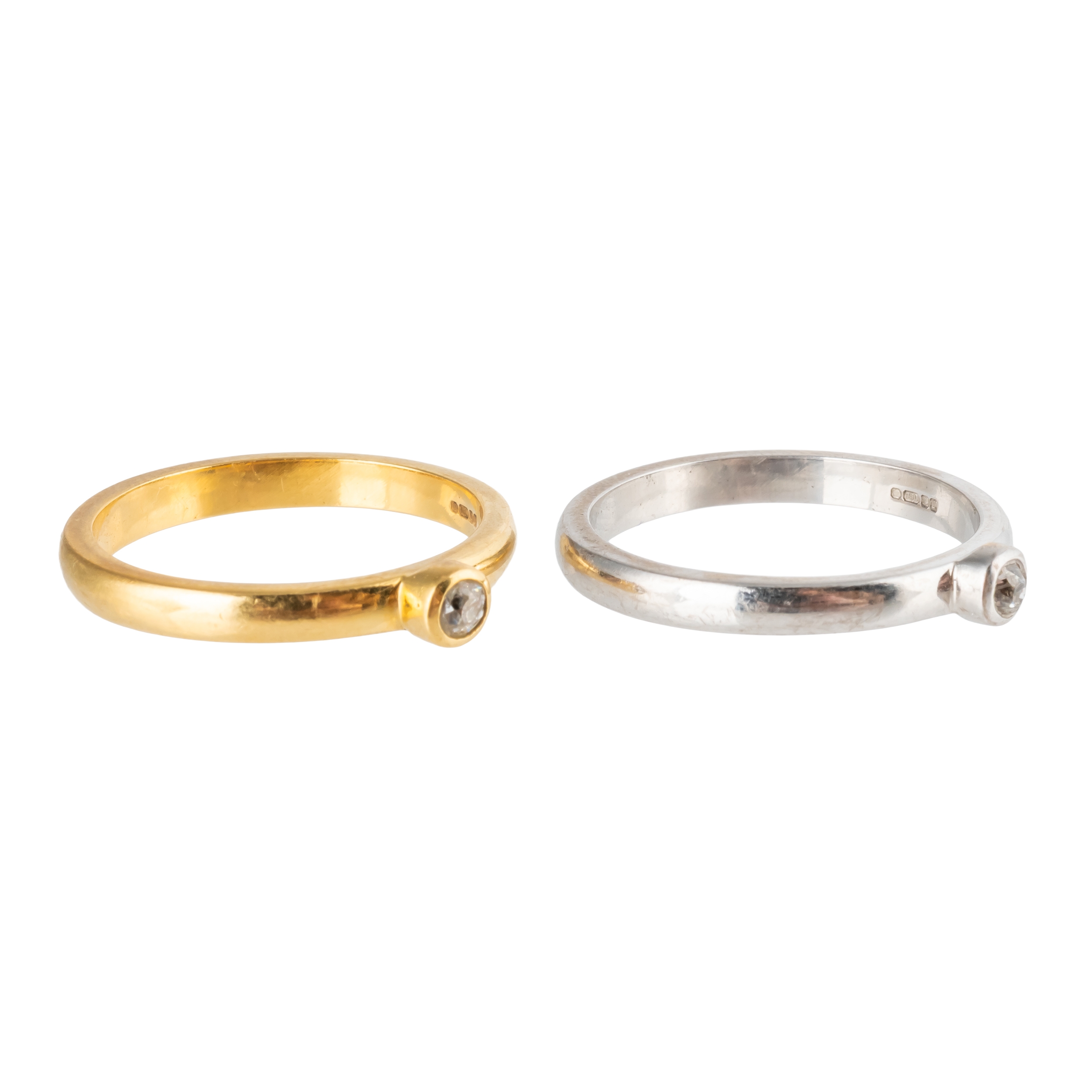 Each bezel set with a round brilliant cut diamond, one in 18ct yellow gold, the other in 18ct white gold, both hallmarked London, 2011, gross weight 6.6 grams
