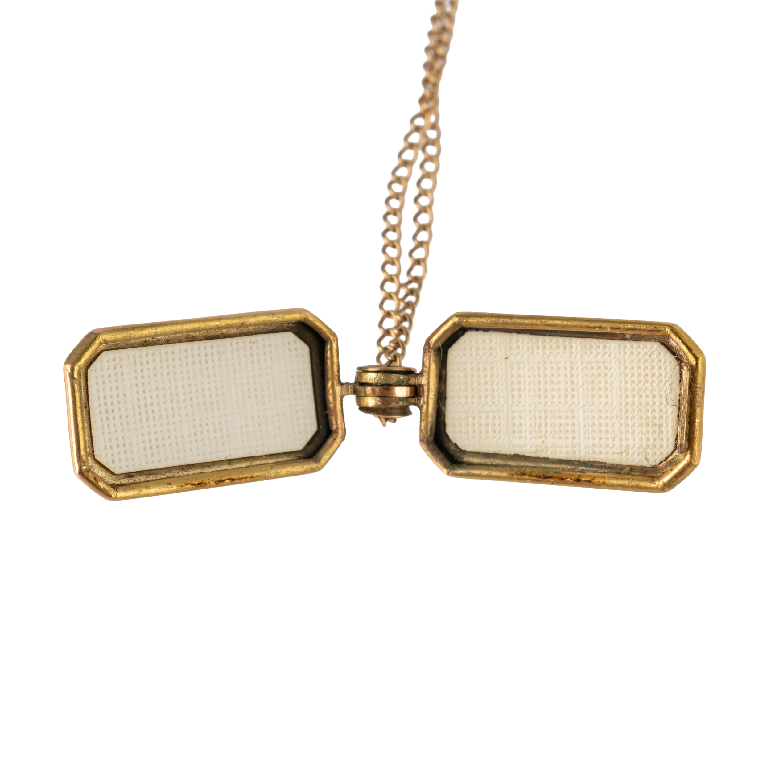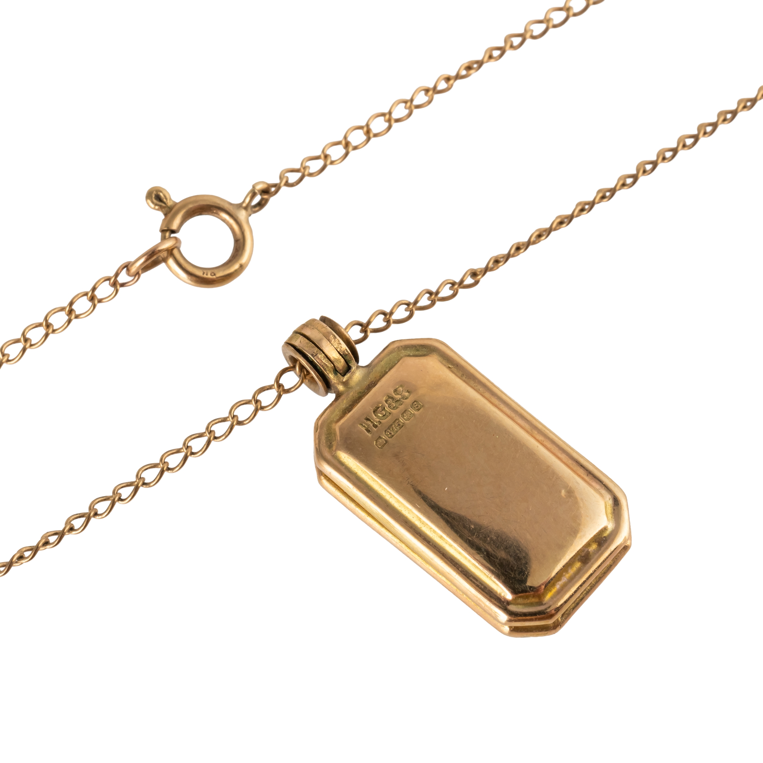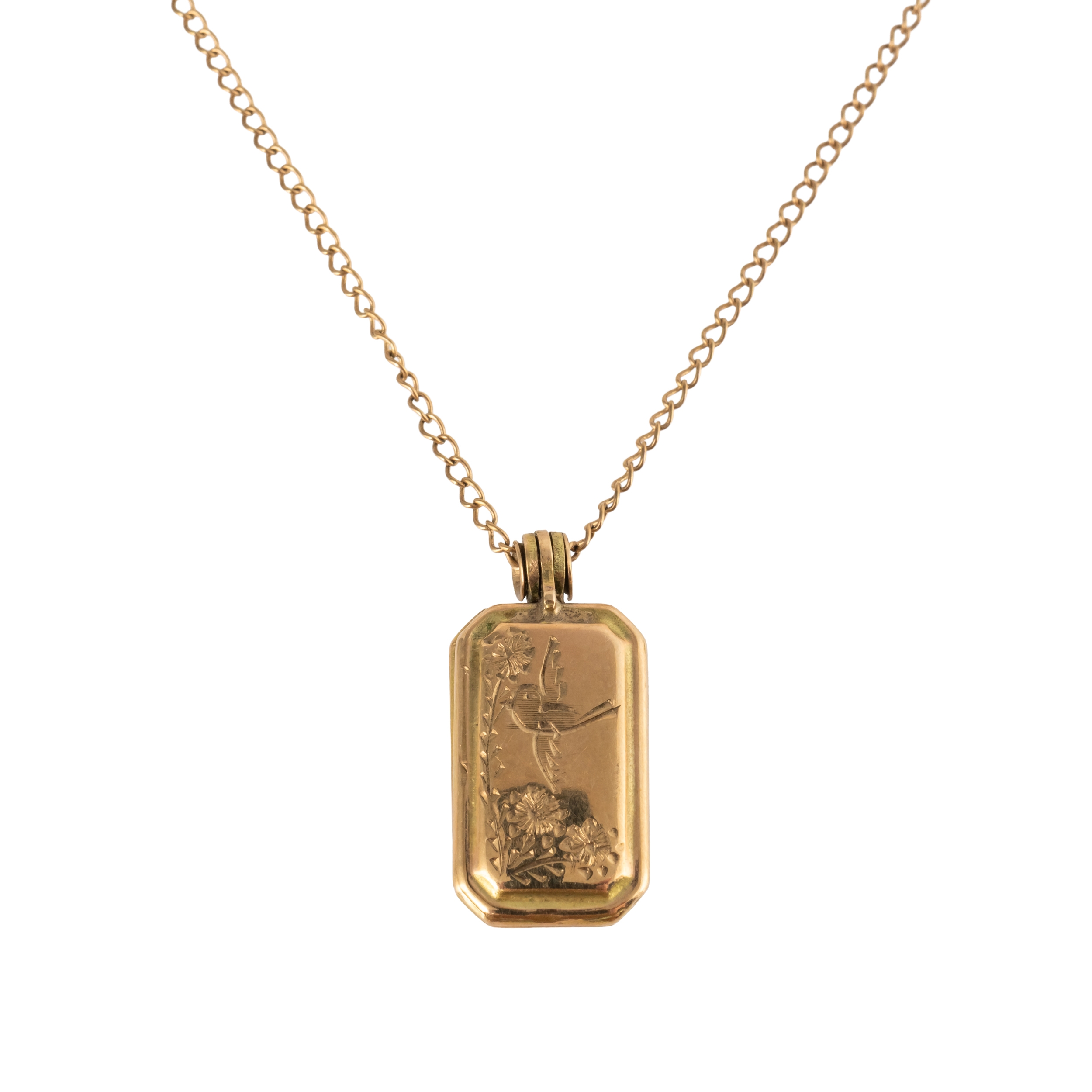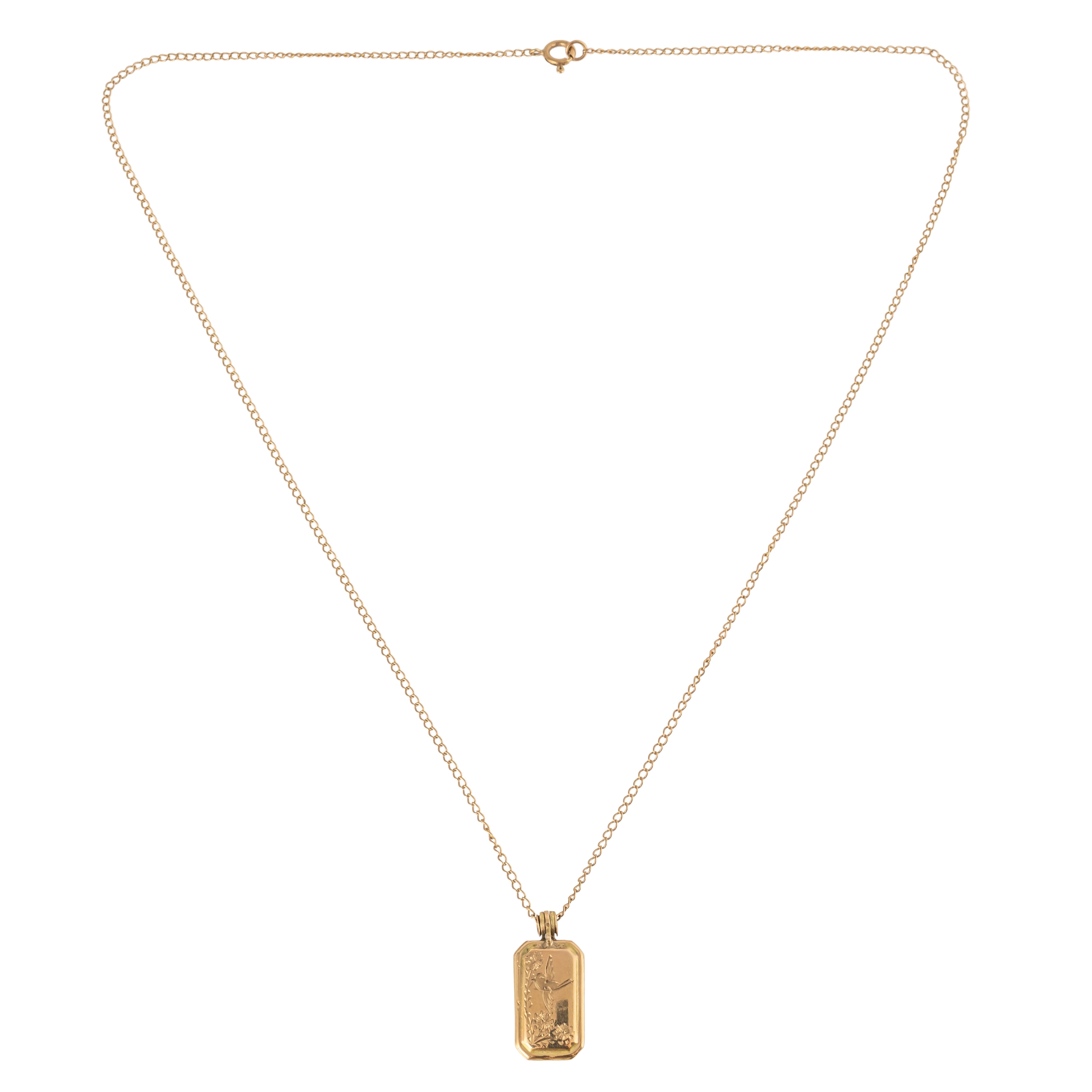 With rectangular pendant locket with bird motif, on a fine chain, gross weight 3.1 grams