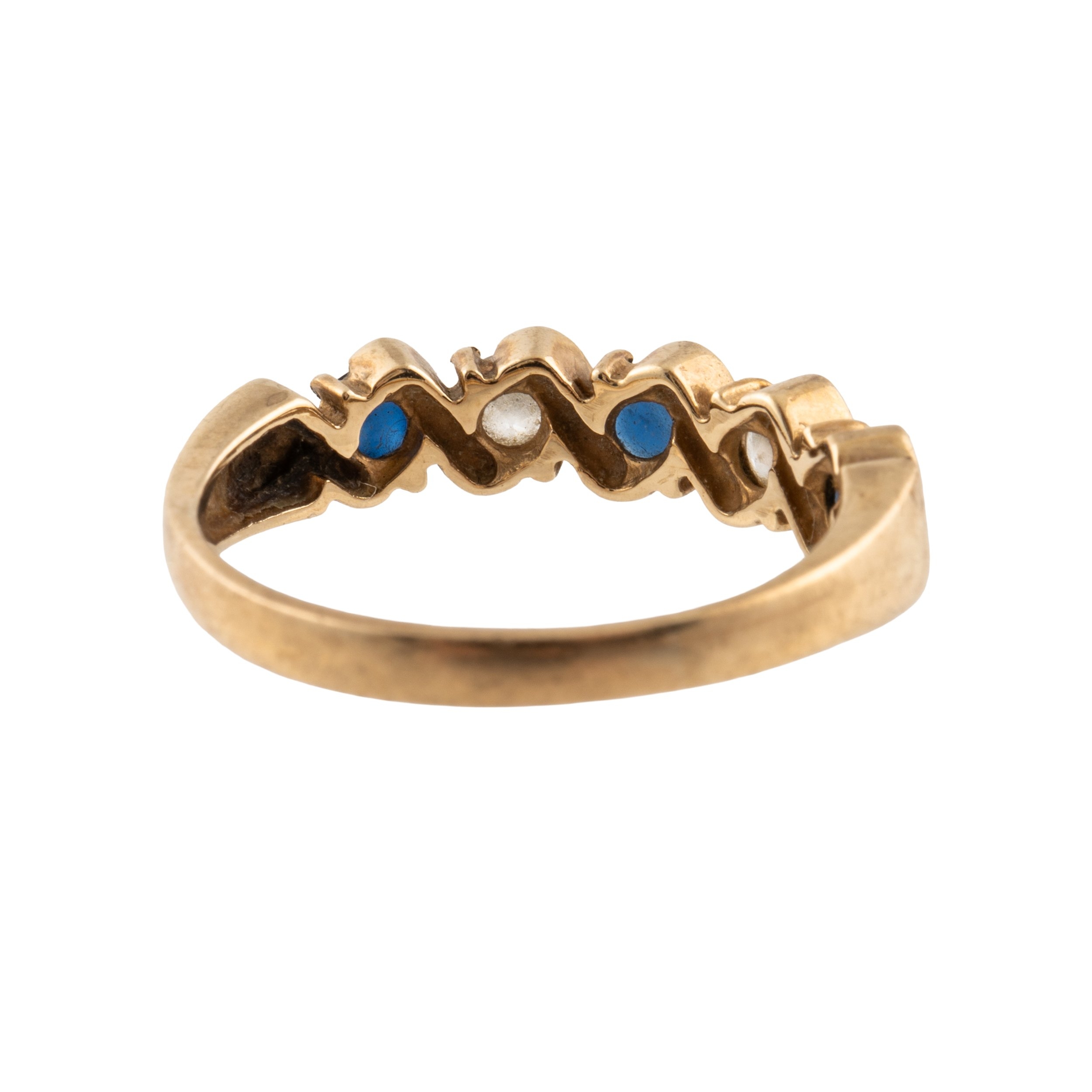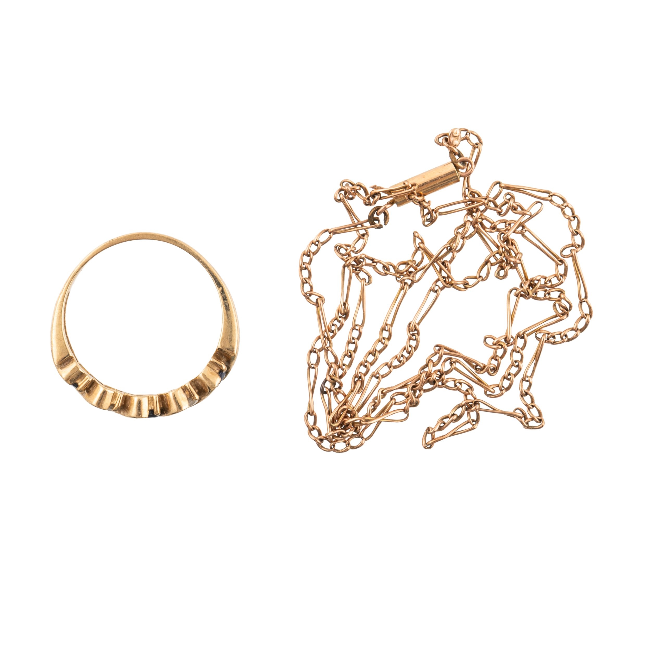 The ring mounted with three round cut sapphires and two round brilliant cut diamonds in 9ct gold, size N, gross weight 2.4 grams, the chain in 9ct gold with barrel clasp, measuring 50cm in length, weight 2.2 grams