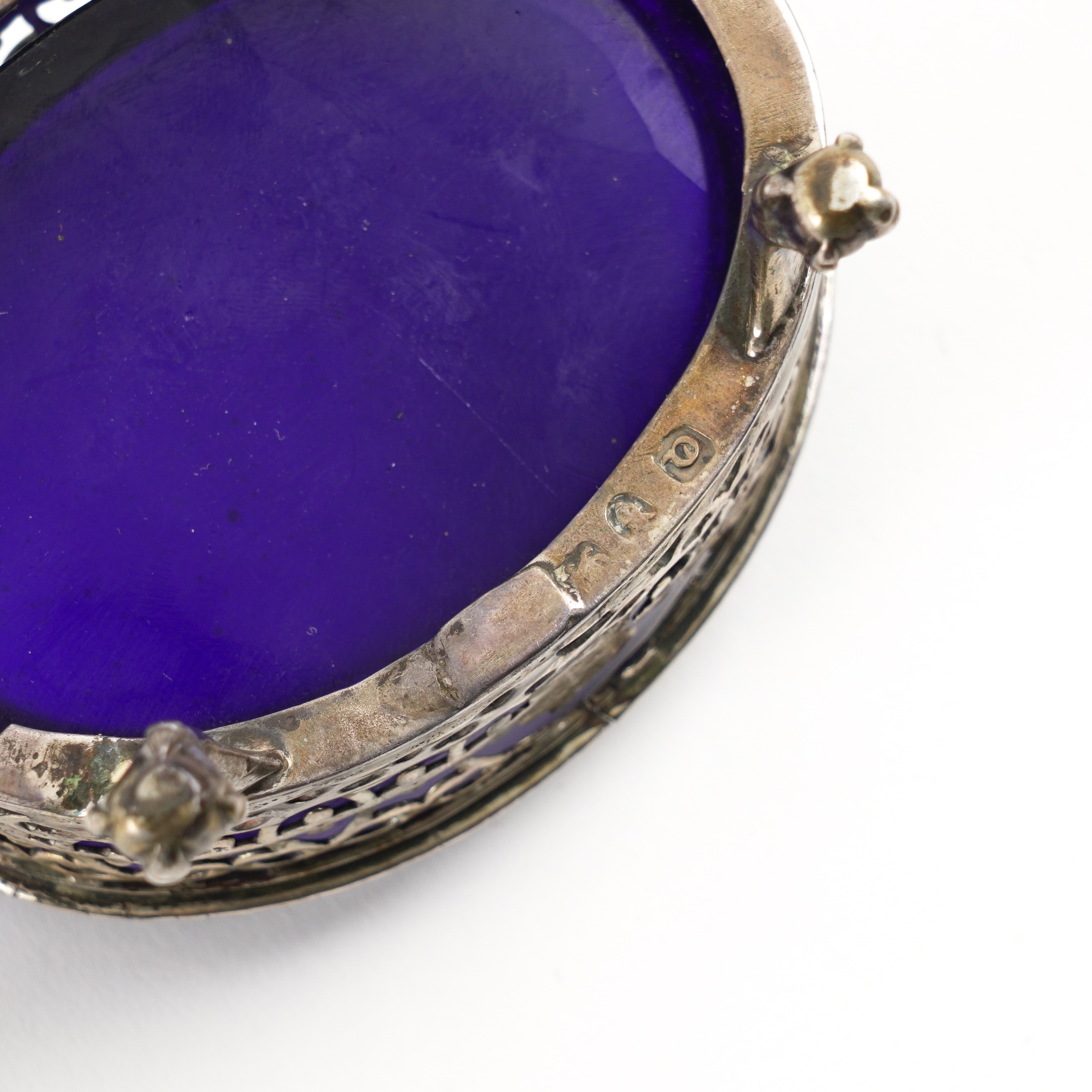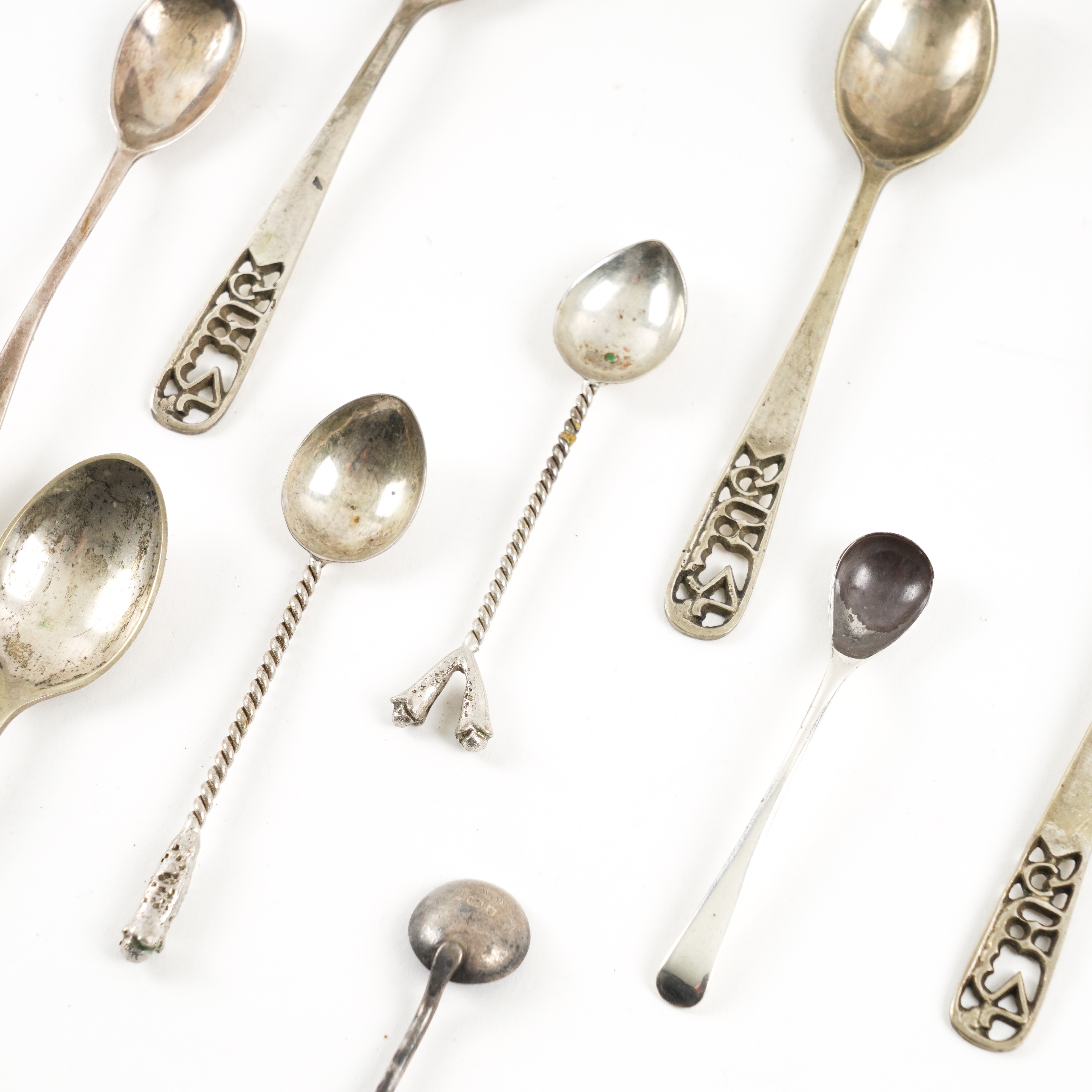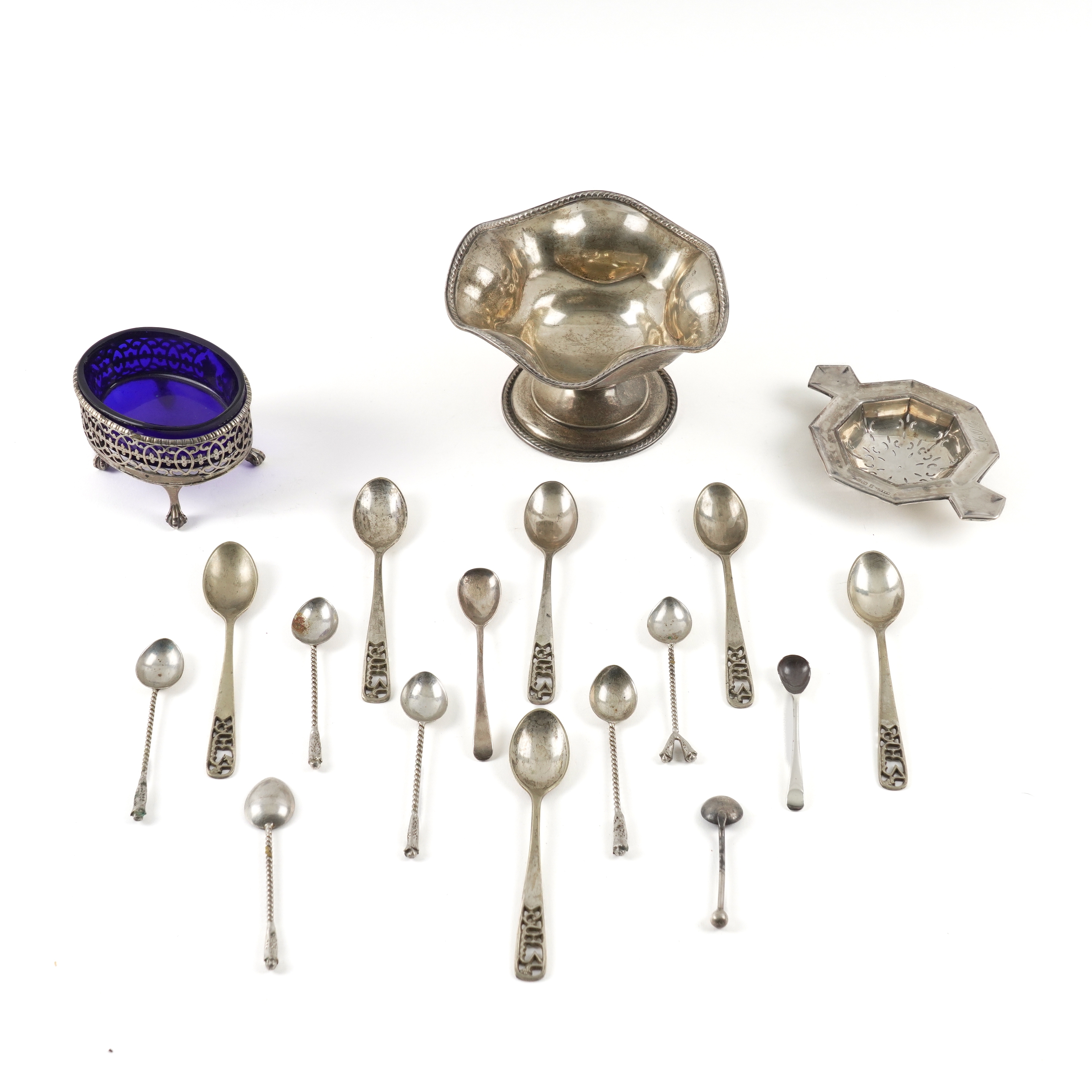 Comprising; a pedestal bonbon dish, Birmingham 1904, a twin handled tea strainer, Birmingham 1922, a Georgian salt, with a blue glass liner and three condiment spoons, combined weight 225 grams, also a set of six teaspoons and six coffee spoons, having spiral stems, both sets probably Asian