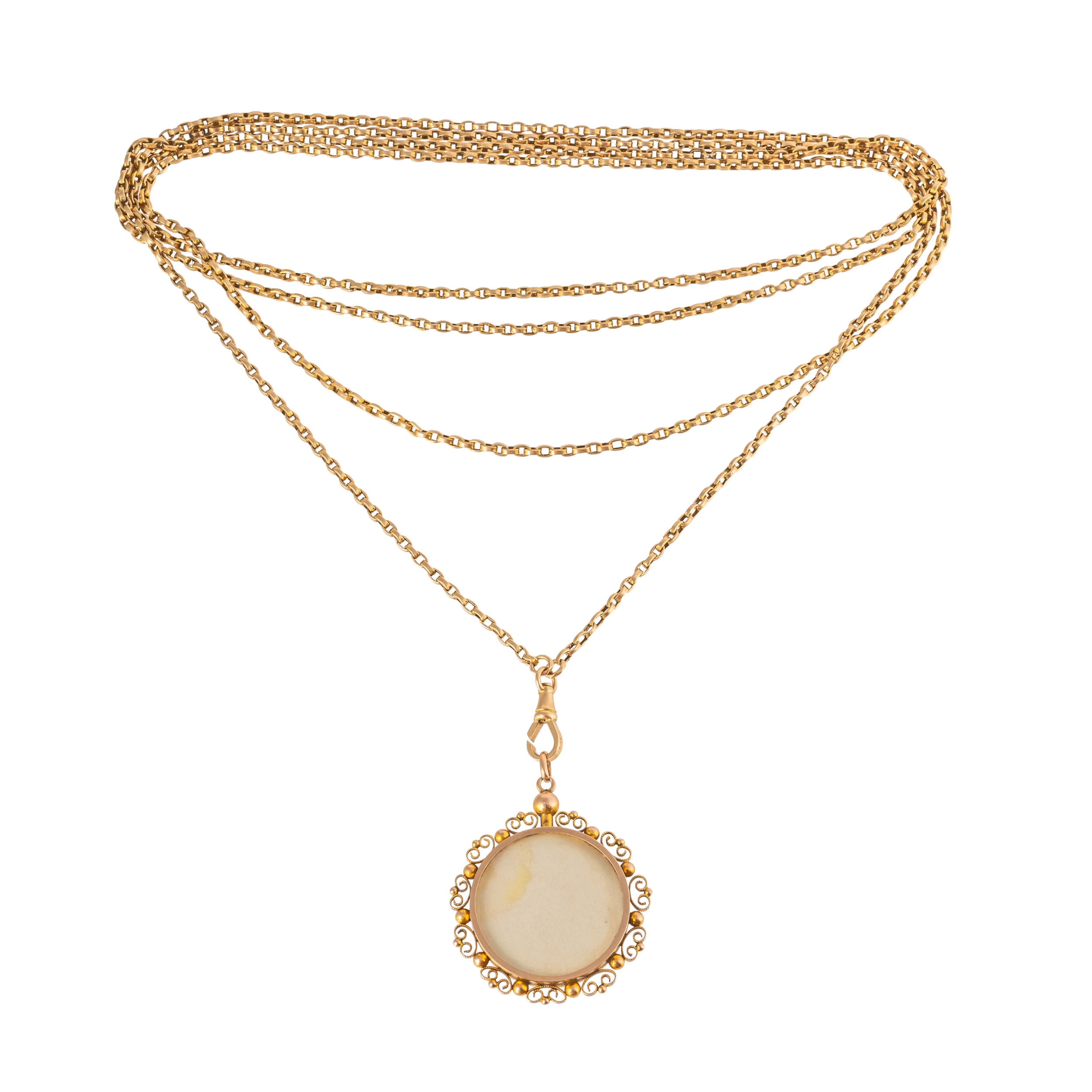 A LONG CHAIN AND CIRCULAR LOCKET