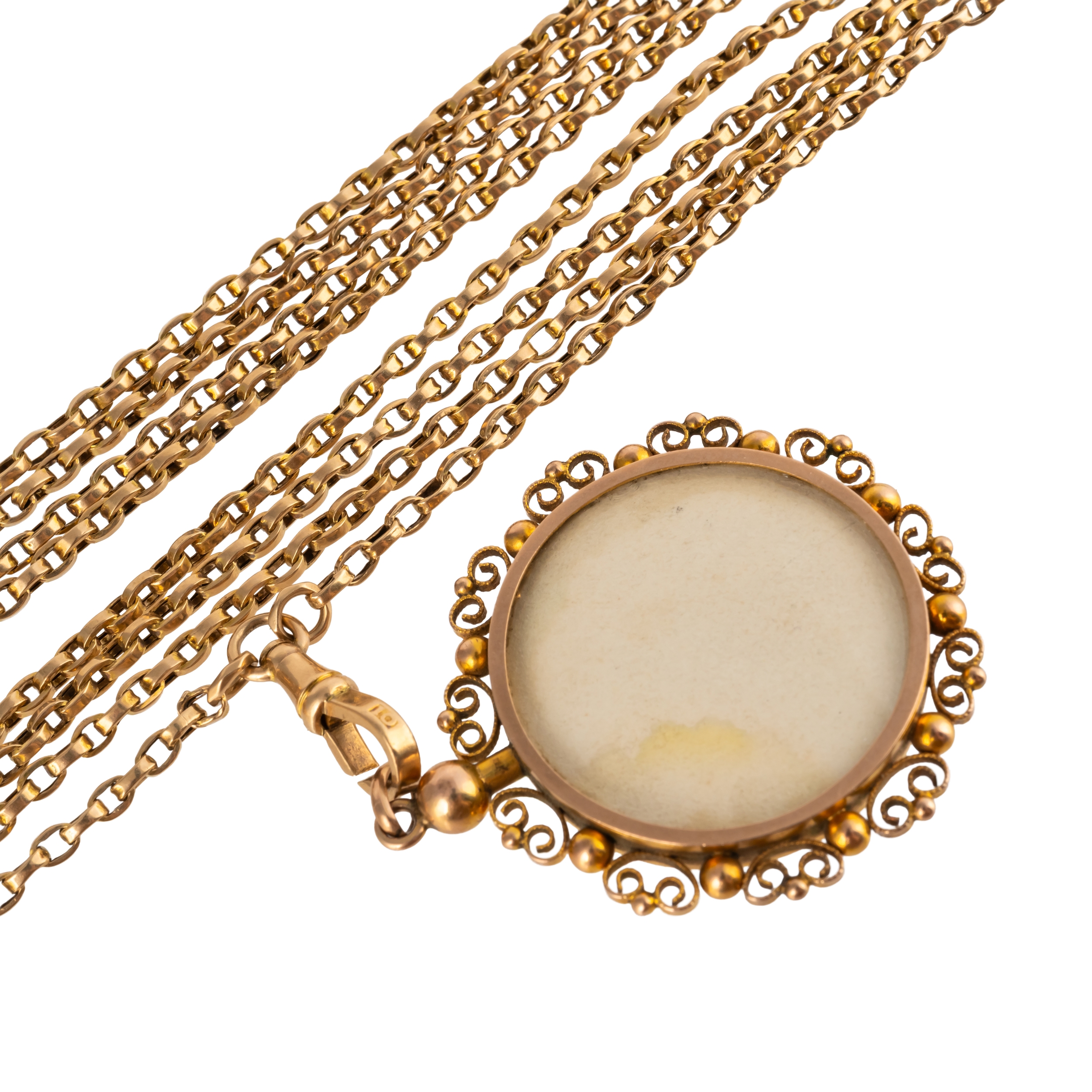 The long chain with swivel clasp termination, marked '10', measuring approximately 160cm in length, with a circular open locket, gross weight 36.3 grams