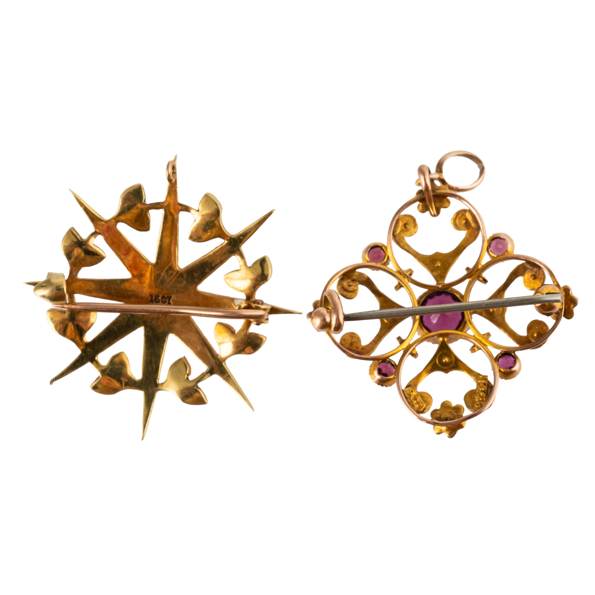 One set with garnets and half pearls marked for 9ct, gross weight the other of star from set with half pearls, marked 15ct, gross weight 5.1 grams
