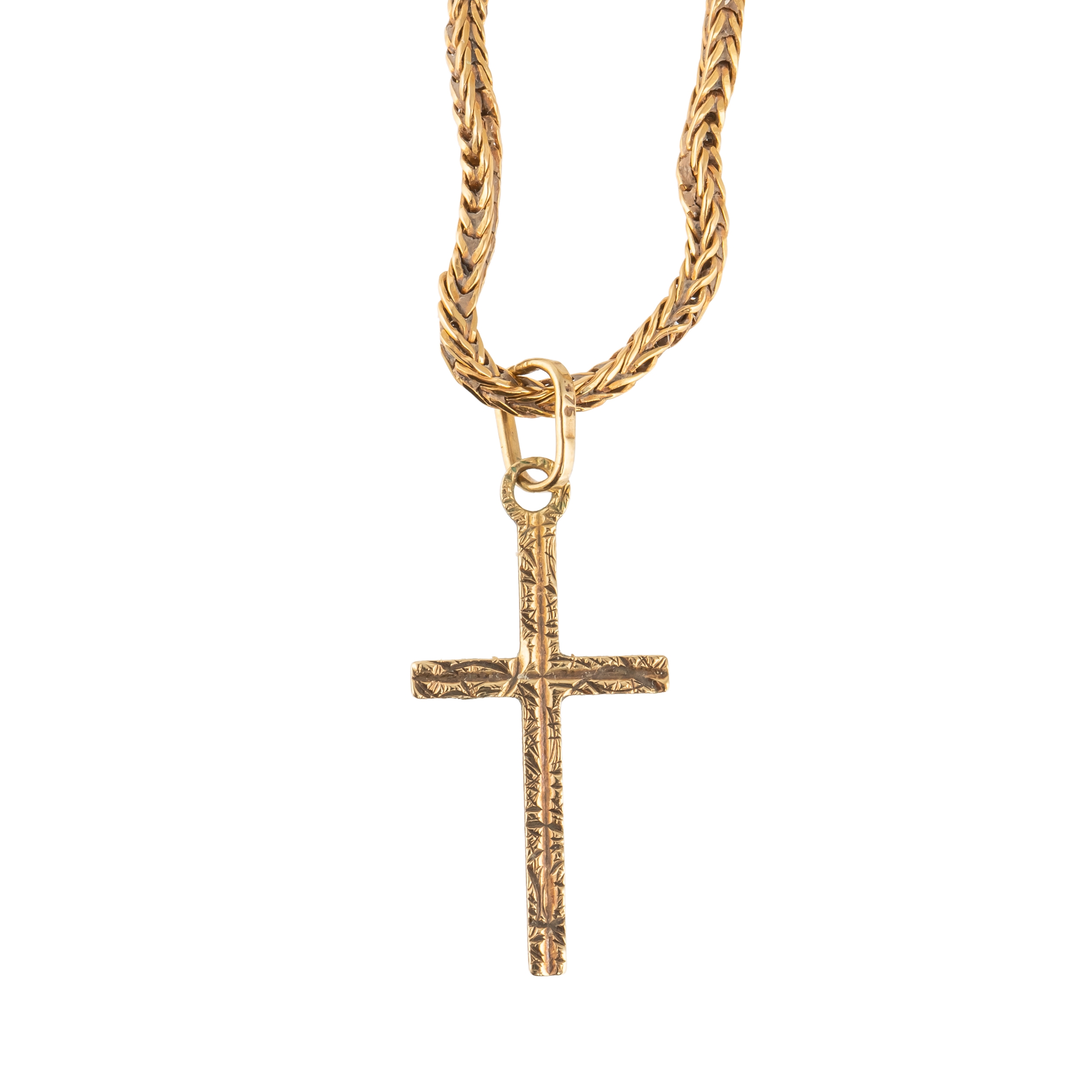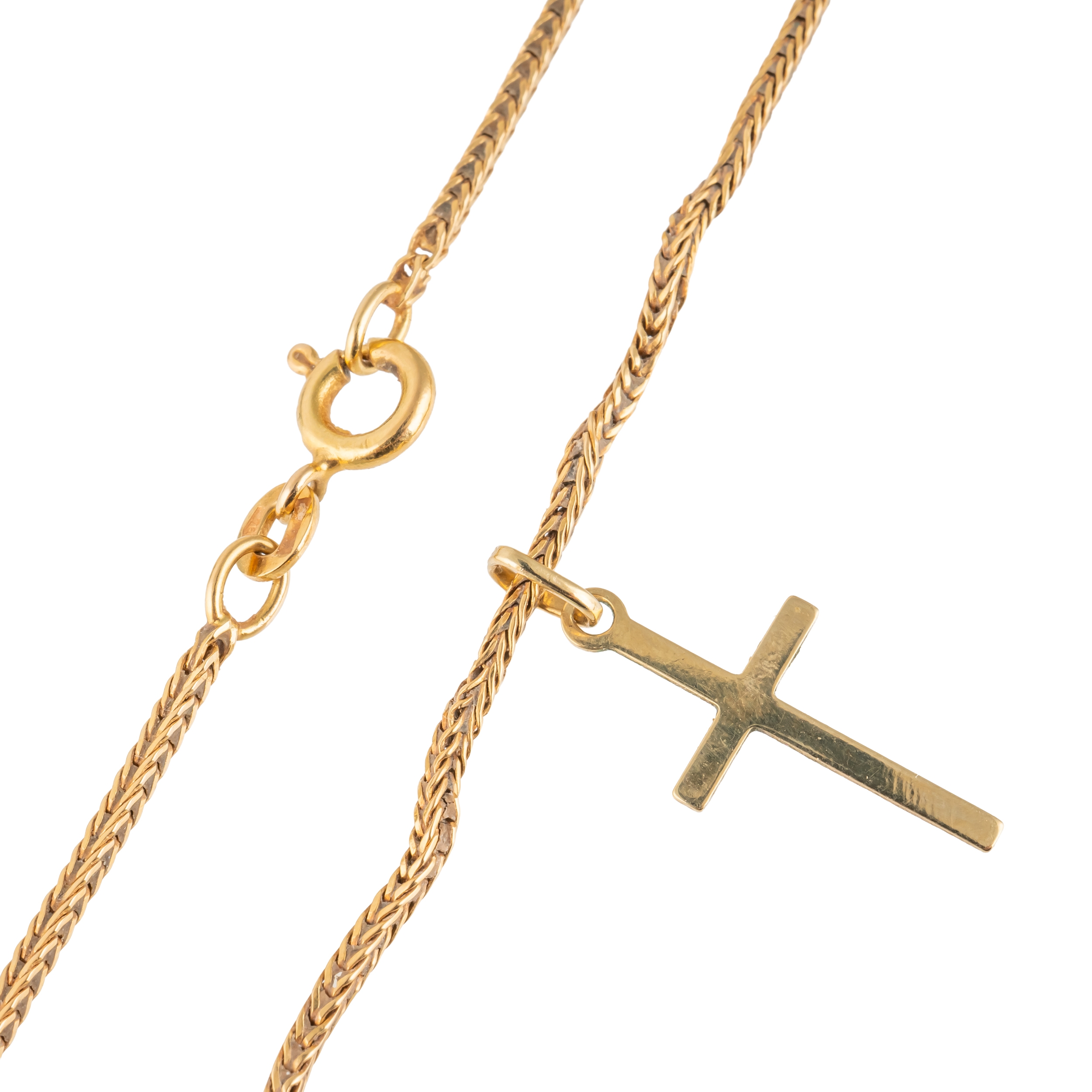 With an 18ct gold box snake chain measuring approximately 50cm in length, suspending a 9ct gold fine cross pendant, gross weight 6.6 grams