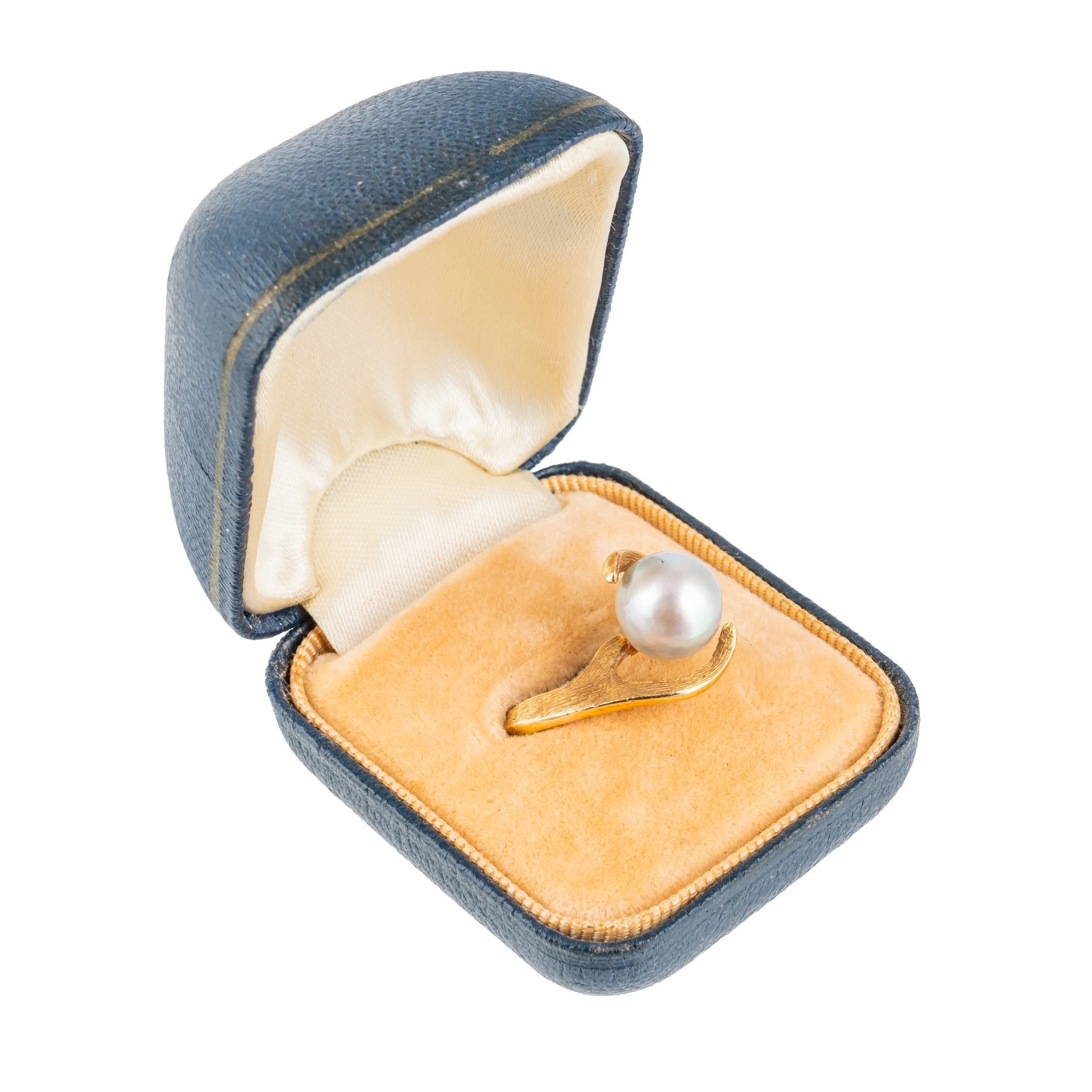 Mounted with a 8.2mm pearl, with a textured gold ring surface, with rubbed gold mark, size M, gross weight 3.5 grams, with a box
