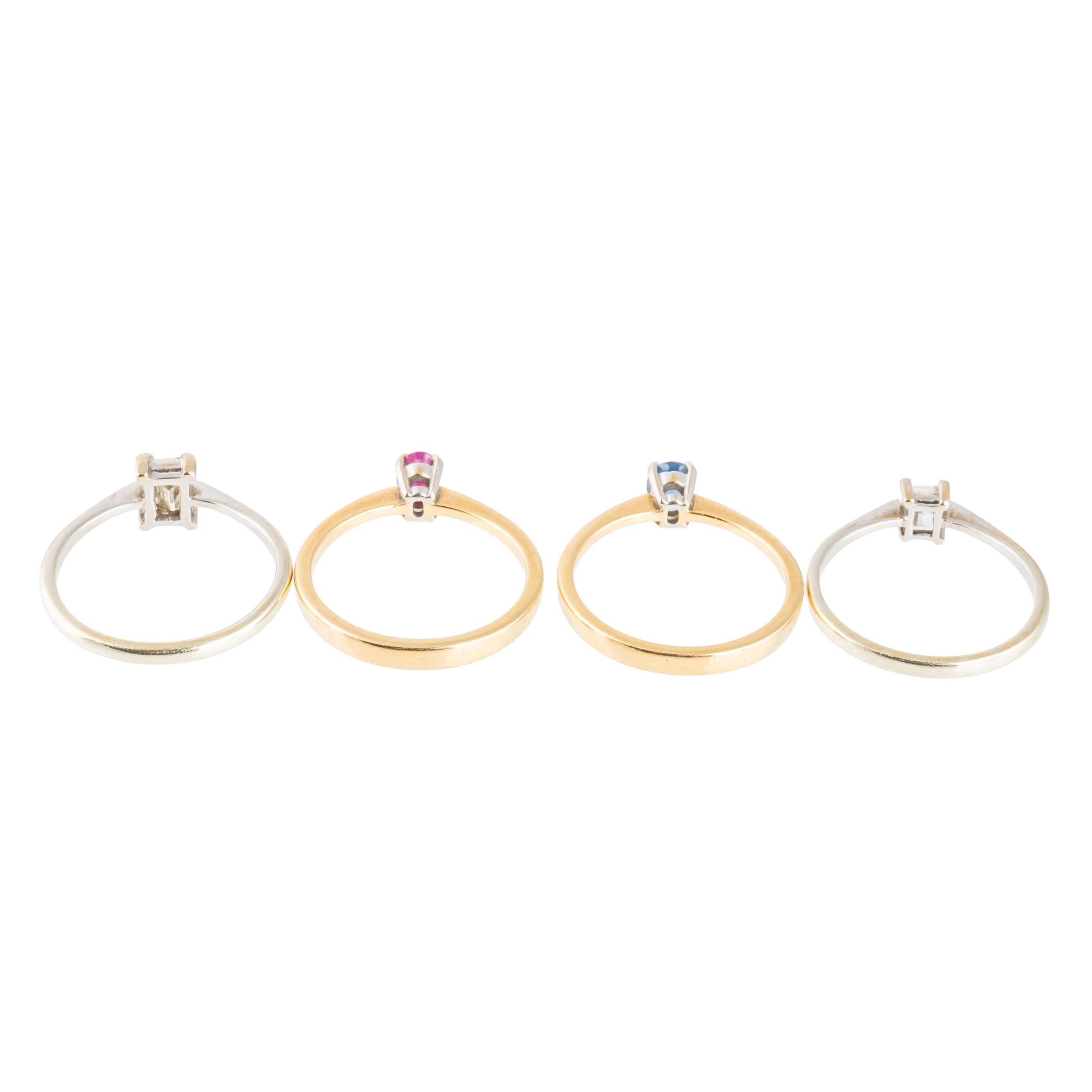 Comprising; an 18ct gold oval cut sapphire ring, an 18ct gold oval cut ruby ring, both size M, combined weight 5.2 grams, a 9ct white gold step cut diamond ring, size M and a 9ct white gold step cut diamond ring, size L½, combined weight 3.3 grams