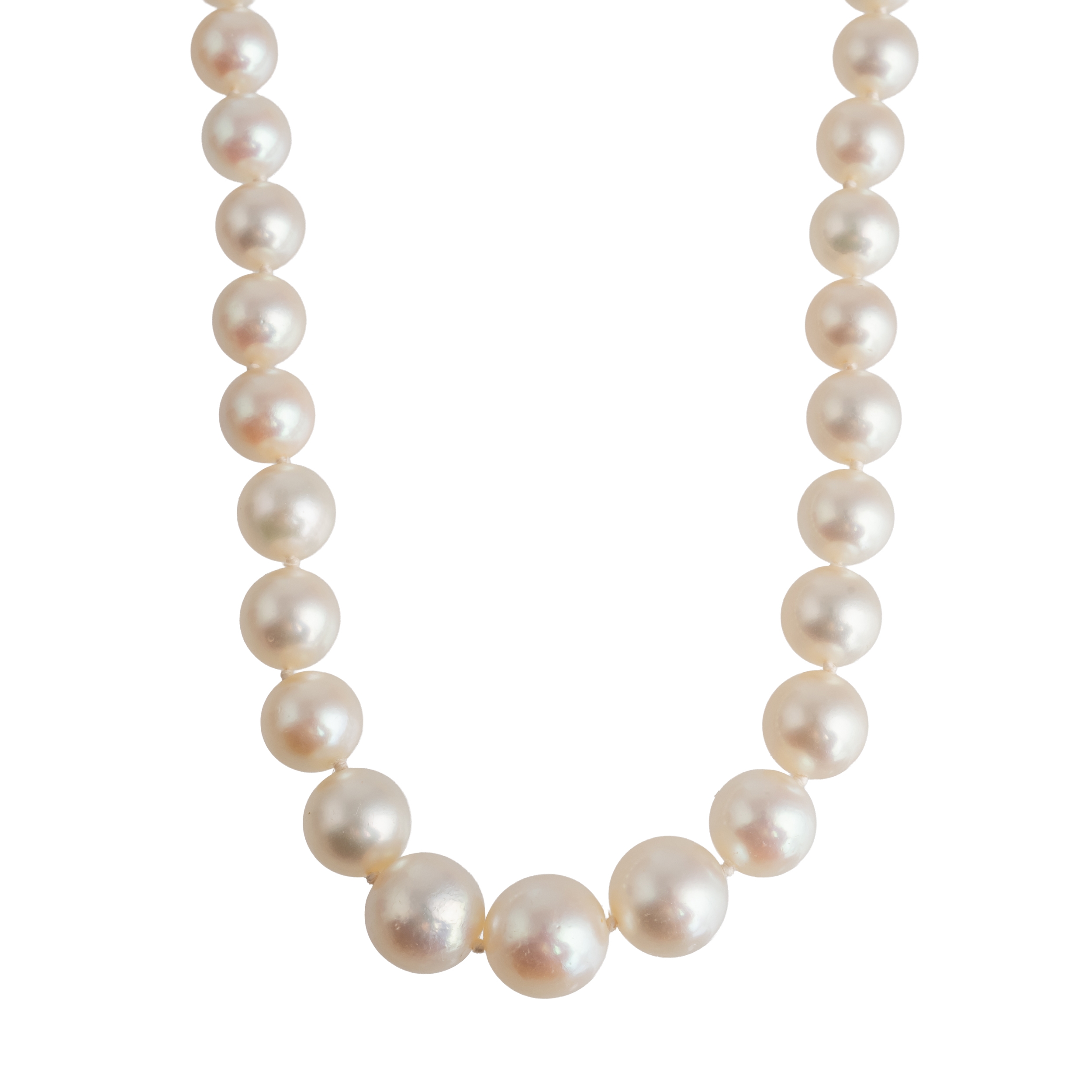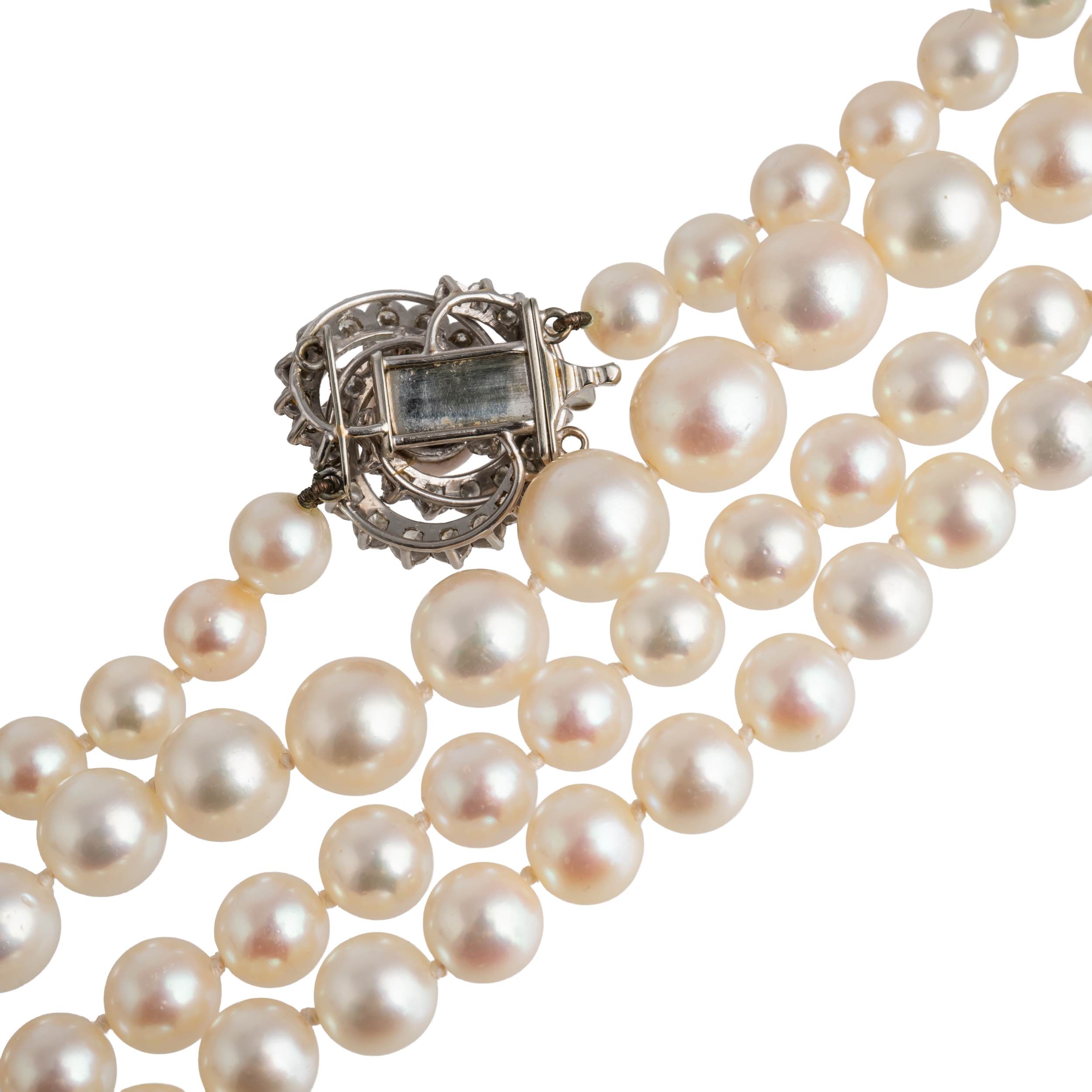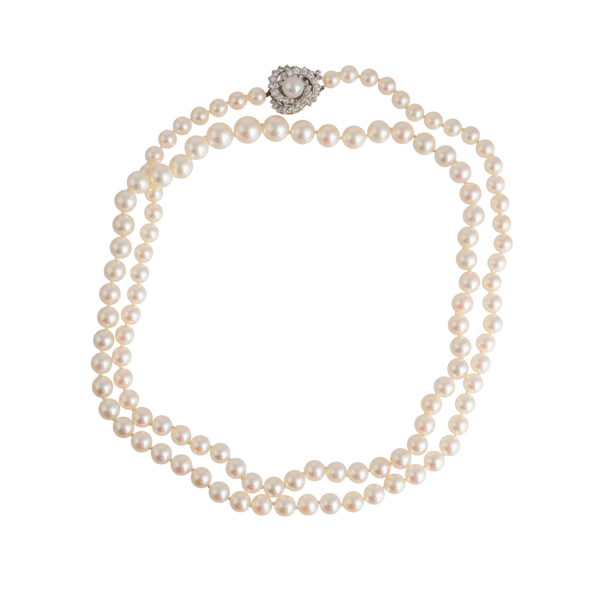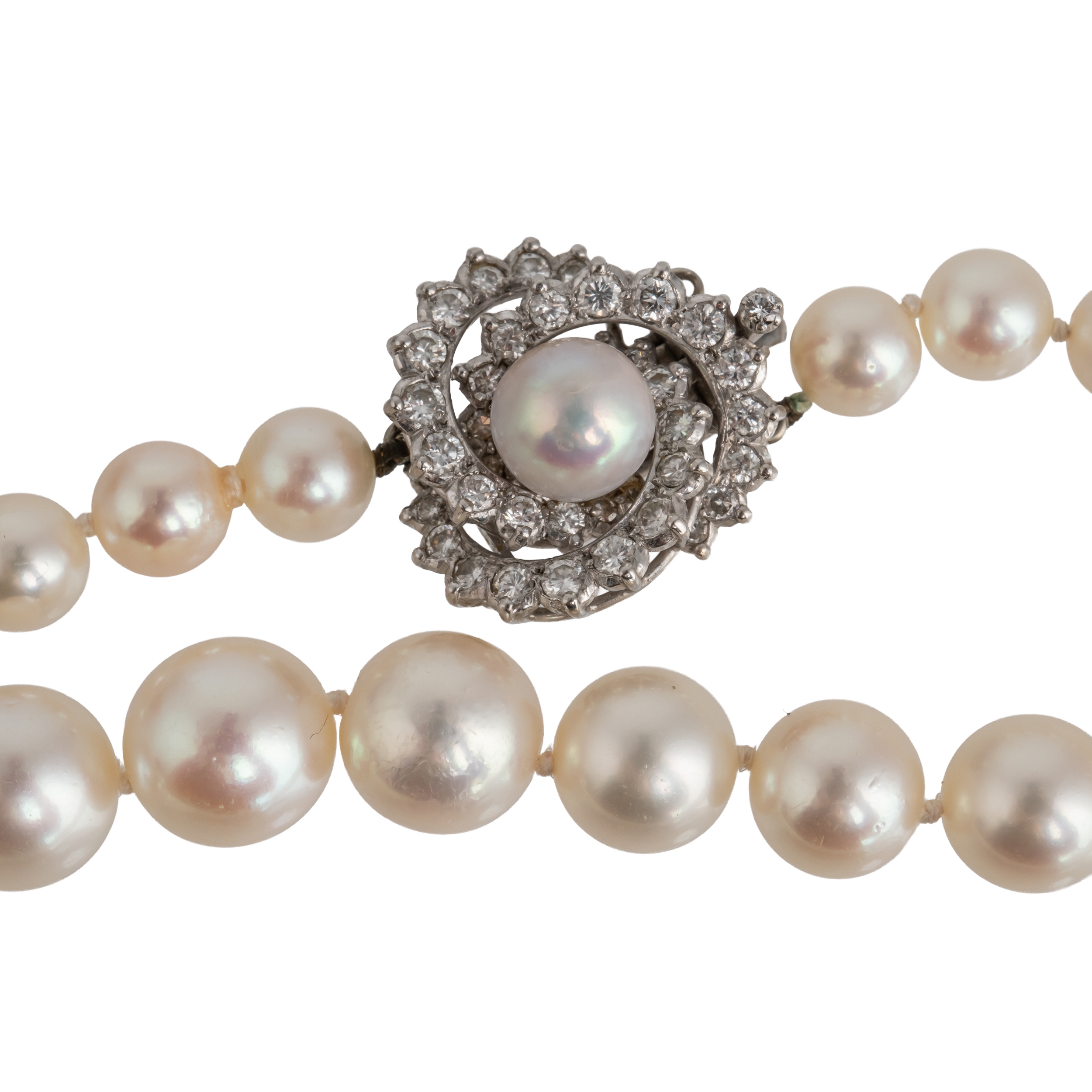 The pearls graduating in size from 6.4mm to 9.6mm, on a diamond and pearl clasp in unamarked white metal, measuring 90cm in length