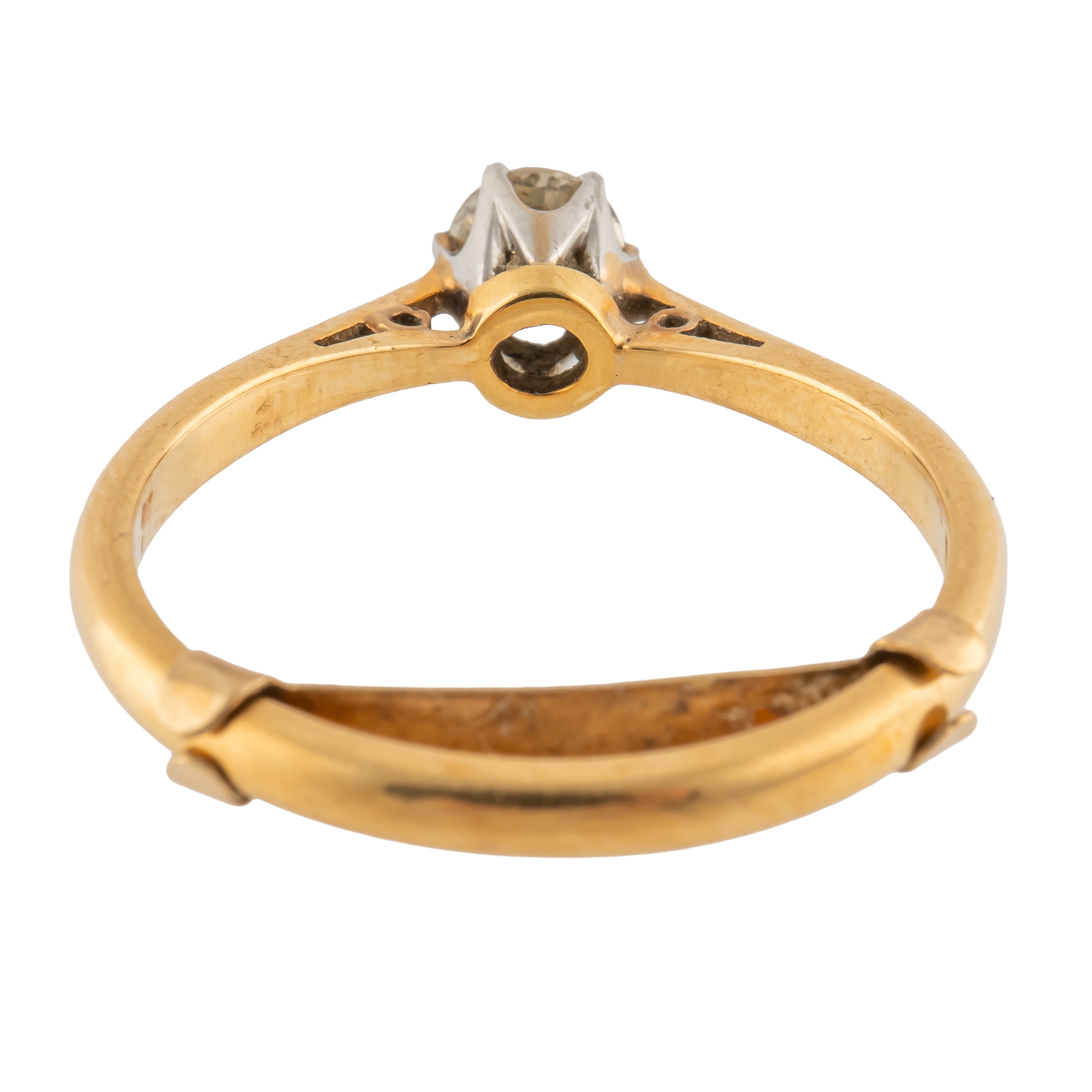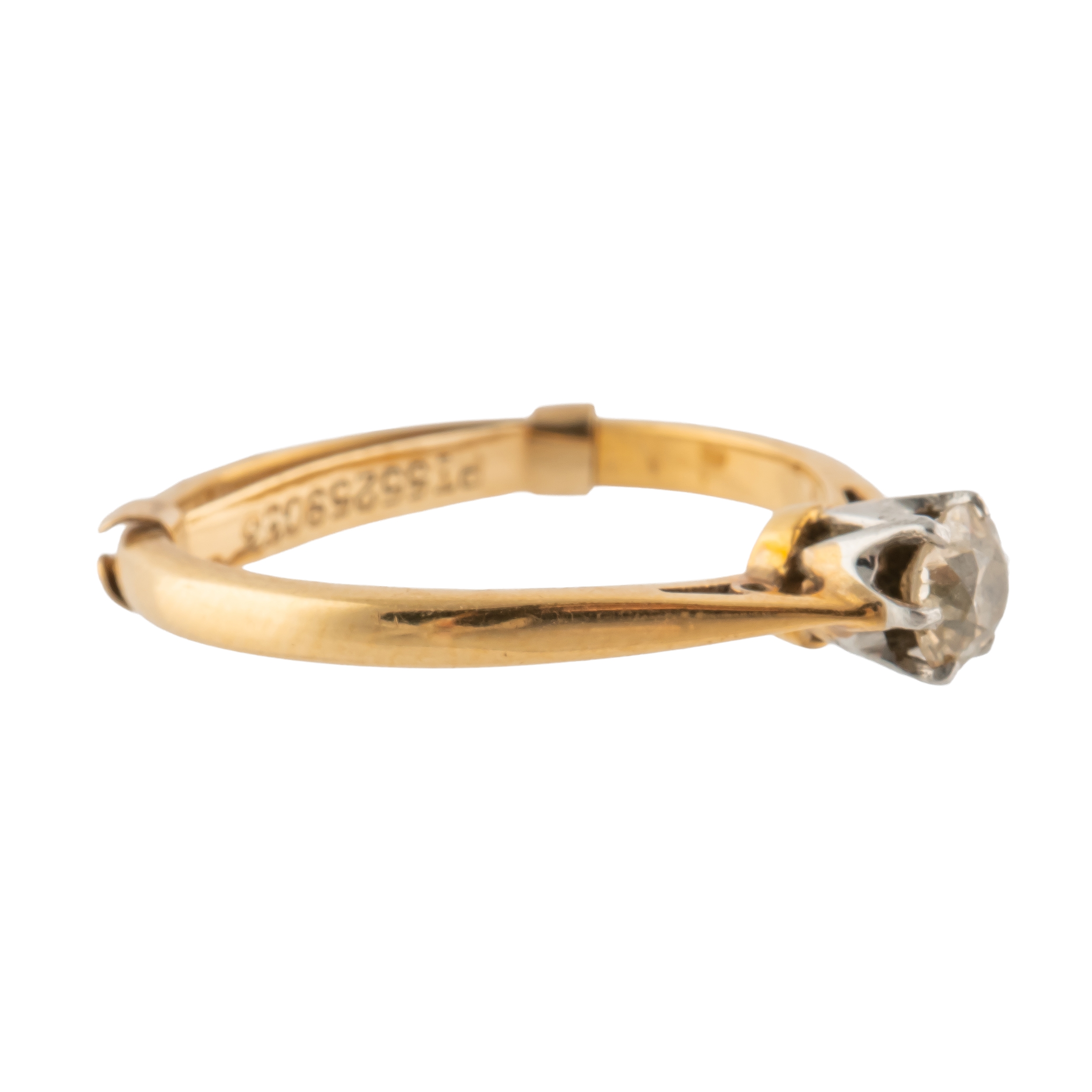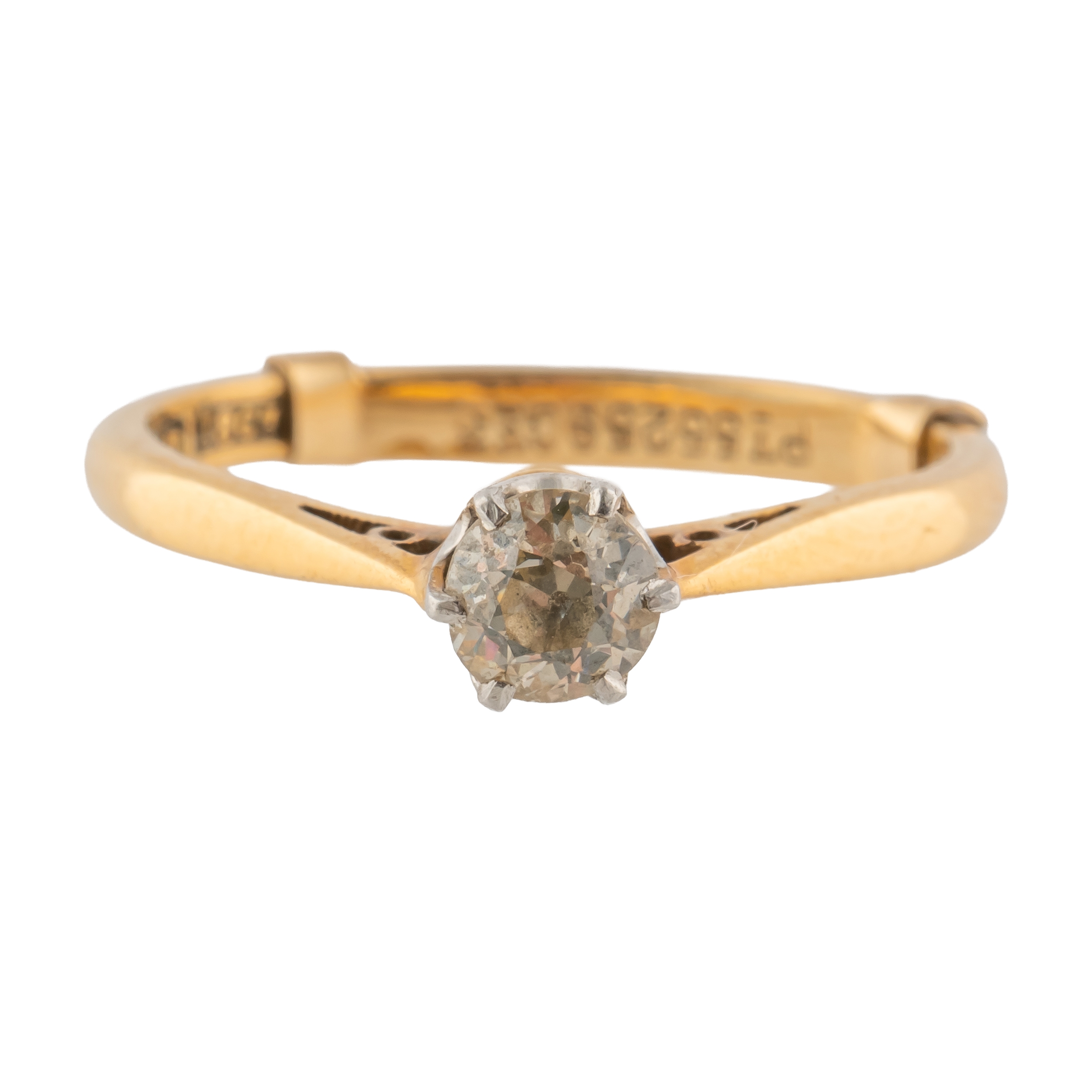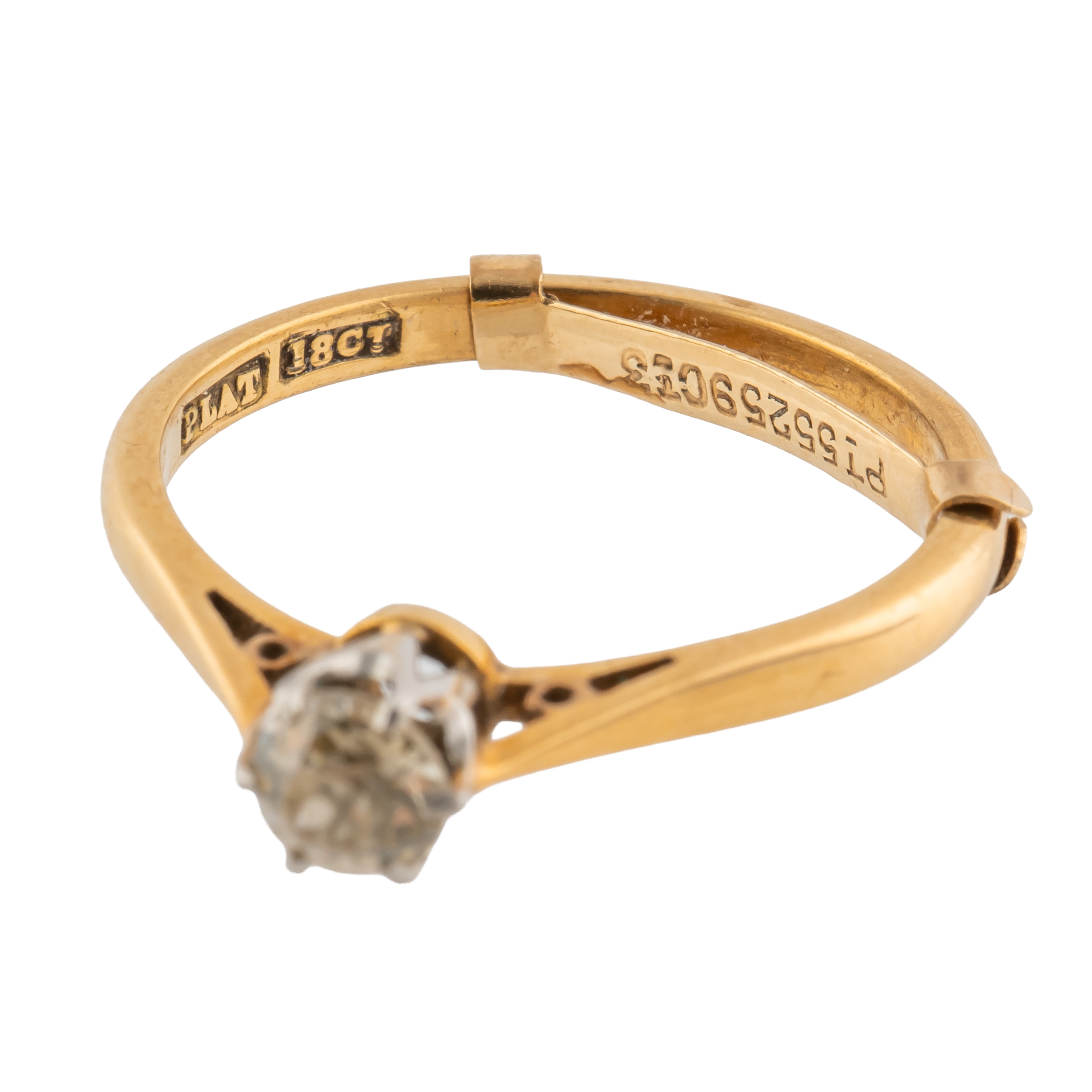 Claw set with an old cut diamond, the band marked for 18ct gold and platinum, size L with a safety clip, gross weight 2.3 grams