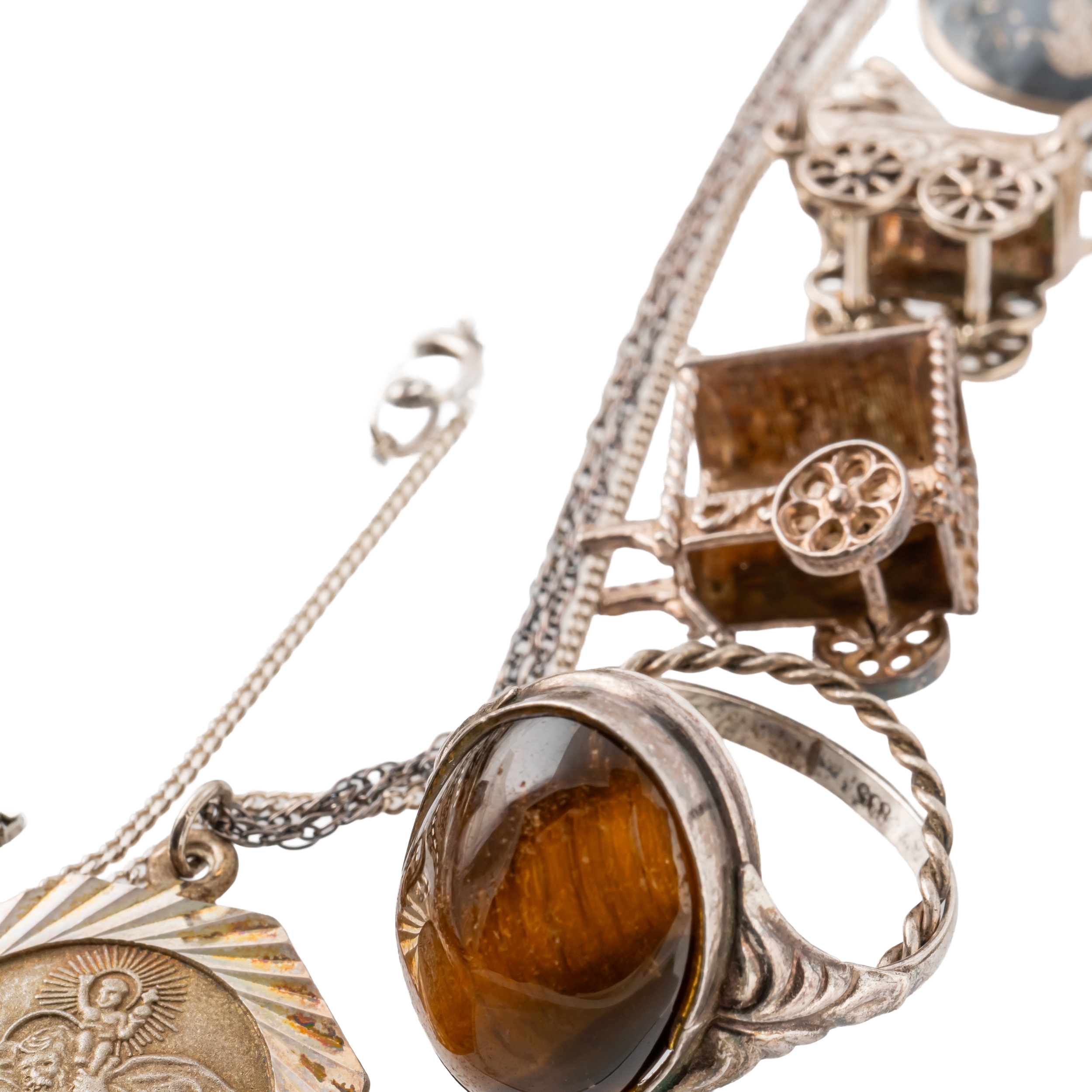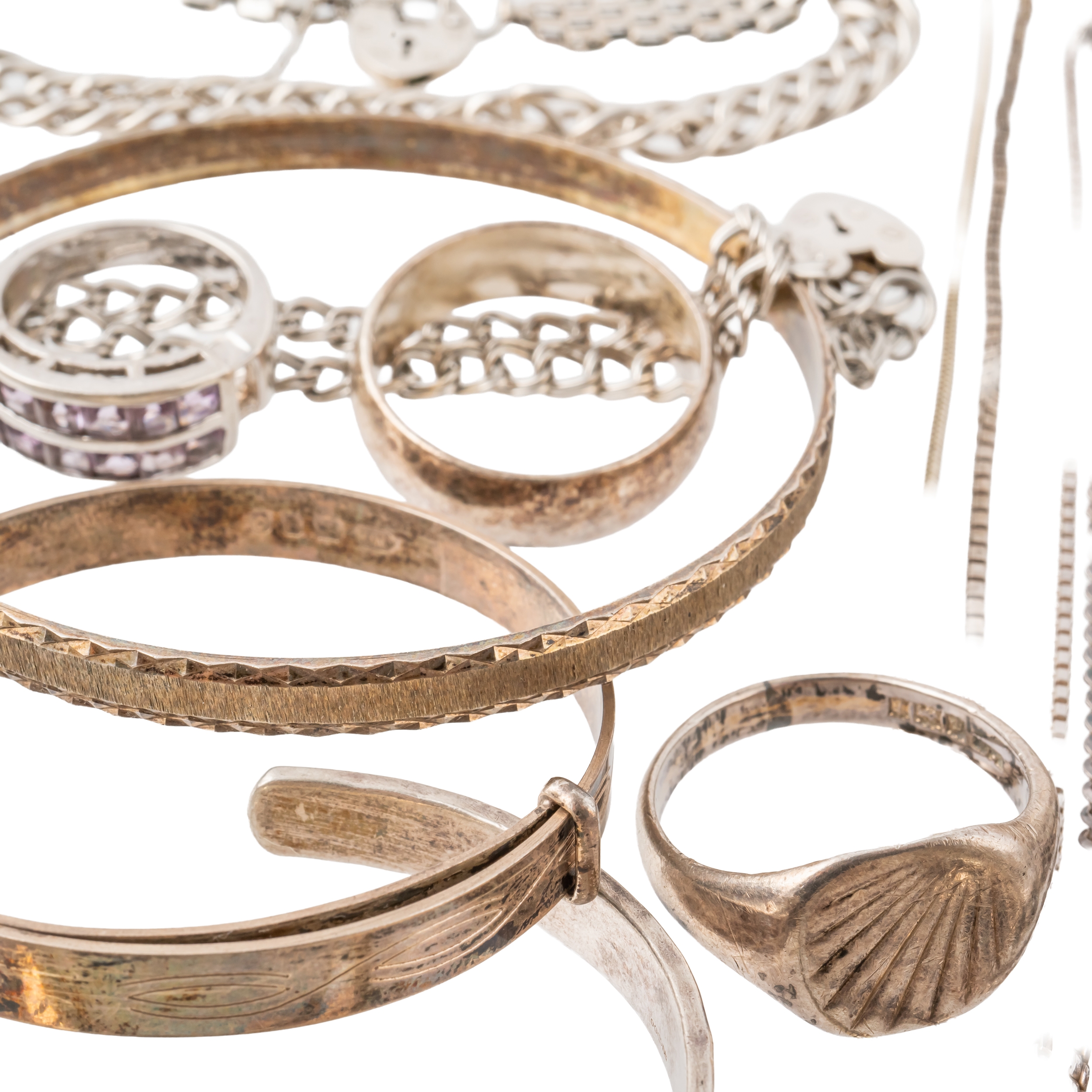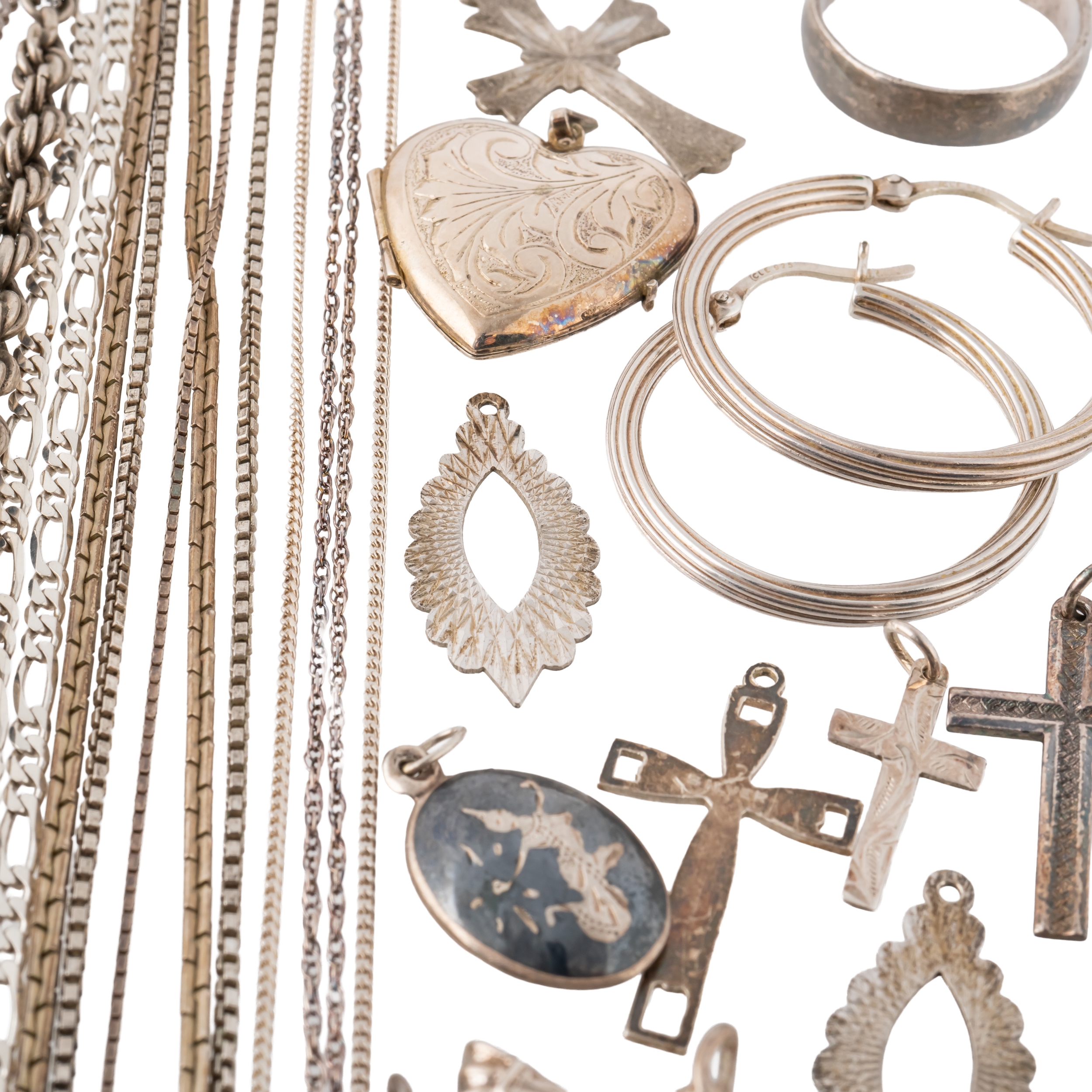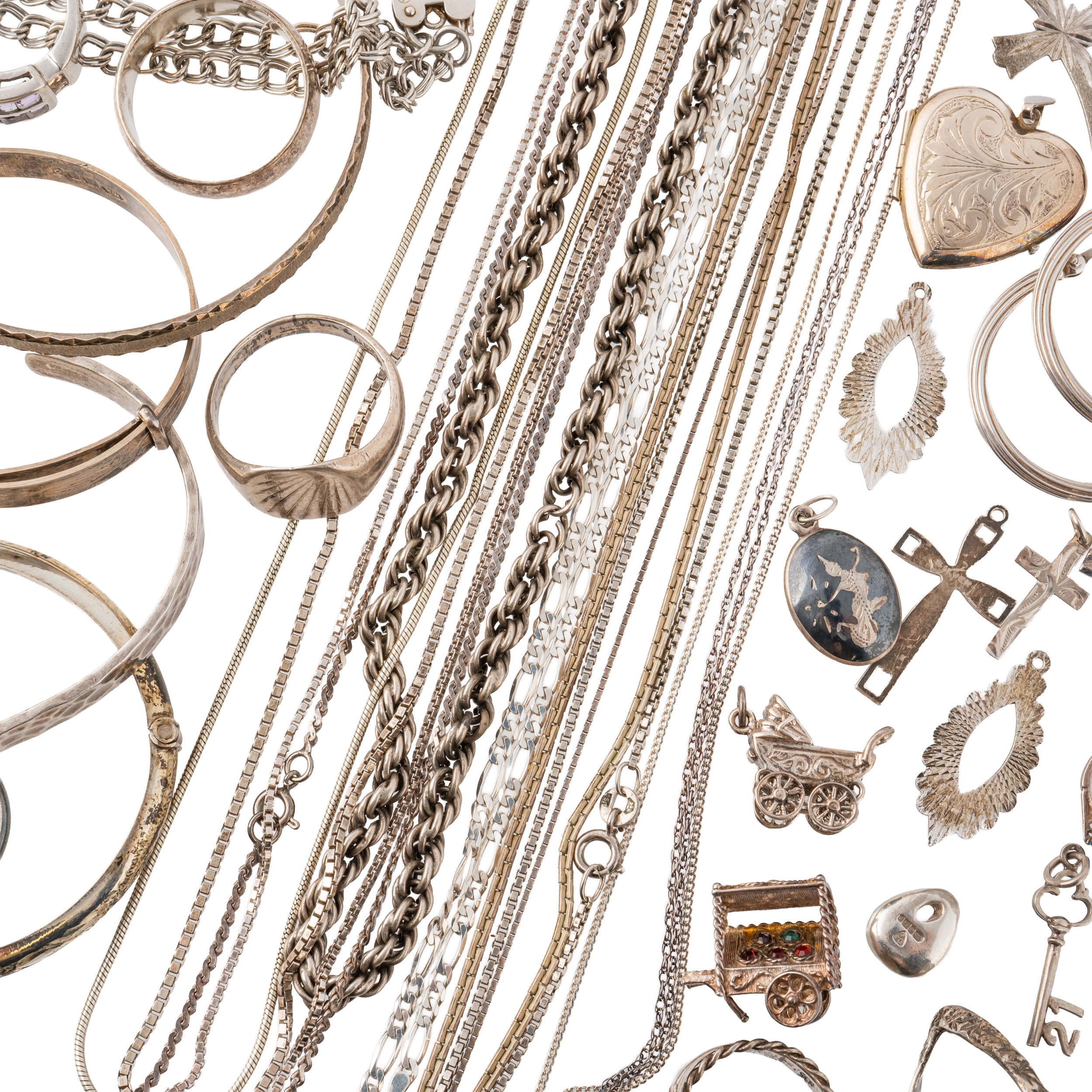 Comprising; four bangles, four bracelets, eight rings, a St Christopher pendant with a neck chain, a heart shaped pendant locket, two pairs of earrings, ten pendants and charms and ten neckchains, combined gross weight 179 grams