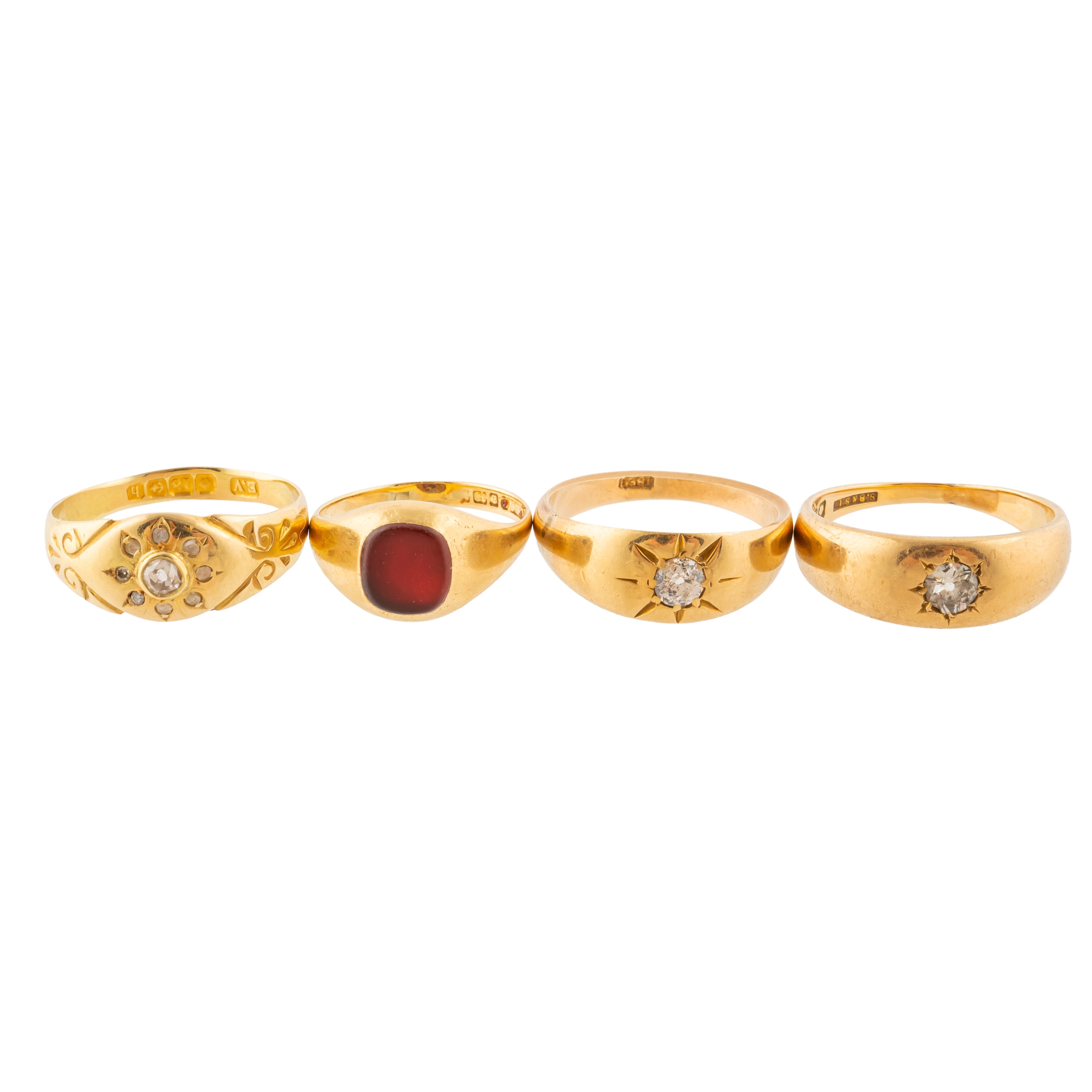 Including two gypsy set with old cut diamonds, both size N, one signet mounted with carnelian size I and one with a floral design of old cut diamonds, size N, gross weight 15.5 grams
