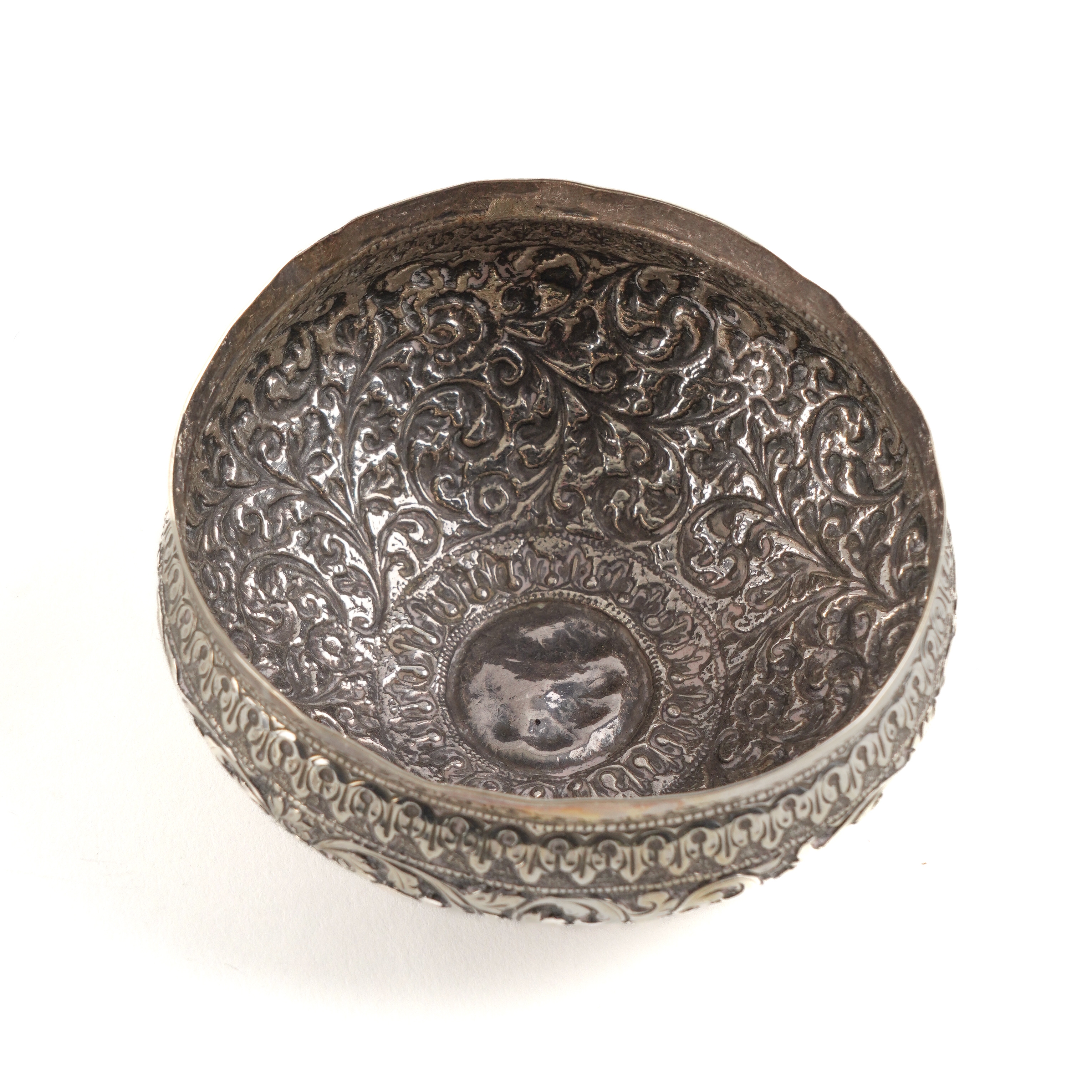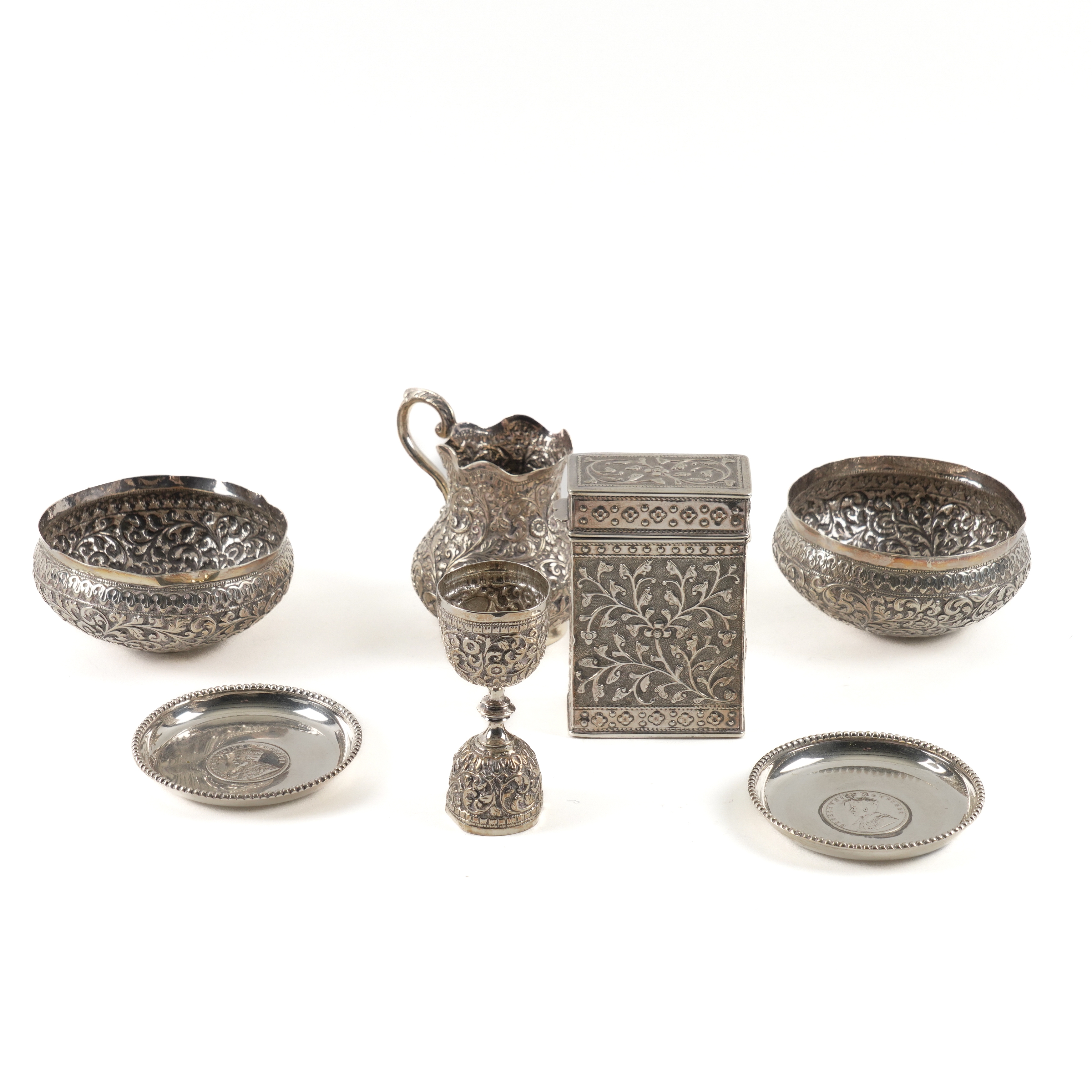 Comprising; a rectangular hinge lidded box, wooden lined within, a baluster shaped jug, a twin ended egg cup, a pair of bowls and two dishes, each mounted with an India one rupee coin, combined weight 495 grams, excluding the box