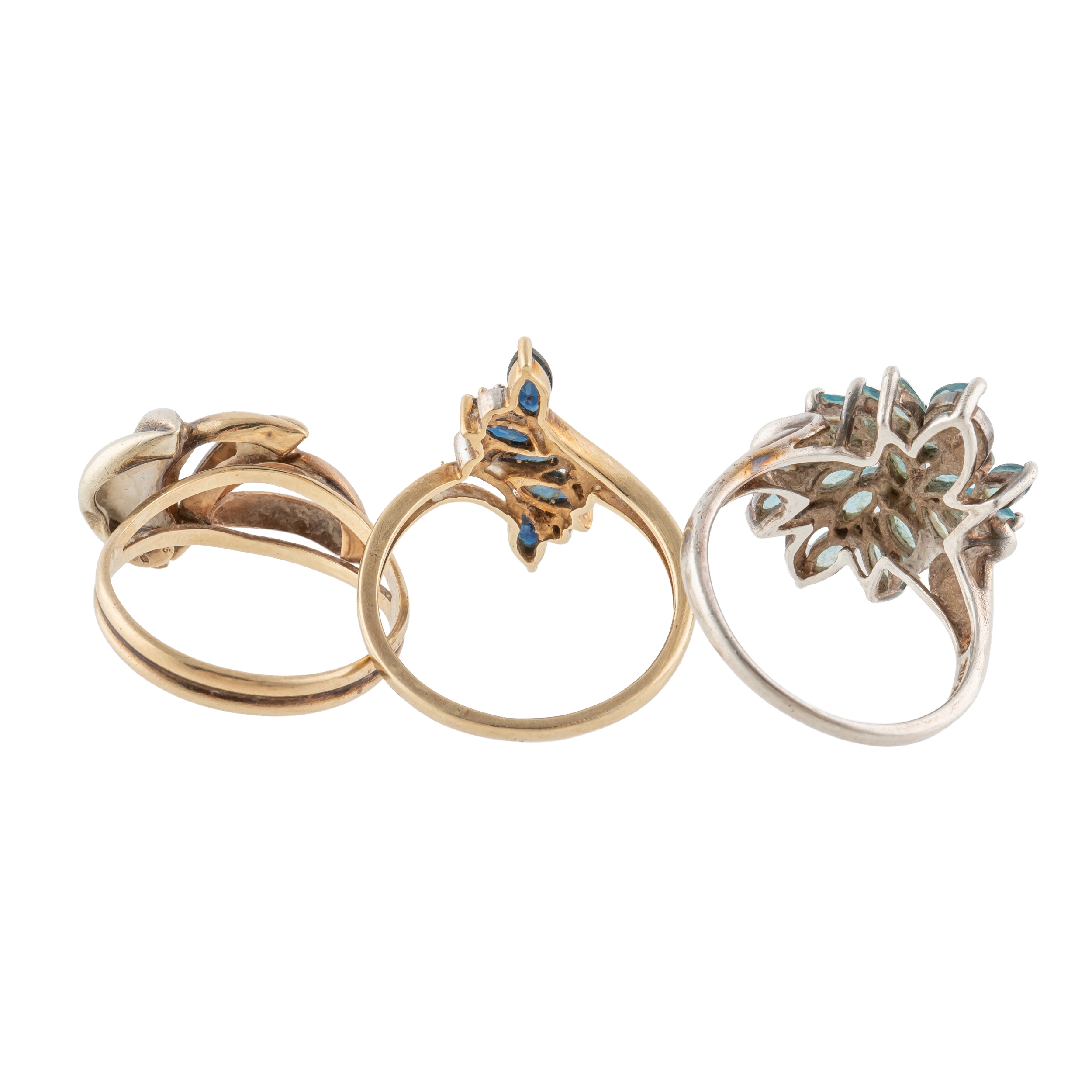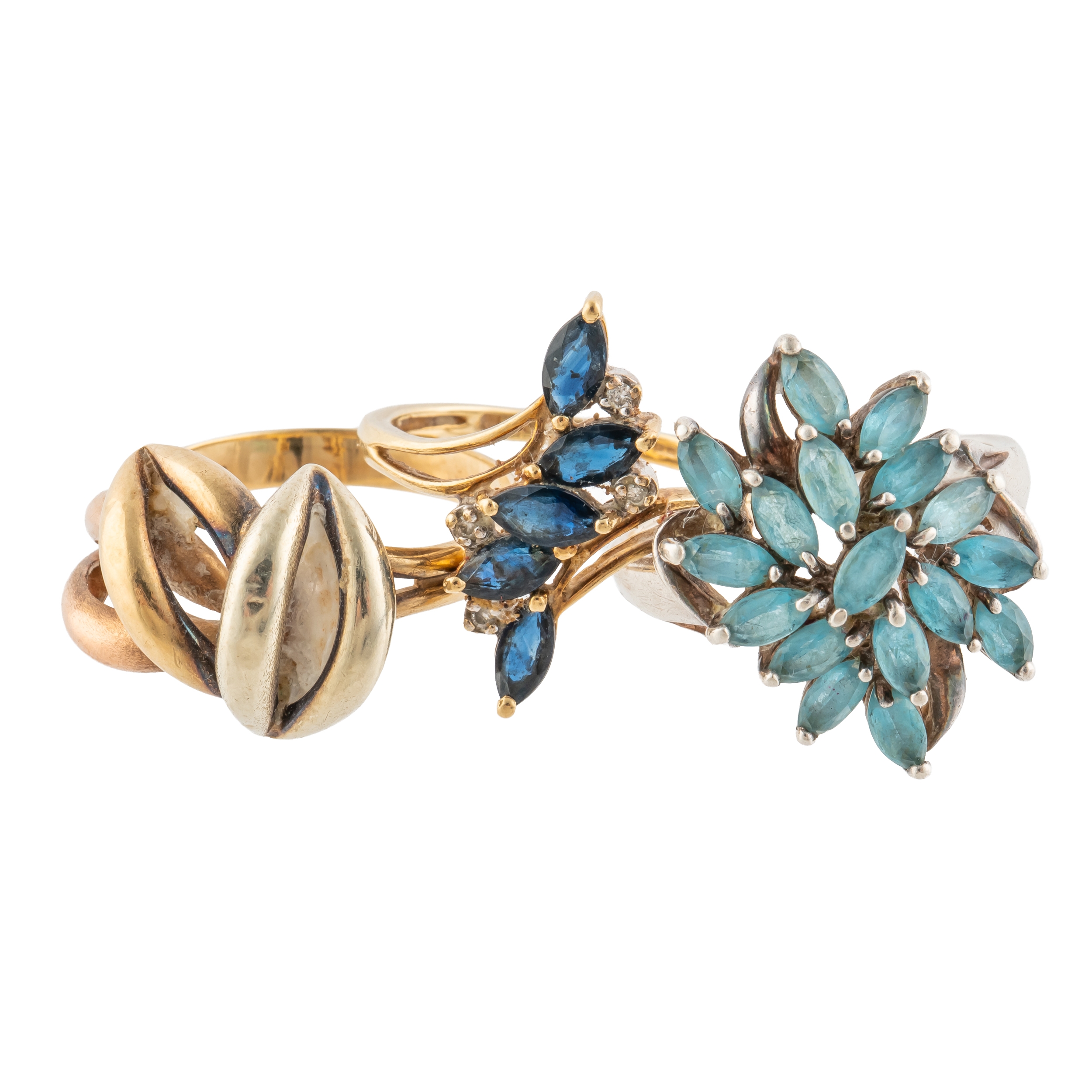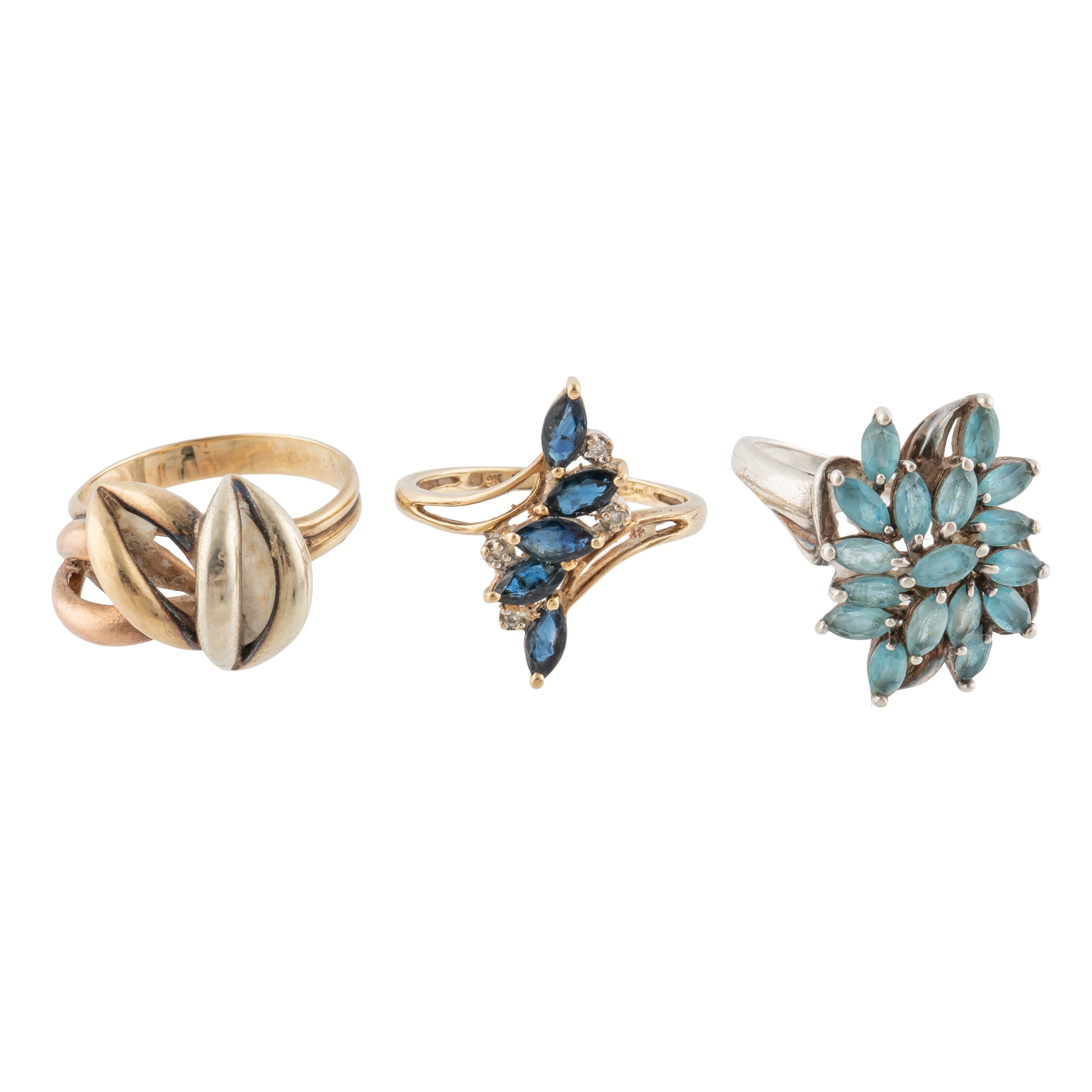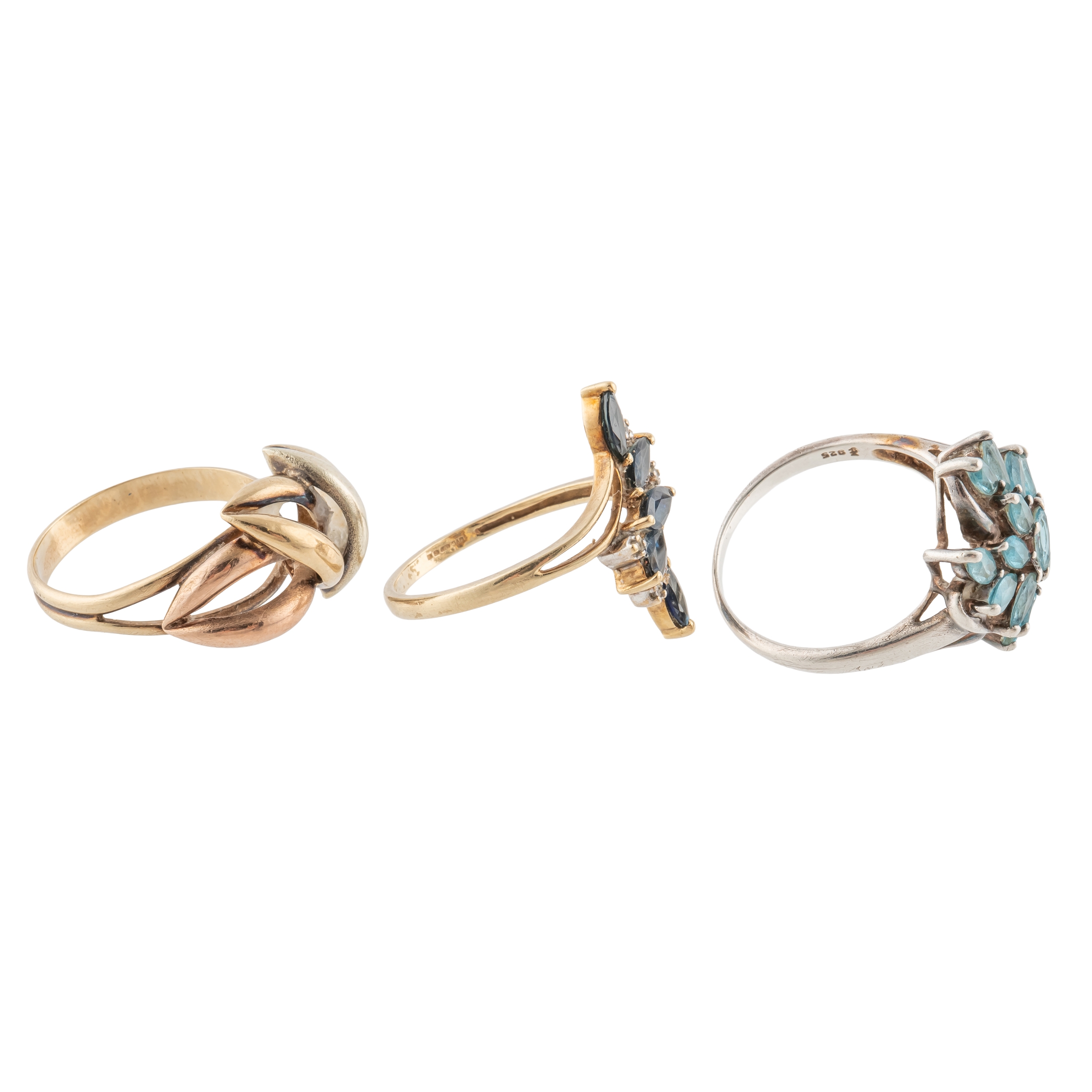 Comprising; a tricolour 9ct gold ring, size S, weight 2.7 grams, a sapphire and diamond set ring stamped 9k, size S½, gross weight 2.7 grams and a silver and bluestone ring, size S, gross weight 5.2 grams