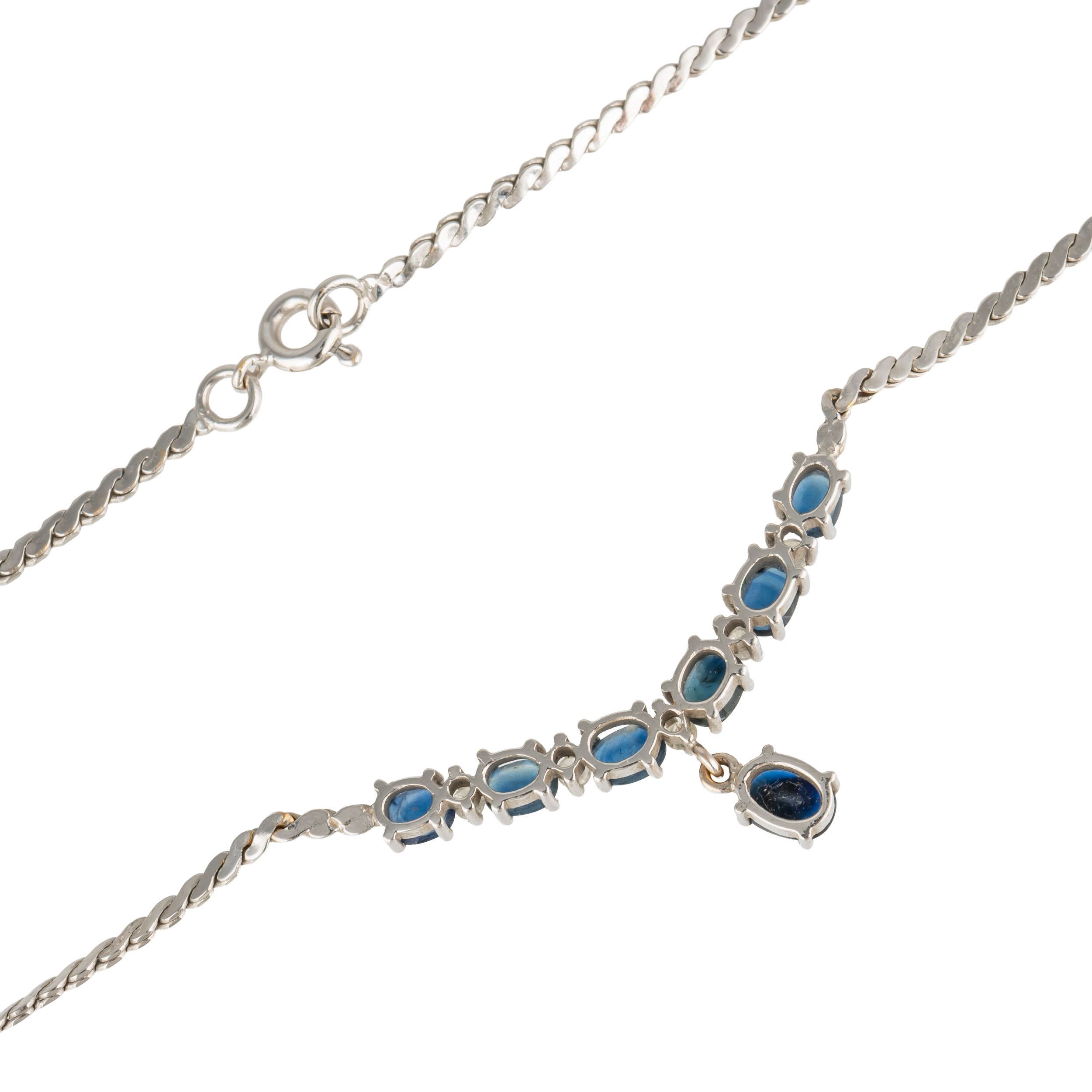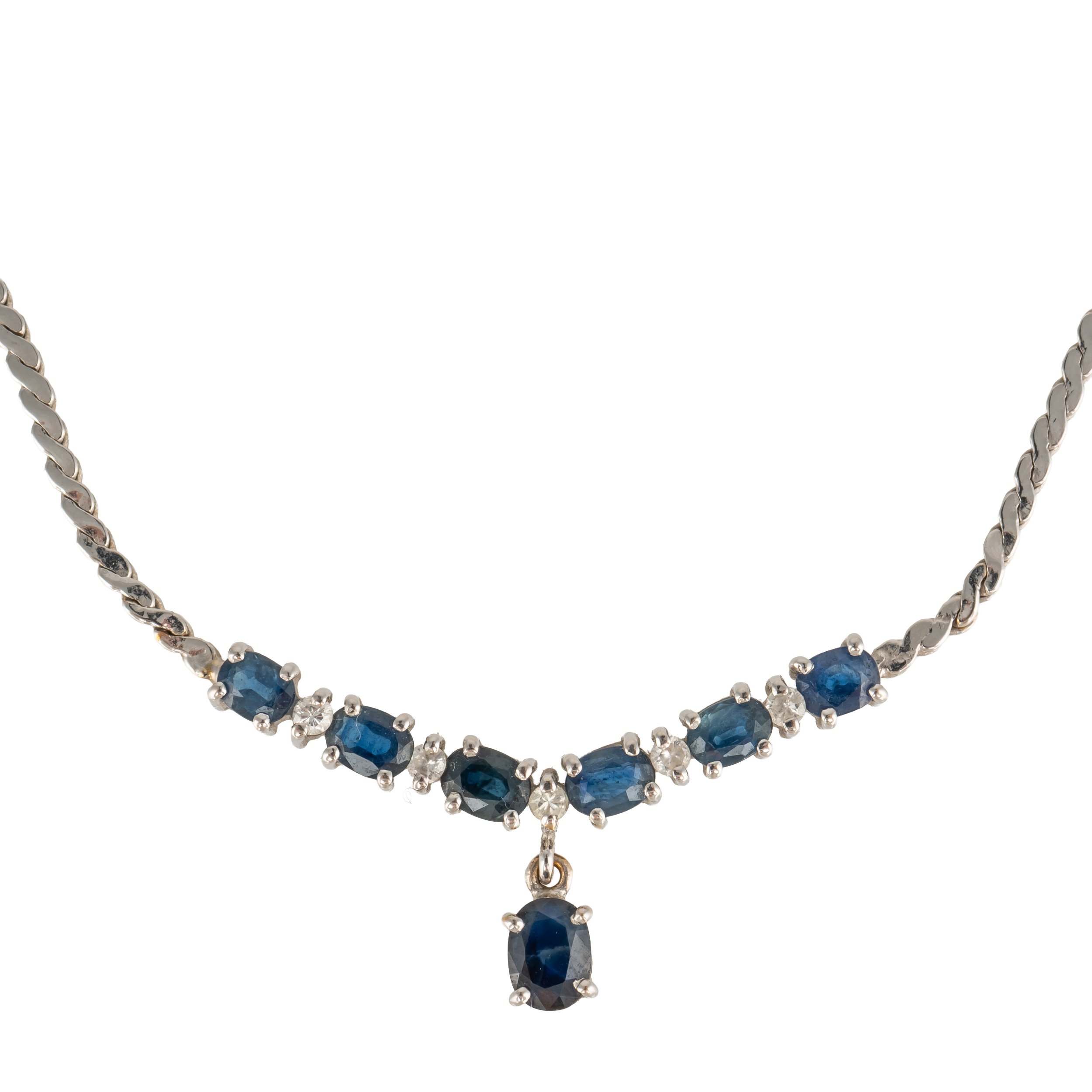 The front claw set with a curved row of six oval cut sapphires and with five small circular cut diamonds mounted at intervals, the front with a claw set oval cut sapphire single stone drop, the serpentine link necklace on a boltring clasp, detailed 750, length 37.5cm, gross weight 9.7 grams