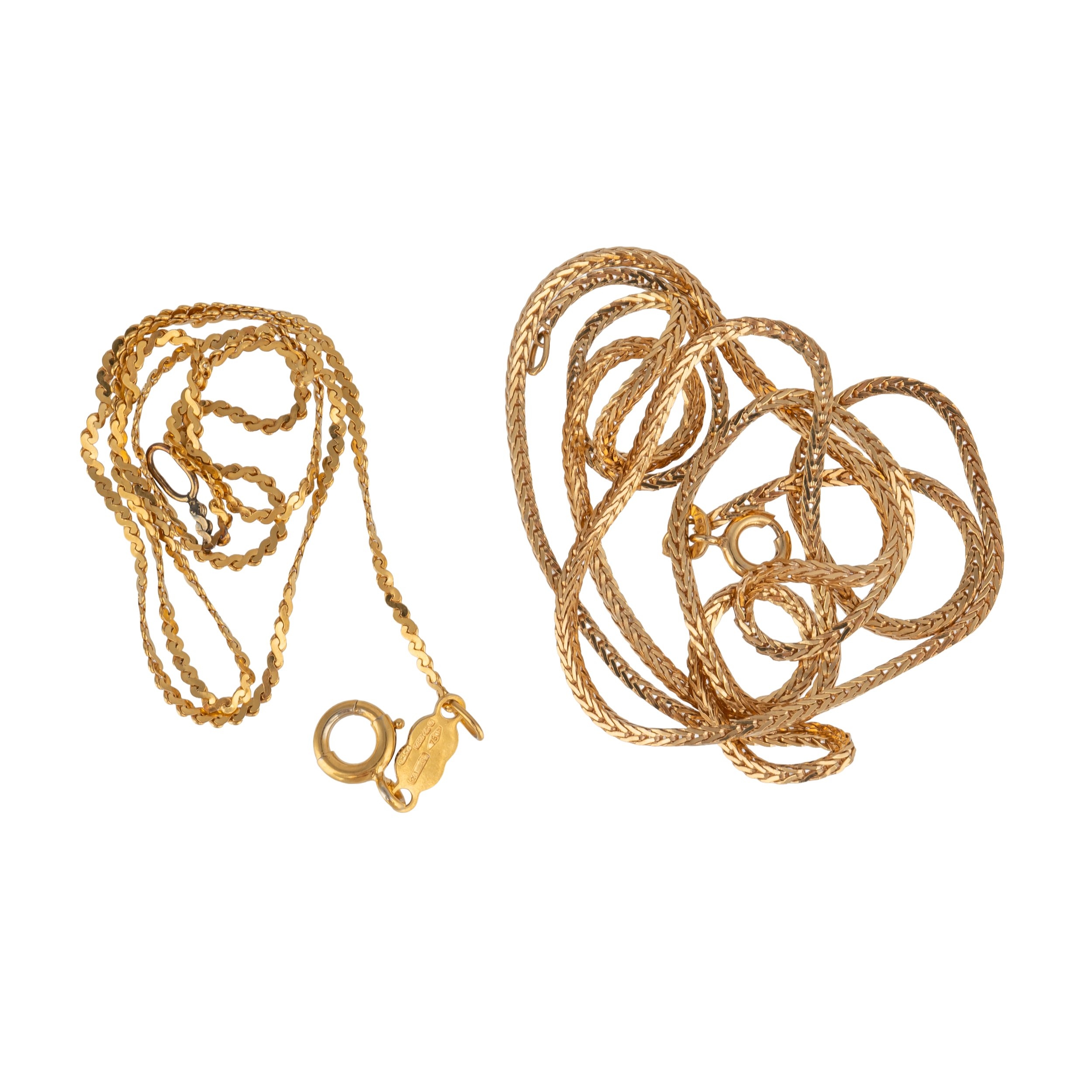 One a fancy box link, in 9ct gold, 60cm in length, weight 7 grams, the other in 18ct, measuring 39cm in length, weight 3.2 grams