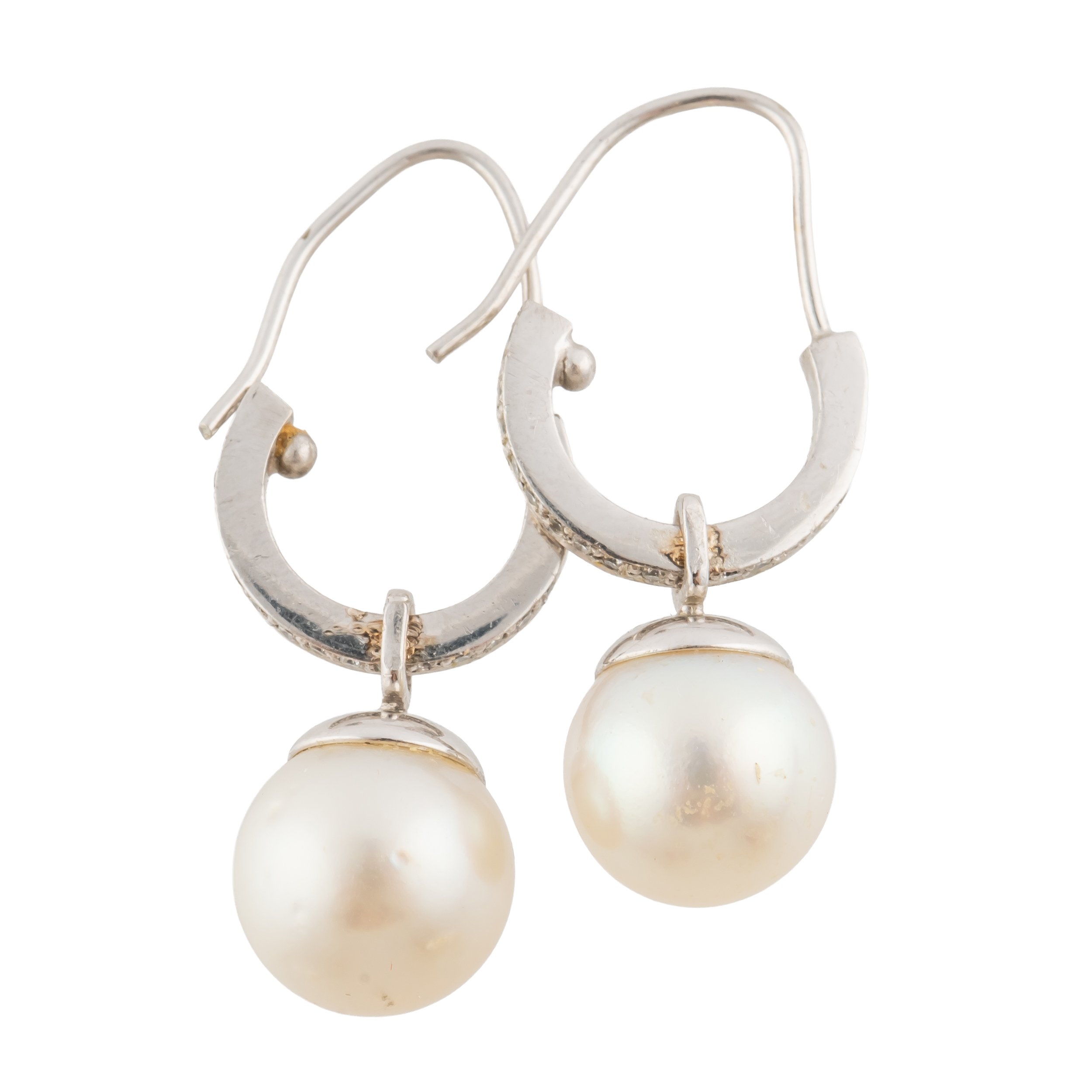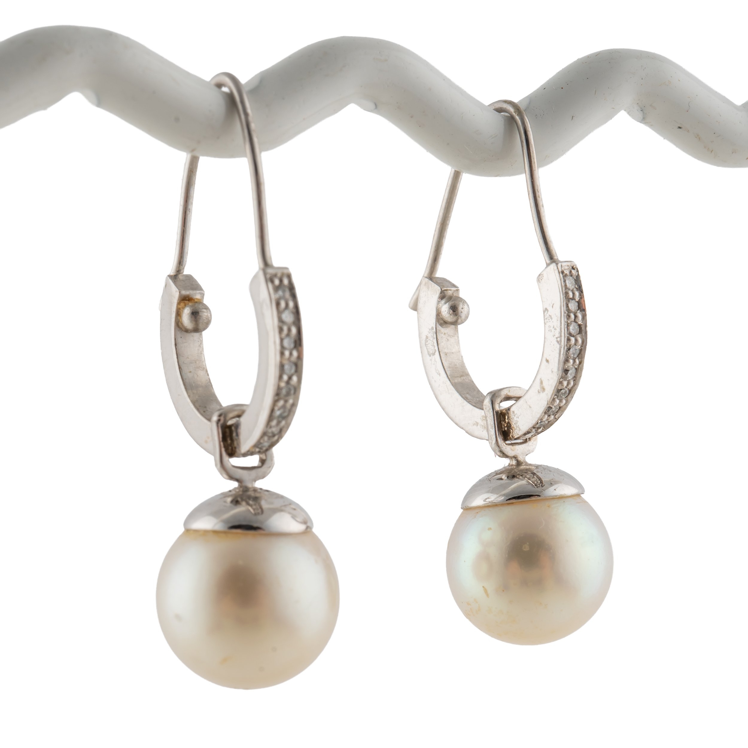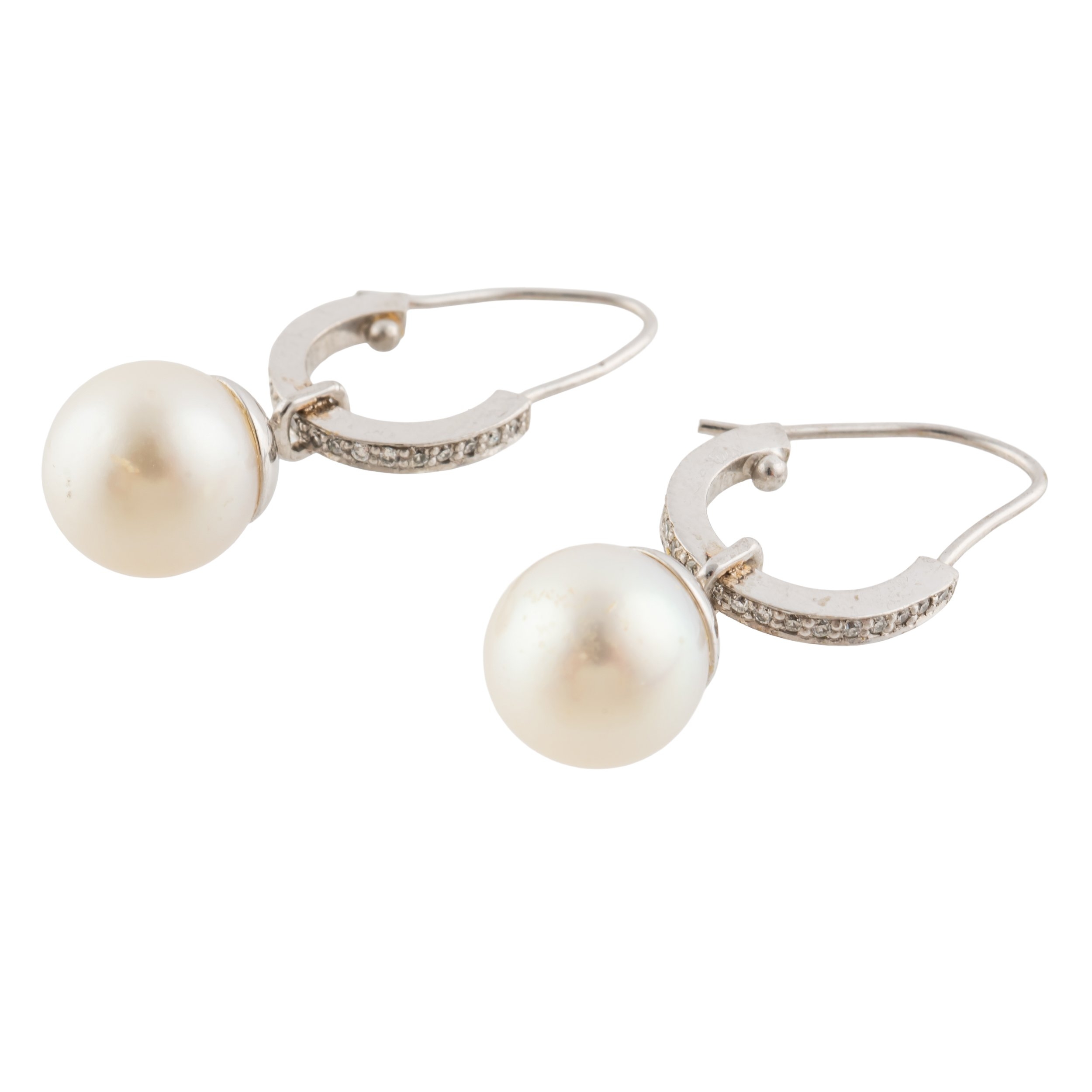Each mounted with a 10mm pearl and a row of round brilliant cut diamonds, with wire hook fittings, in unmarked white metal testing as gold and platinum, gross weight 6.7 grams
