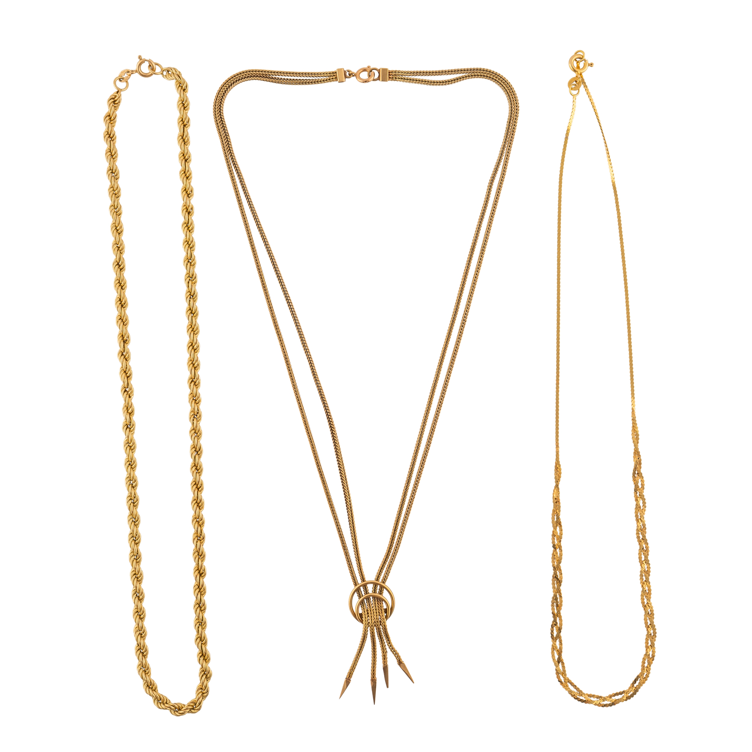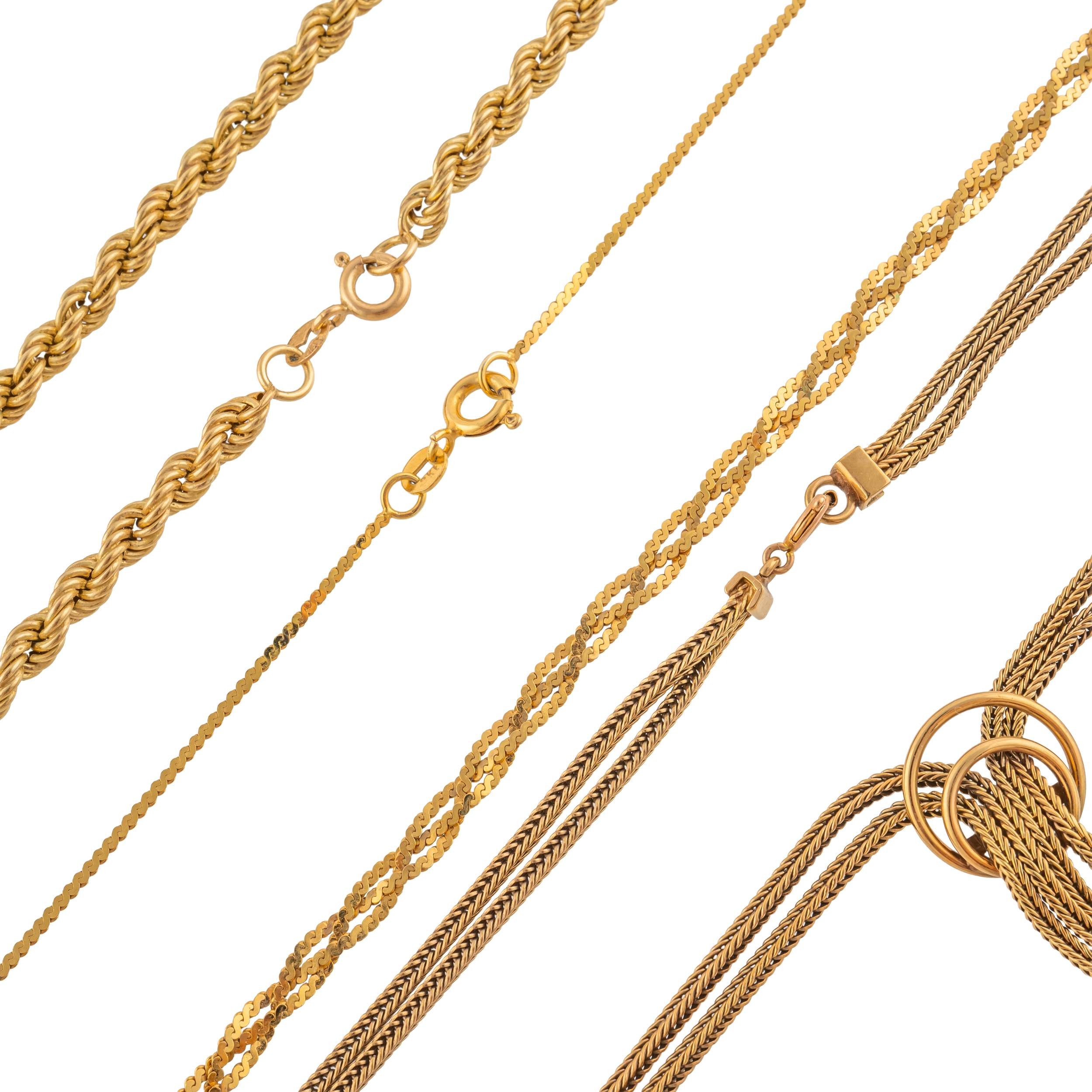 Comprising; a twist link chain, 41cm in length, a chain with a braided centre, measuring 41cm in length, and a two row snake chain with a tassel motif in the centre, measuring approximately 45cm in length with drop, combined gross weight 22.7 grams