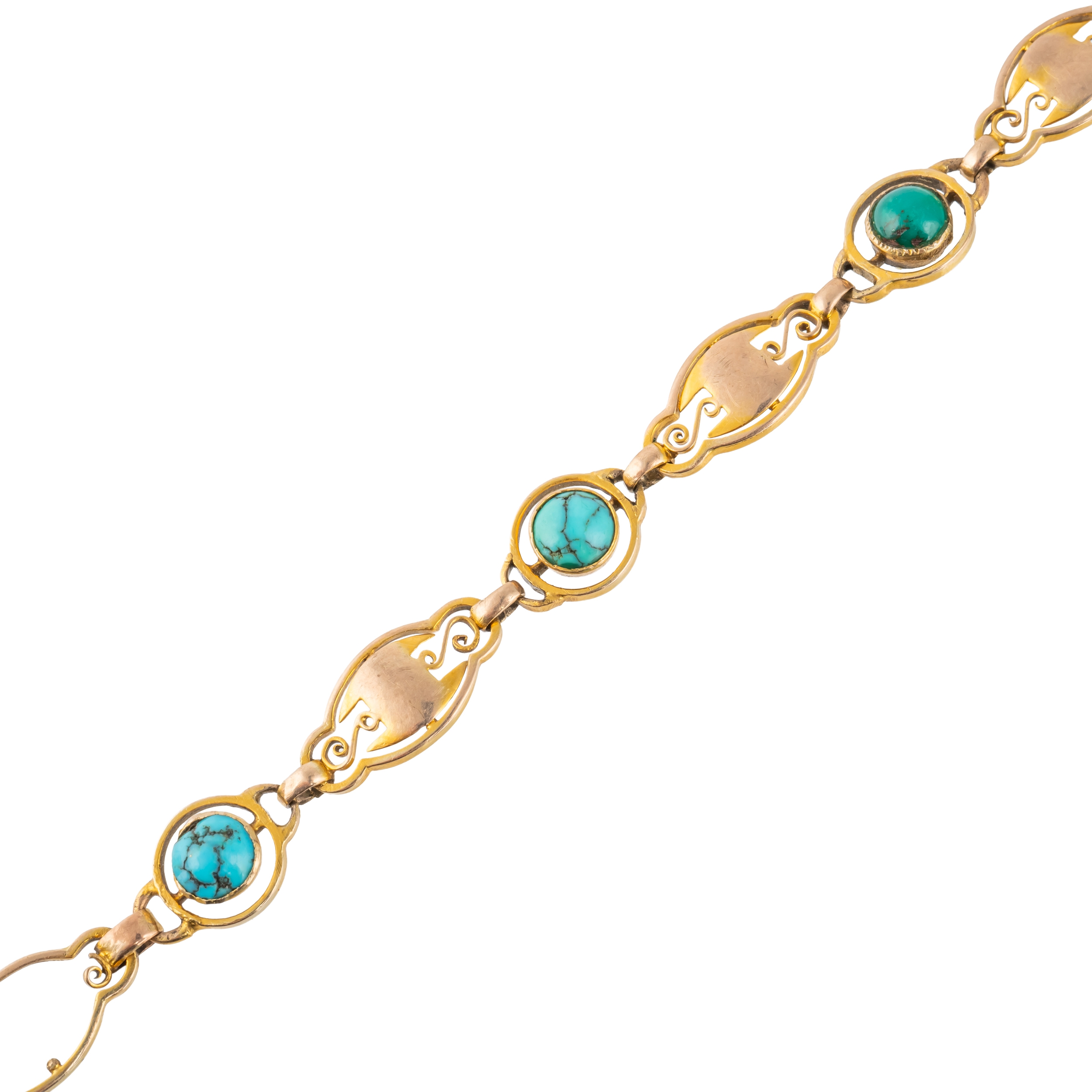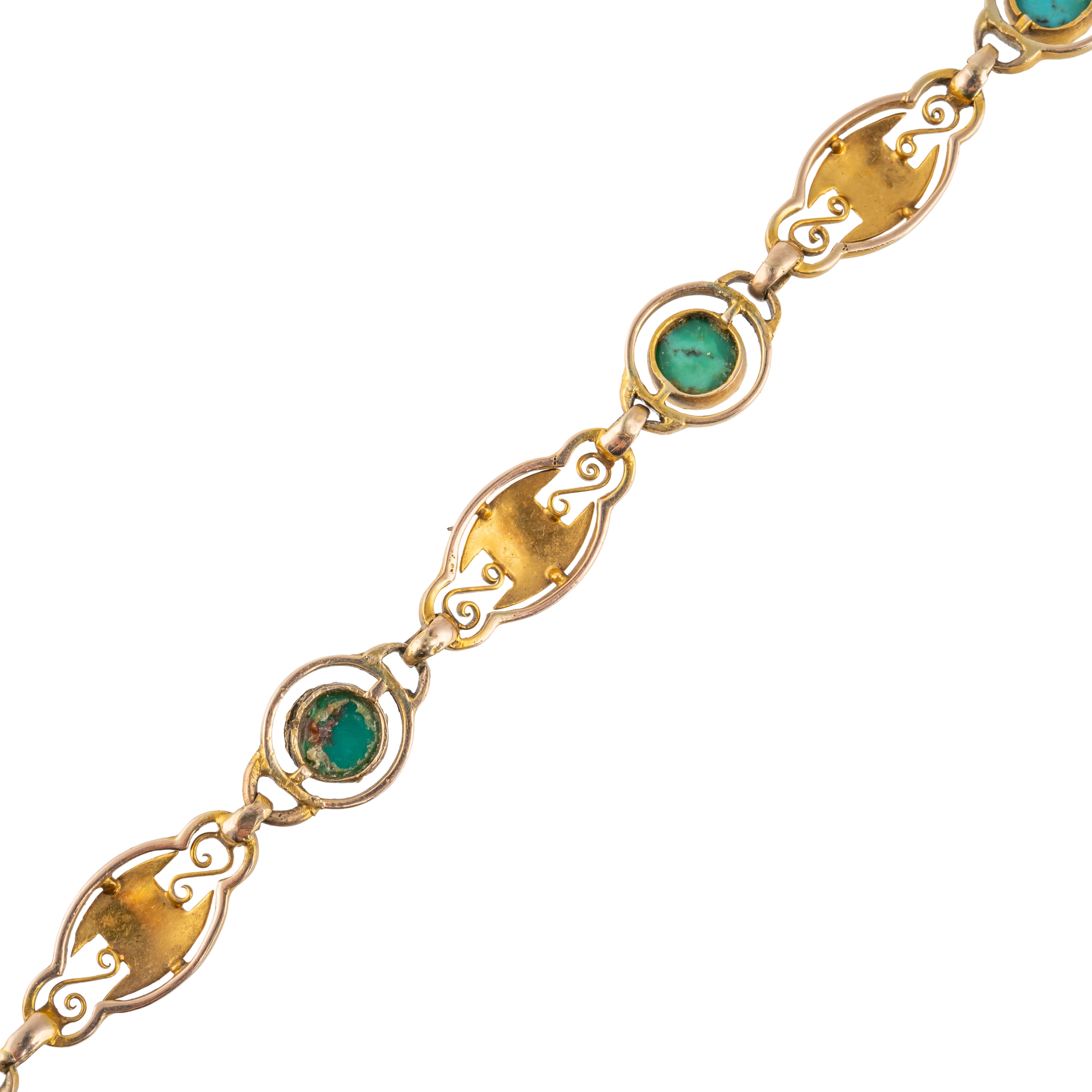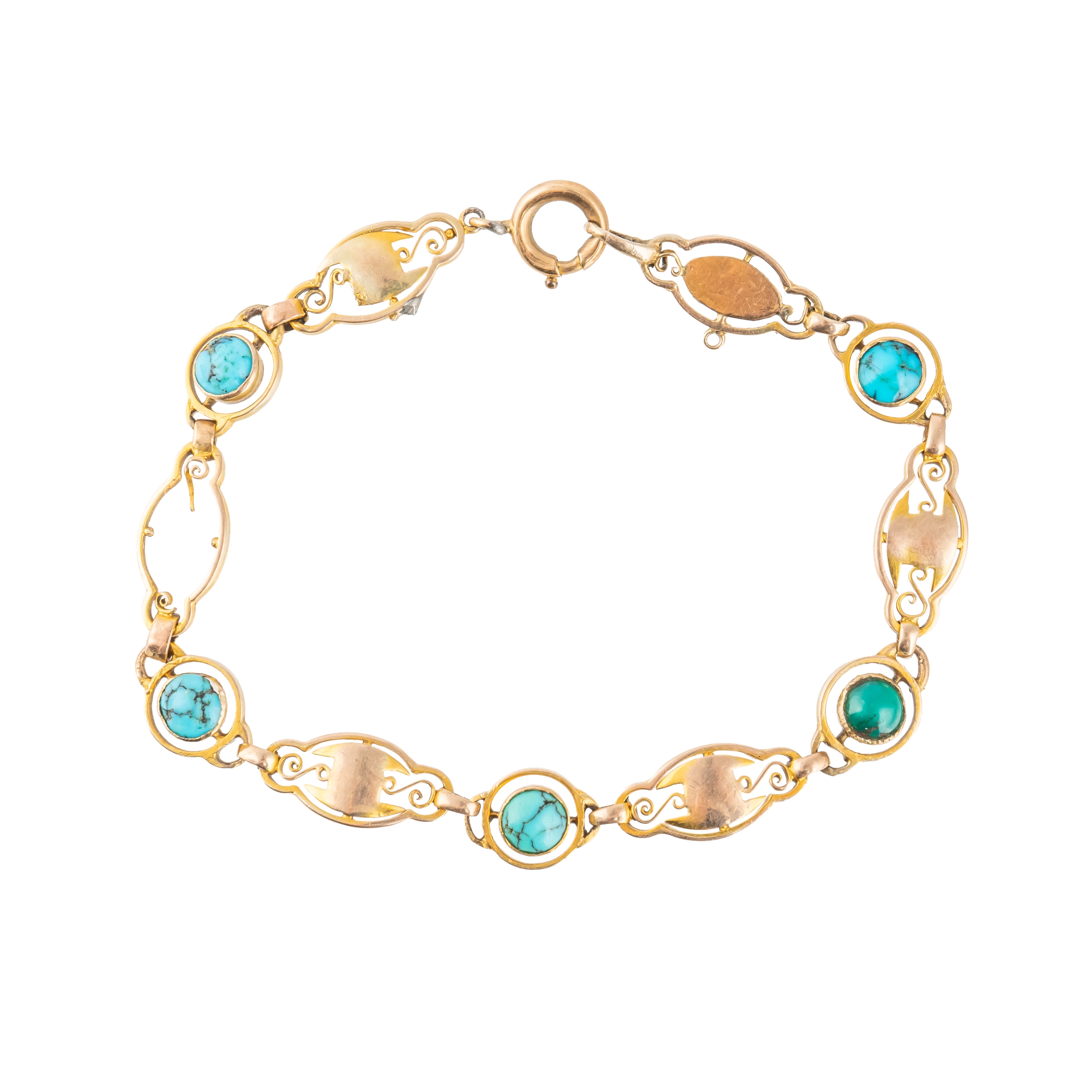 Designed as a row of circular turquoise set links, alternating with shaped oval links, on a boltring clasp, detailed 9 CT, length 18.3cm, gross weight 6.3 grams, with an associated case