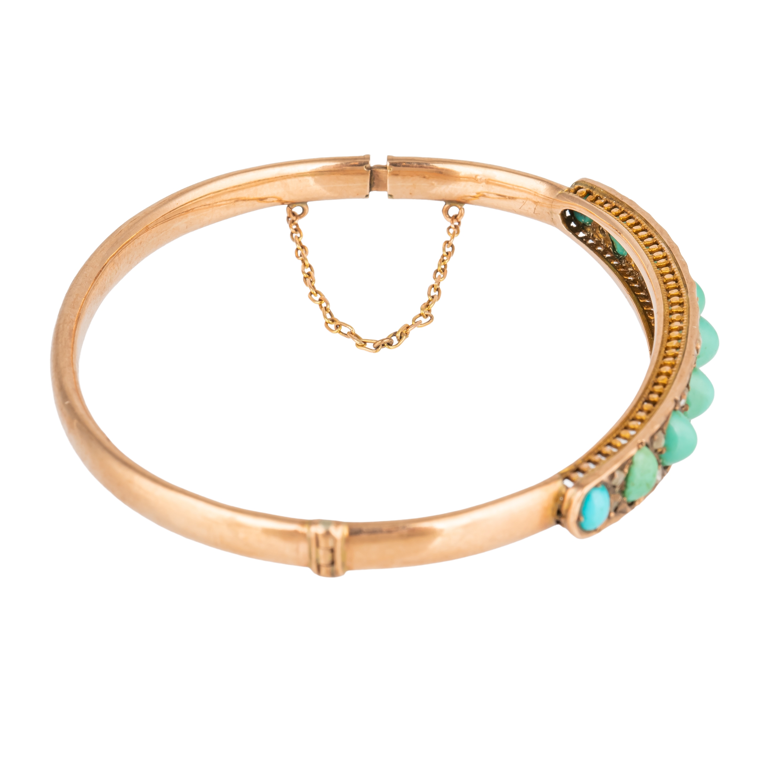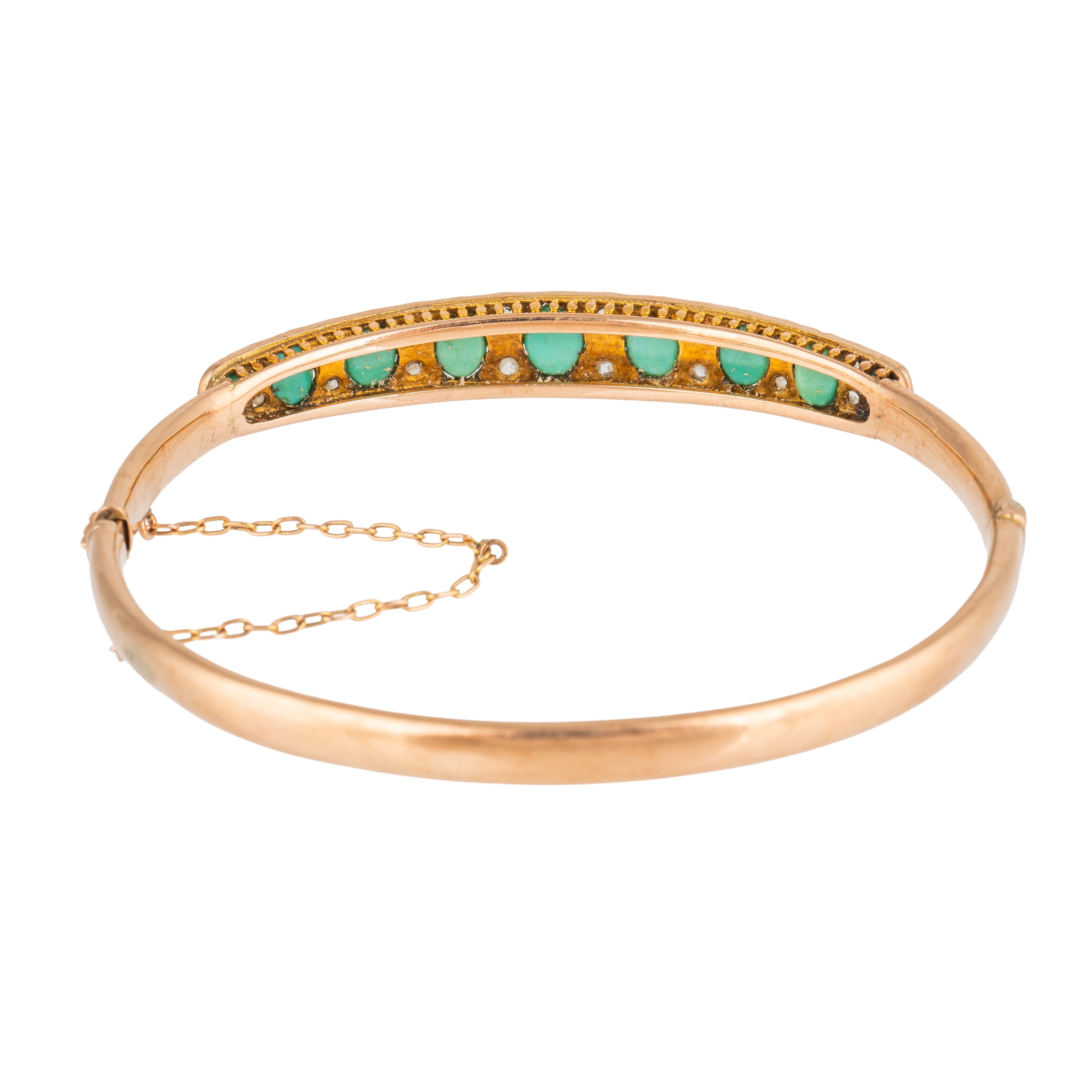 The front mounted with a row of nine graduated oval turquoise and with eight pairs of diamonds mounted at intervals, on a snap clasp, detailed 9 CT, circa 1915, fitted with a safety chain, internal minimal diameter 5cm and maximum internal diameter 5.8cm, gross weight 9.4 grams