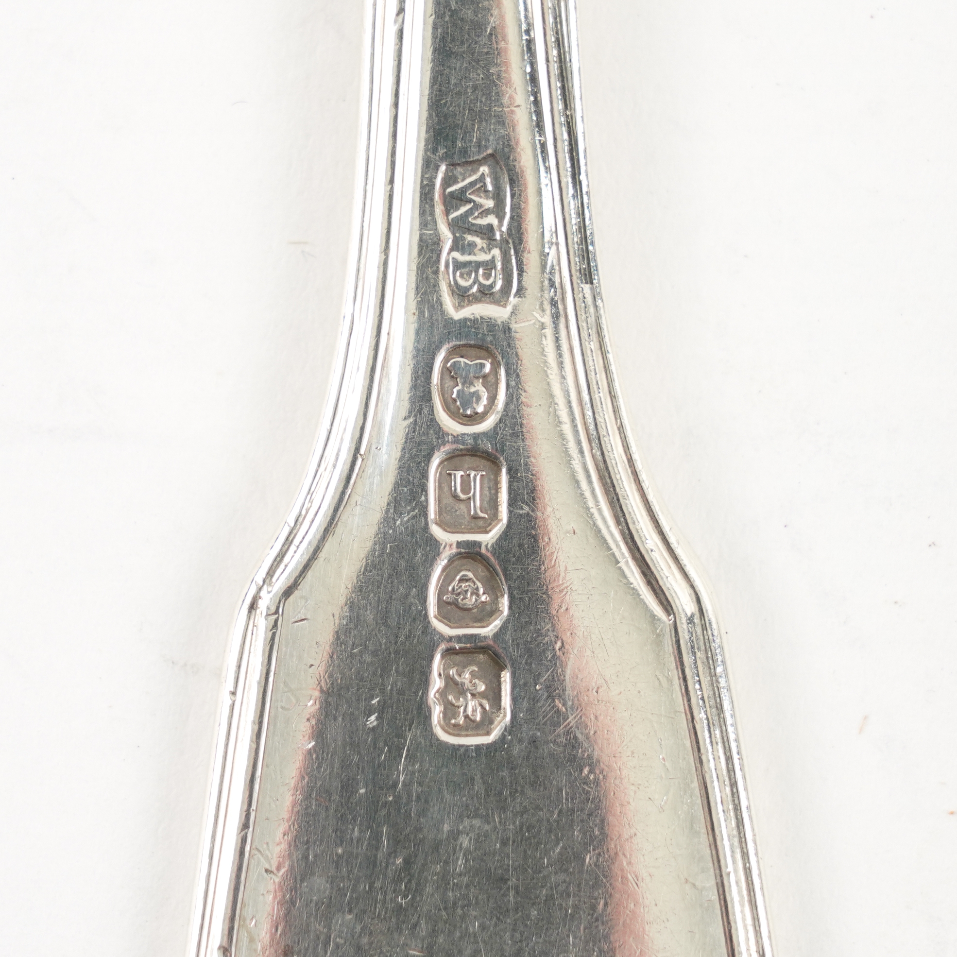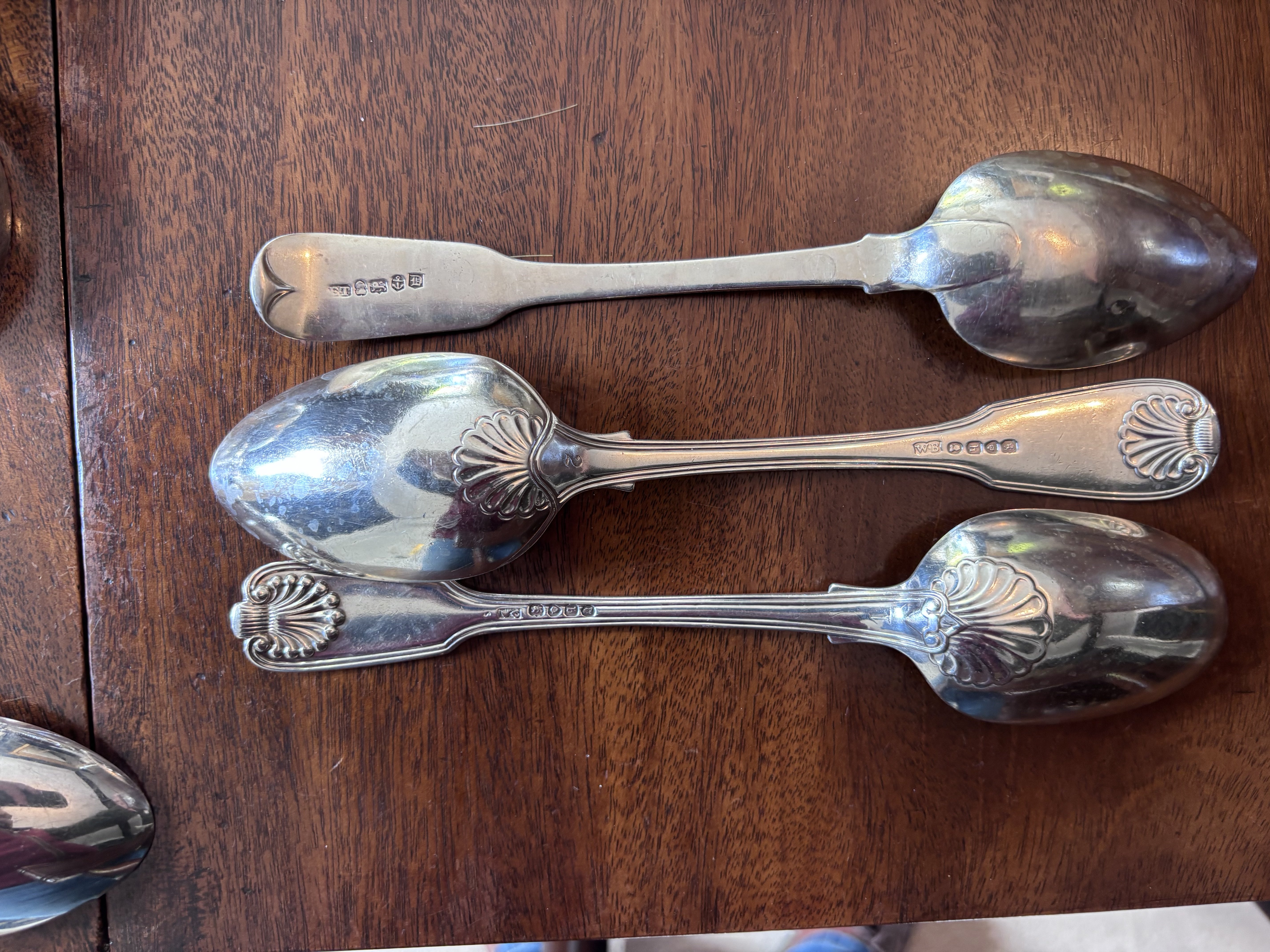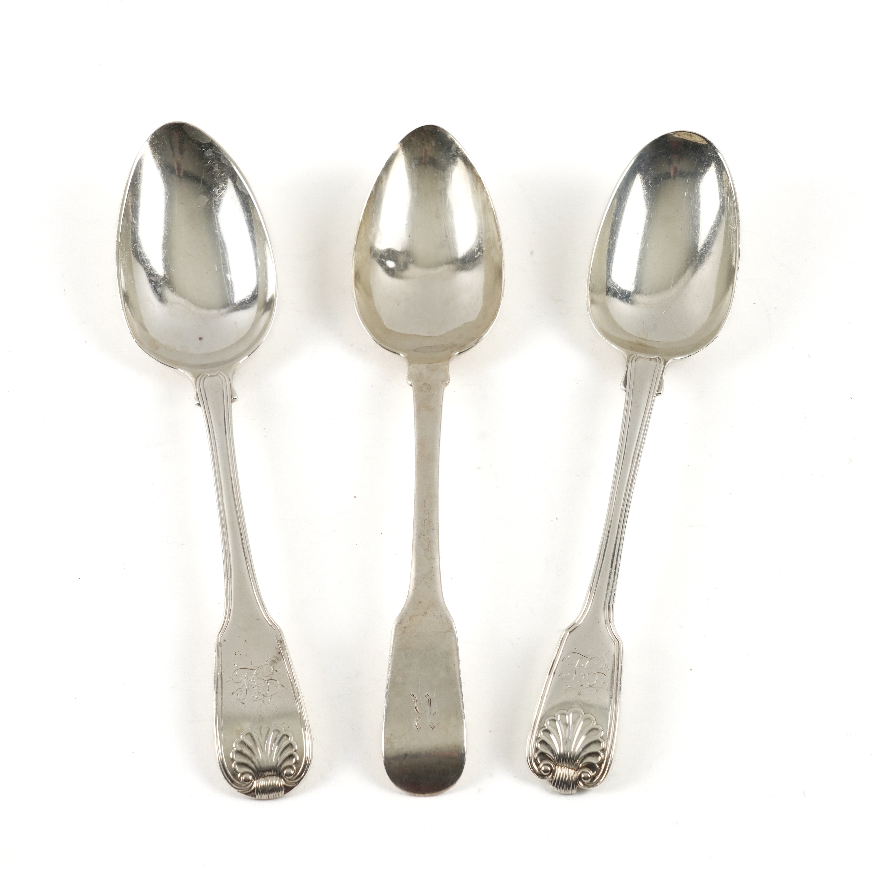 Comprising; two double struck fiddle, thread and shell pattern tablespoons, London 1823 and 1831 and a fiddle pattern tablespoon, Birmingham 1827, combined weight 275 grams
