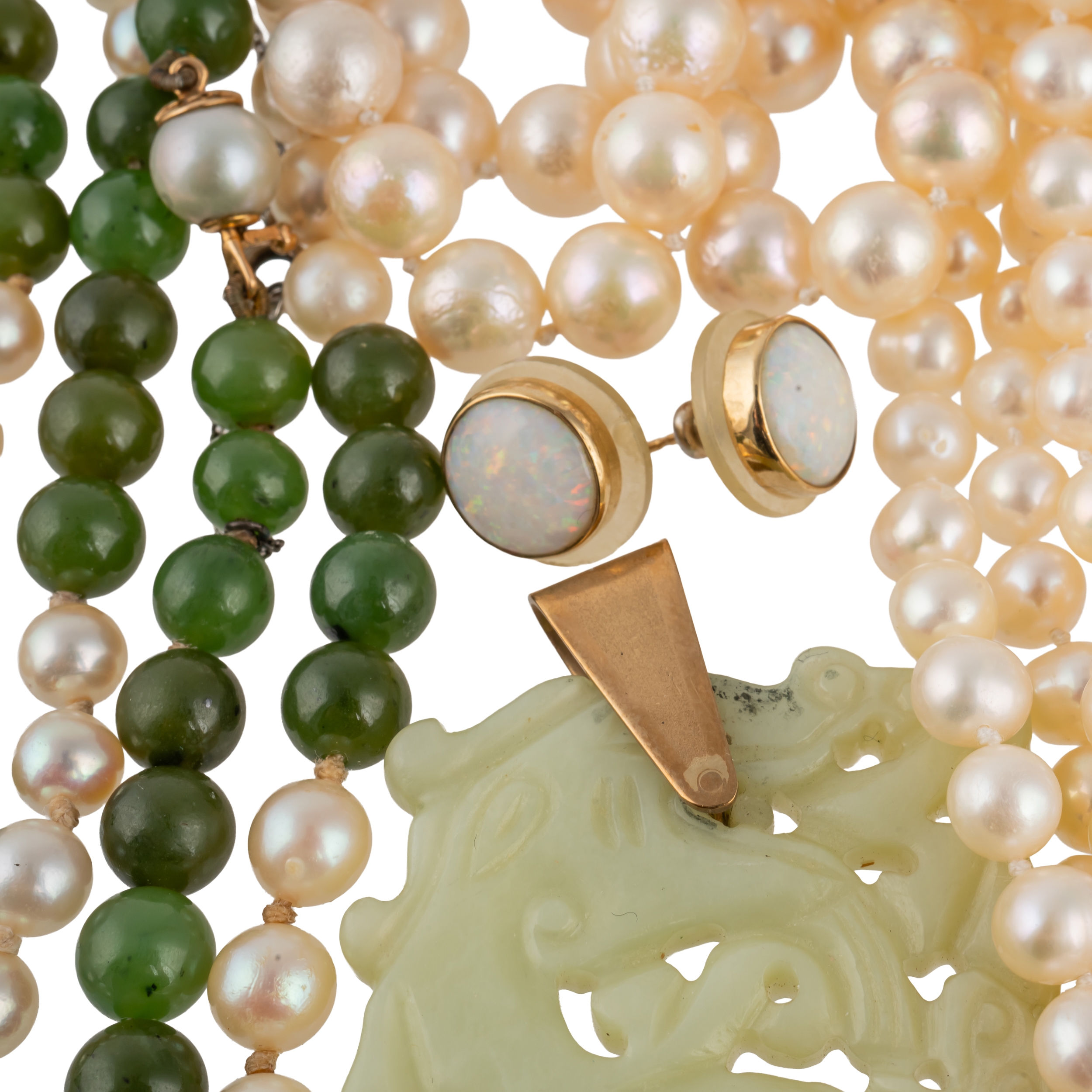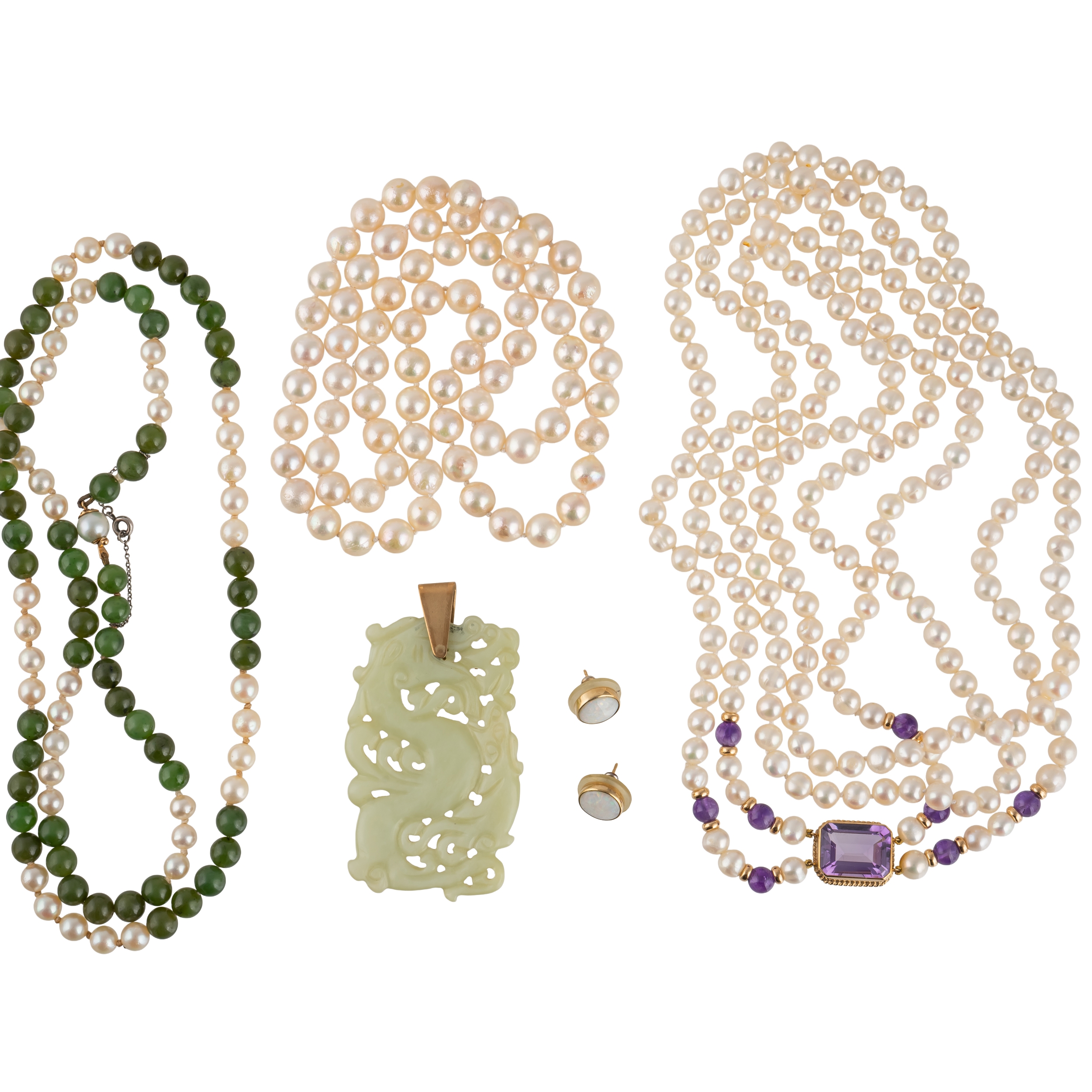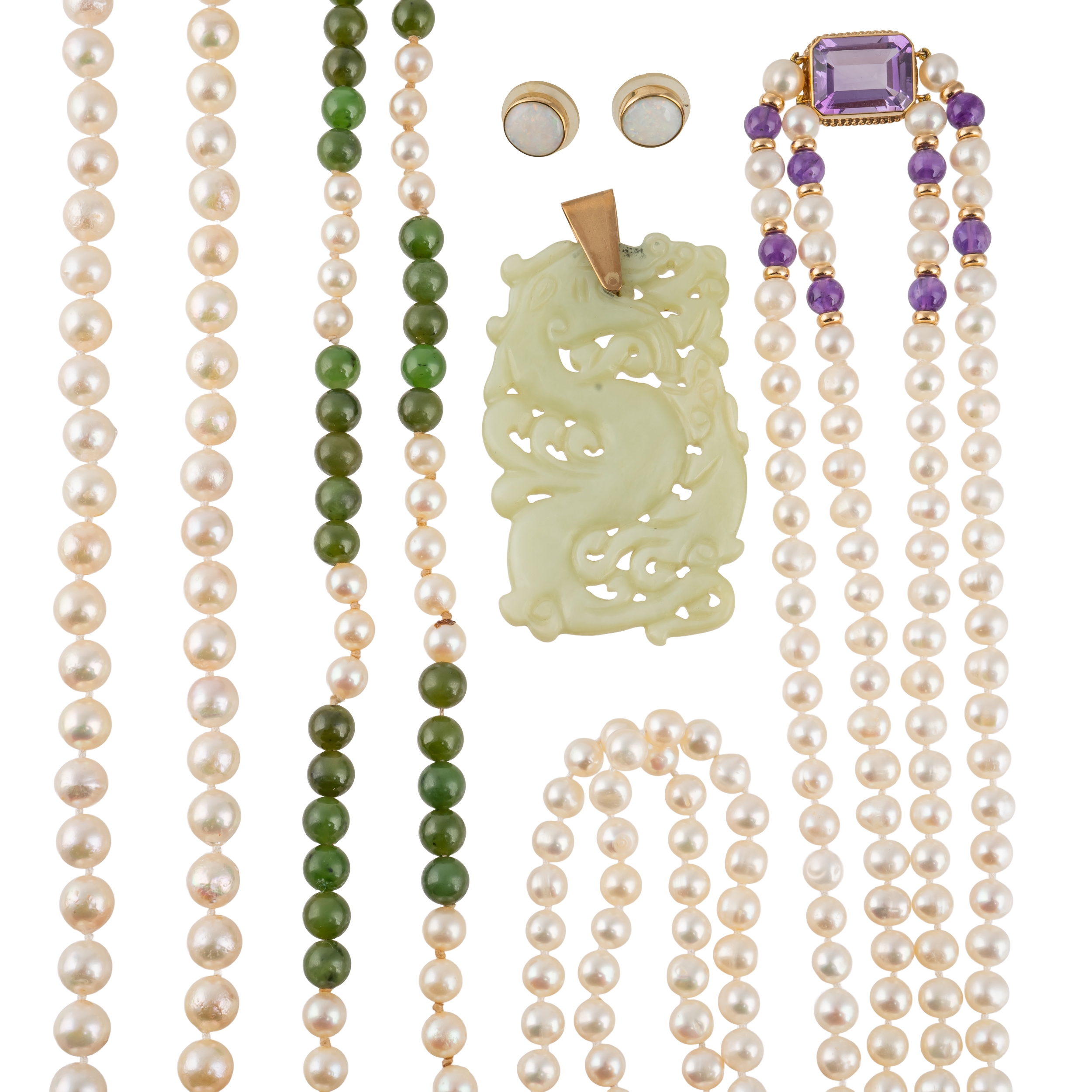 Comprising; a two row cultured pearl necklace, the front with a 9ct gold mounted rectangular cut amethyst and with four pairs of amethyst beads at intervals and four further items, comprising; a single row necklace of cultured pearls, a single row necklace of nephrite beads and cultured pearls, a pale green stone shaped rectangular pendant, having a dragon motif and a pair of 9ct gold and opal single stone earstuds, with post fittings
