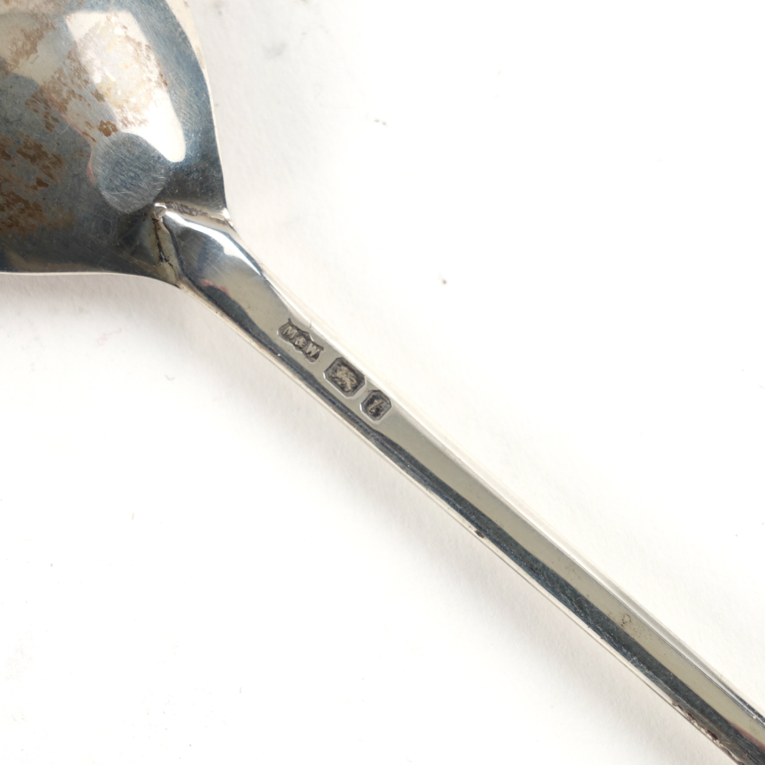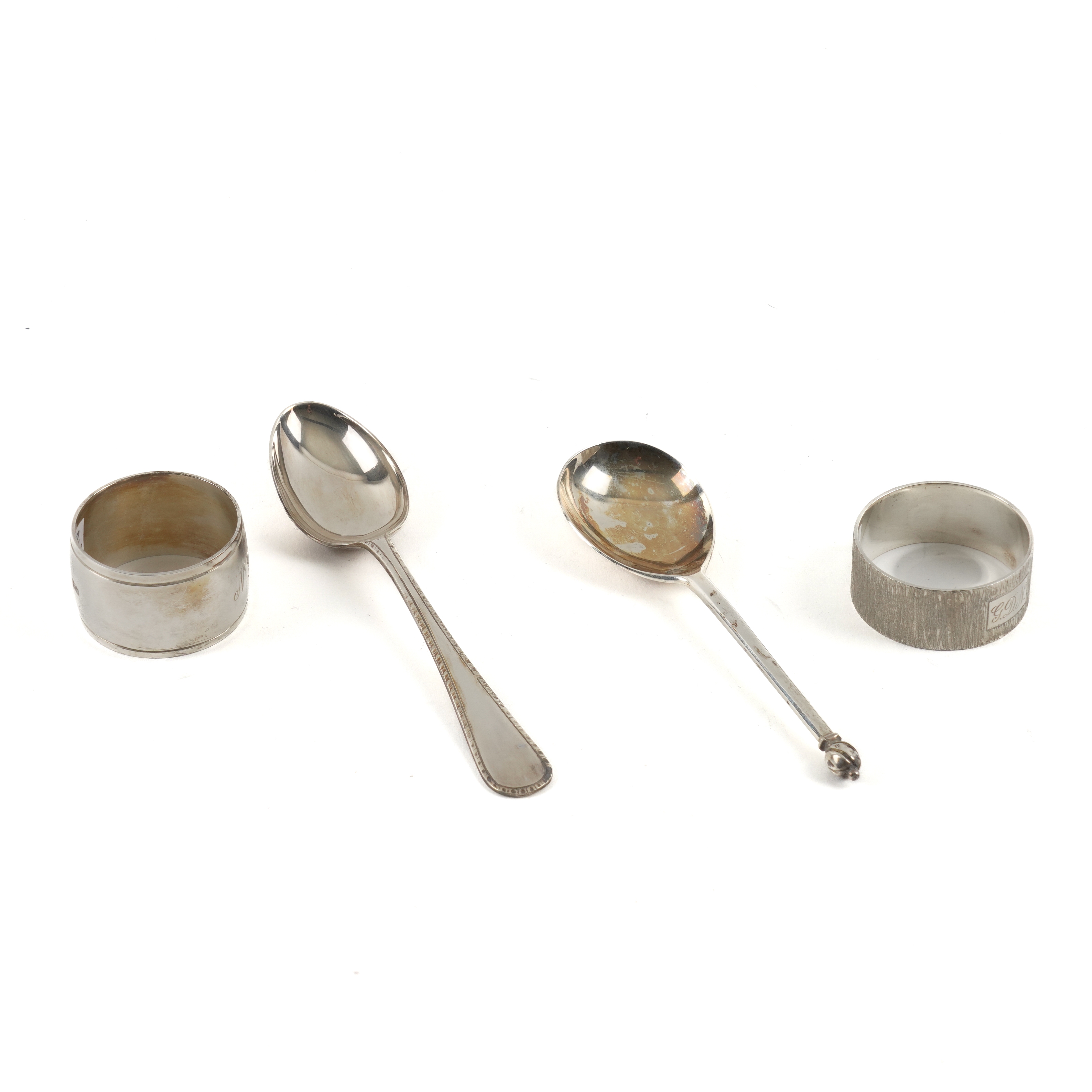 Comprising; a napkin ring with bark textured decoration, London 1972, another napkin ring, London 1977 and two christening spoons, the one with the fig shaped bowl, London 1974, the feather edged Old English pattern, one Birmingham 1966, combined weight 128 grams, with two cases