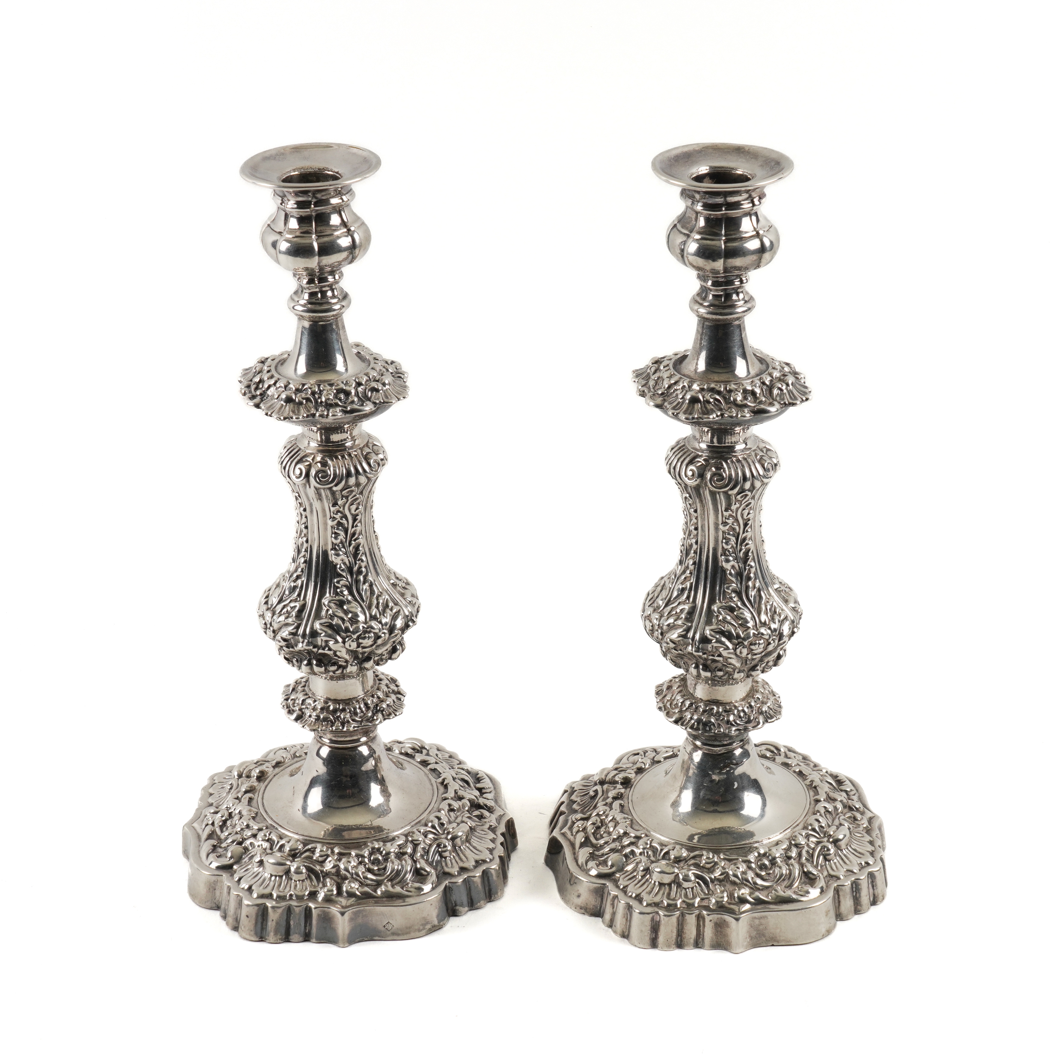 Each with a baluster stem and shaped circular base, (loaded), boldly decorated with floral and foliate scrolls, sample height 33cm, each detailed 27 (possibly converted from the bases of Continental table candelabra)