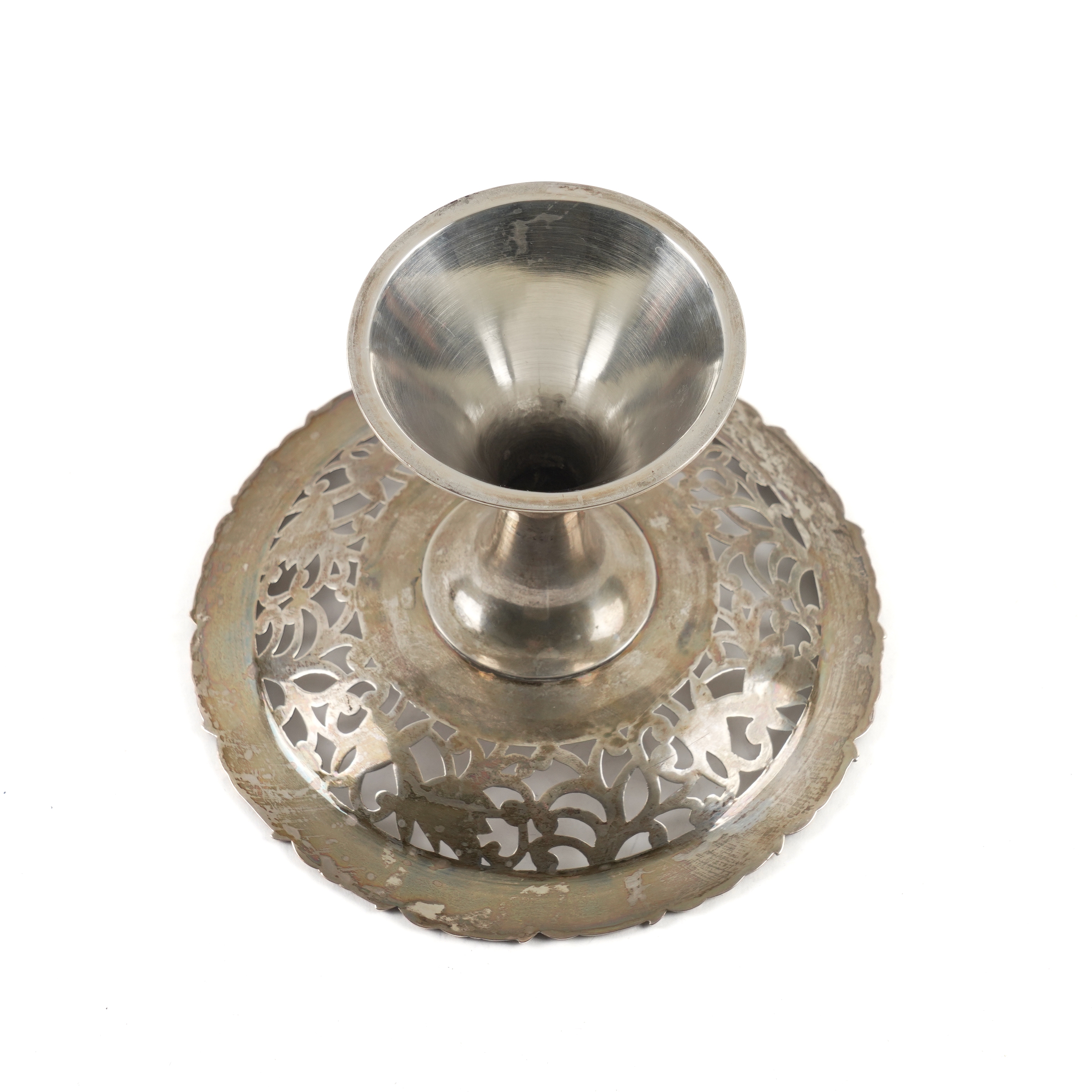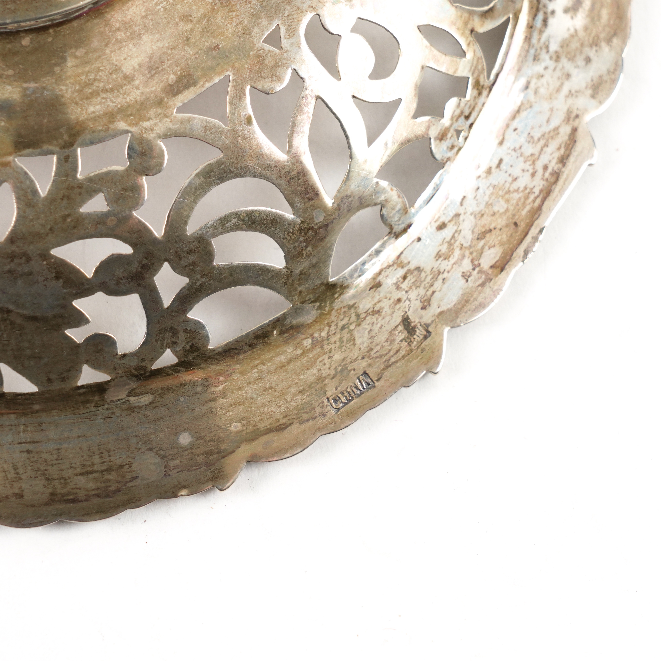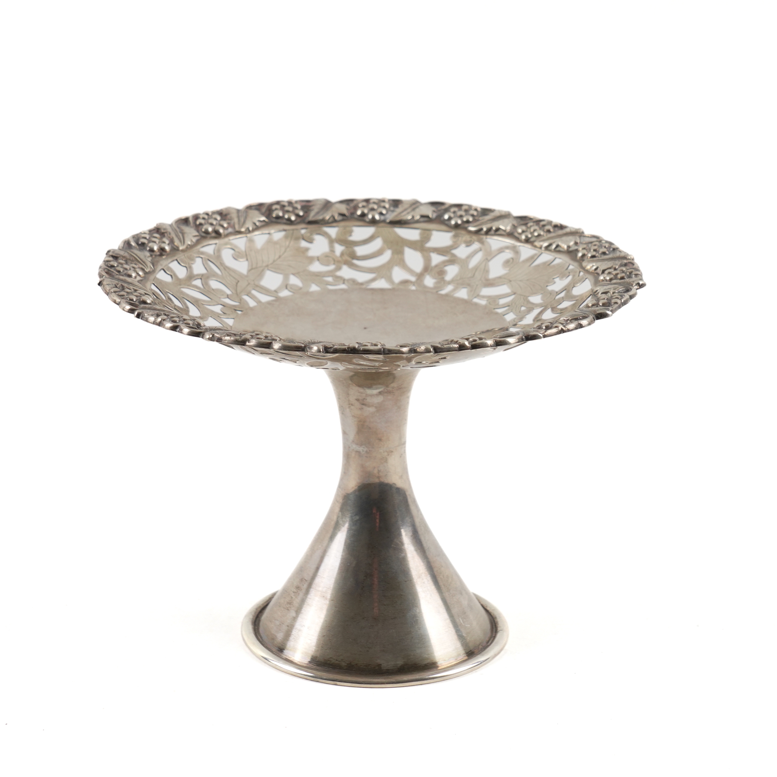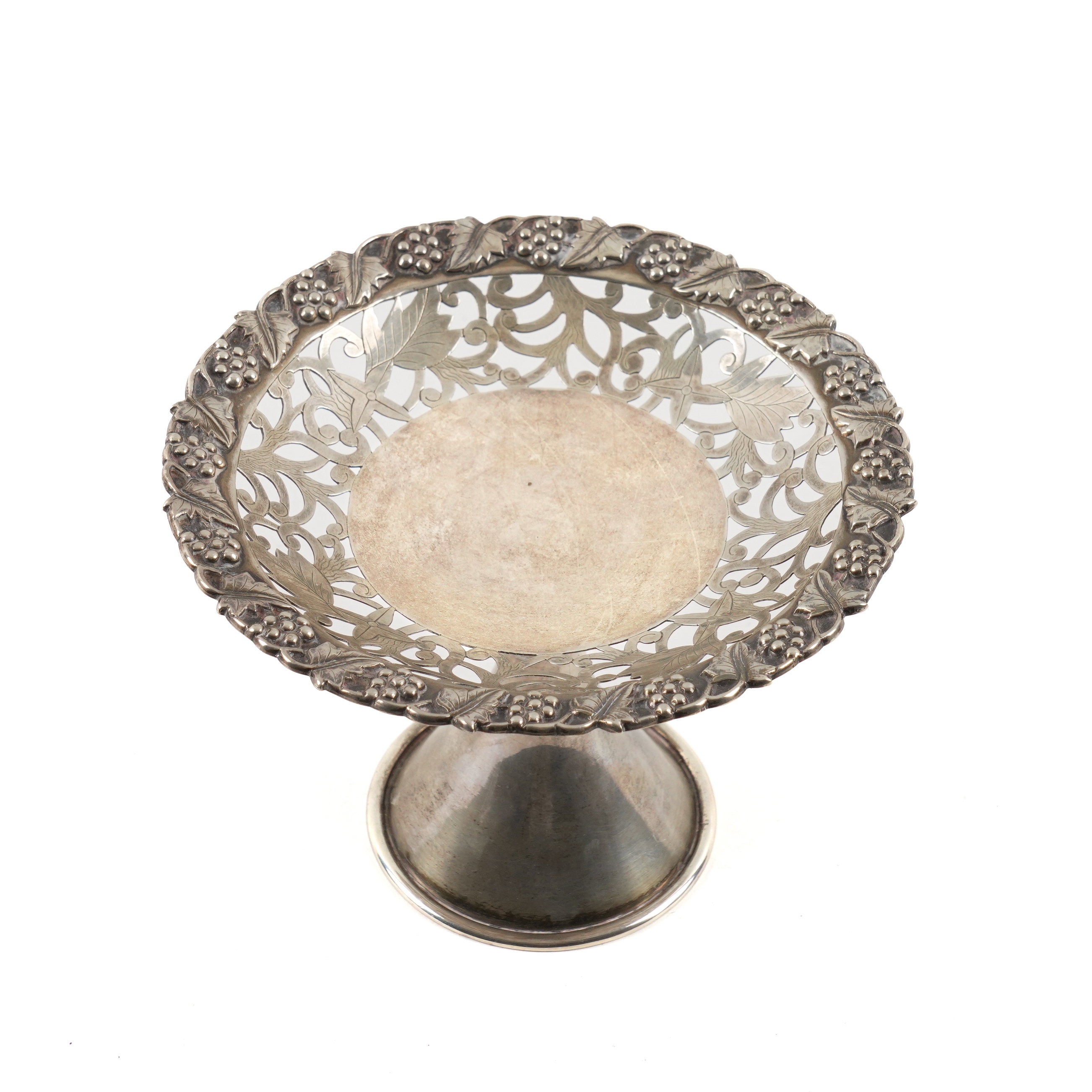 With scroll and foliate pierced decoration within a border of fruiting vine, raised on a conical foot, detailed China, diameter 15.5cm, weight 215 grams