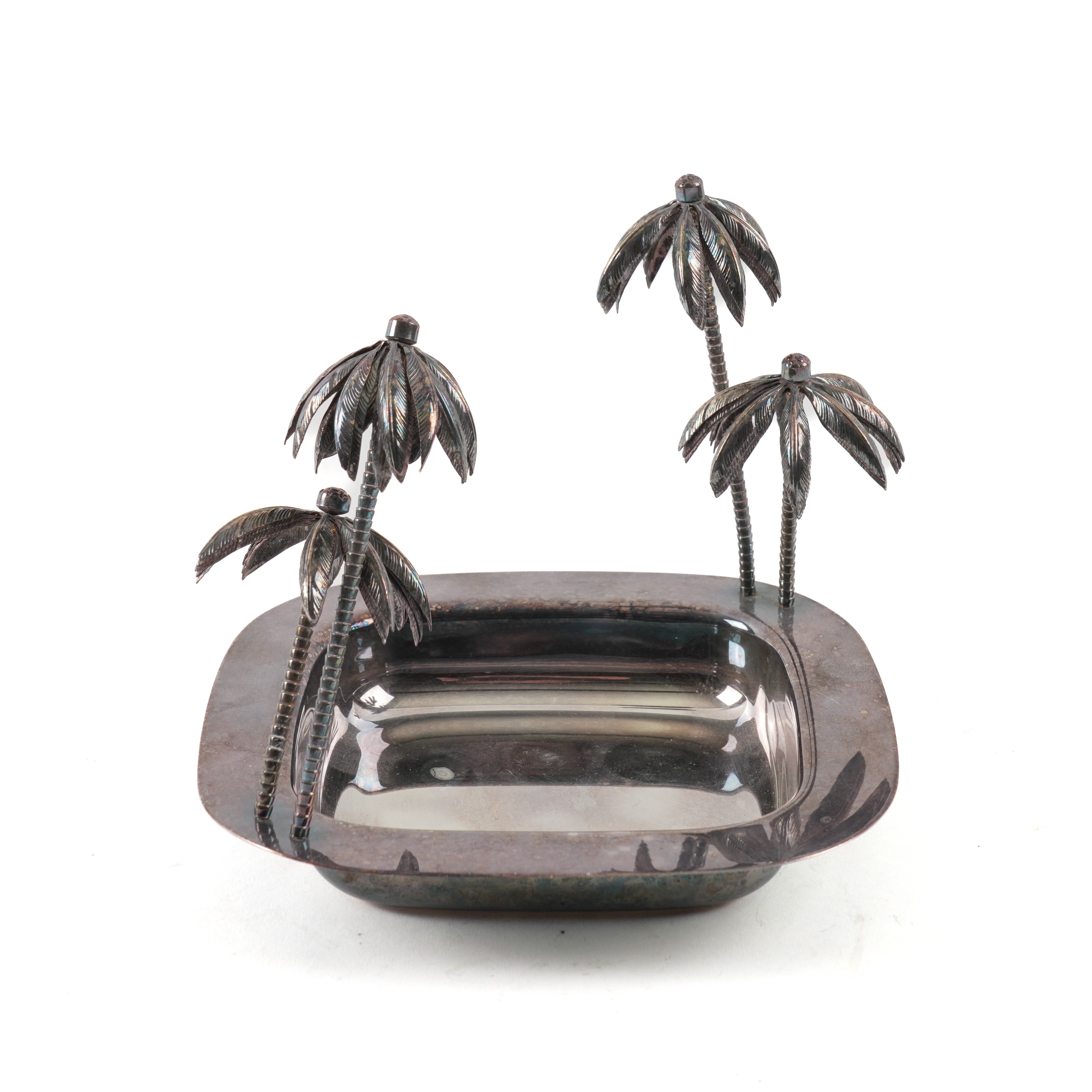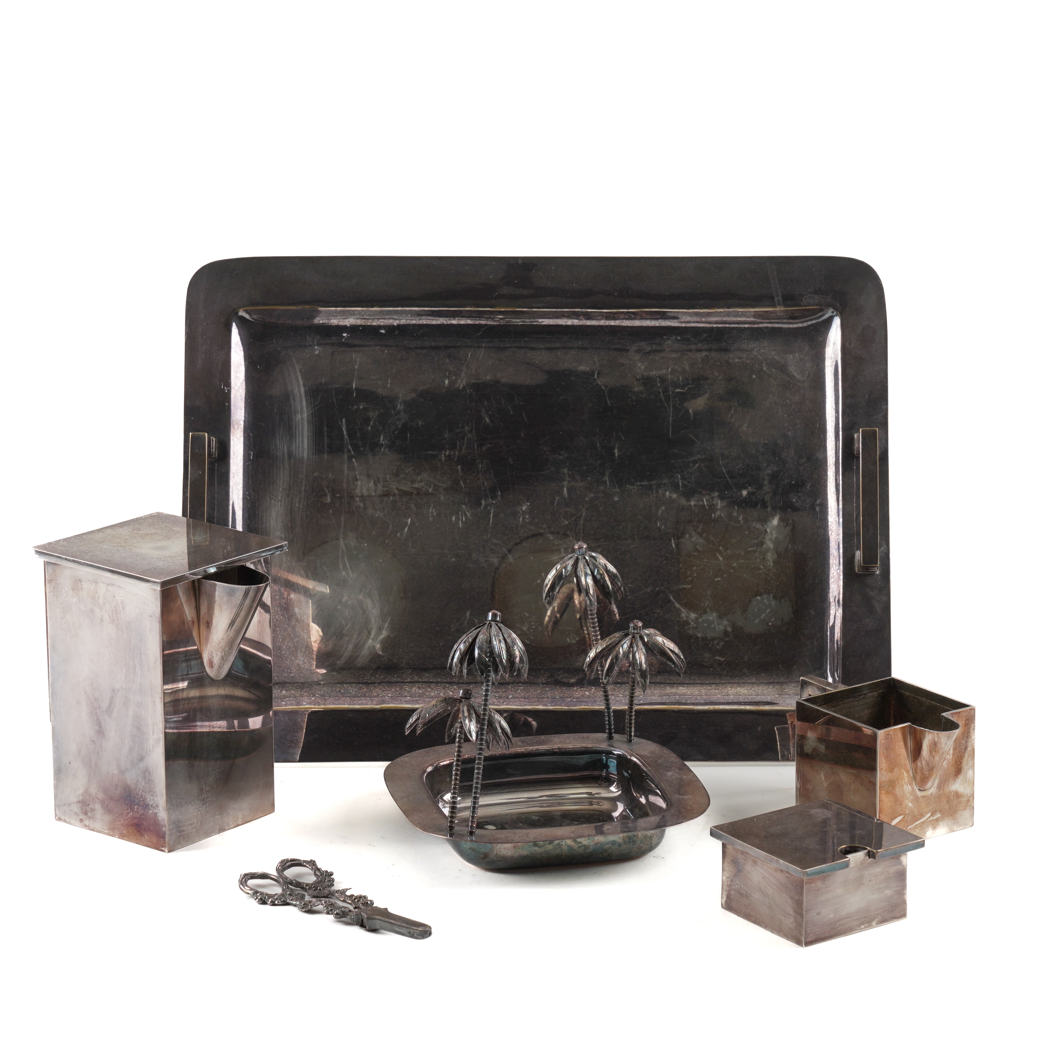 Comprising; a Portuguese three piece tea set with a twin handled tray, length of tray 47.7cm, a square dish, decorated with four palm trees and a pair of grape scissors