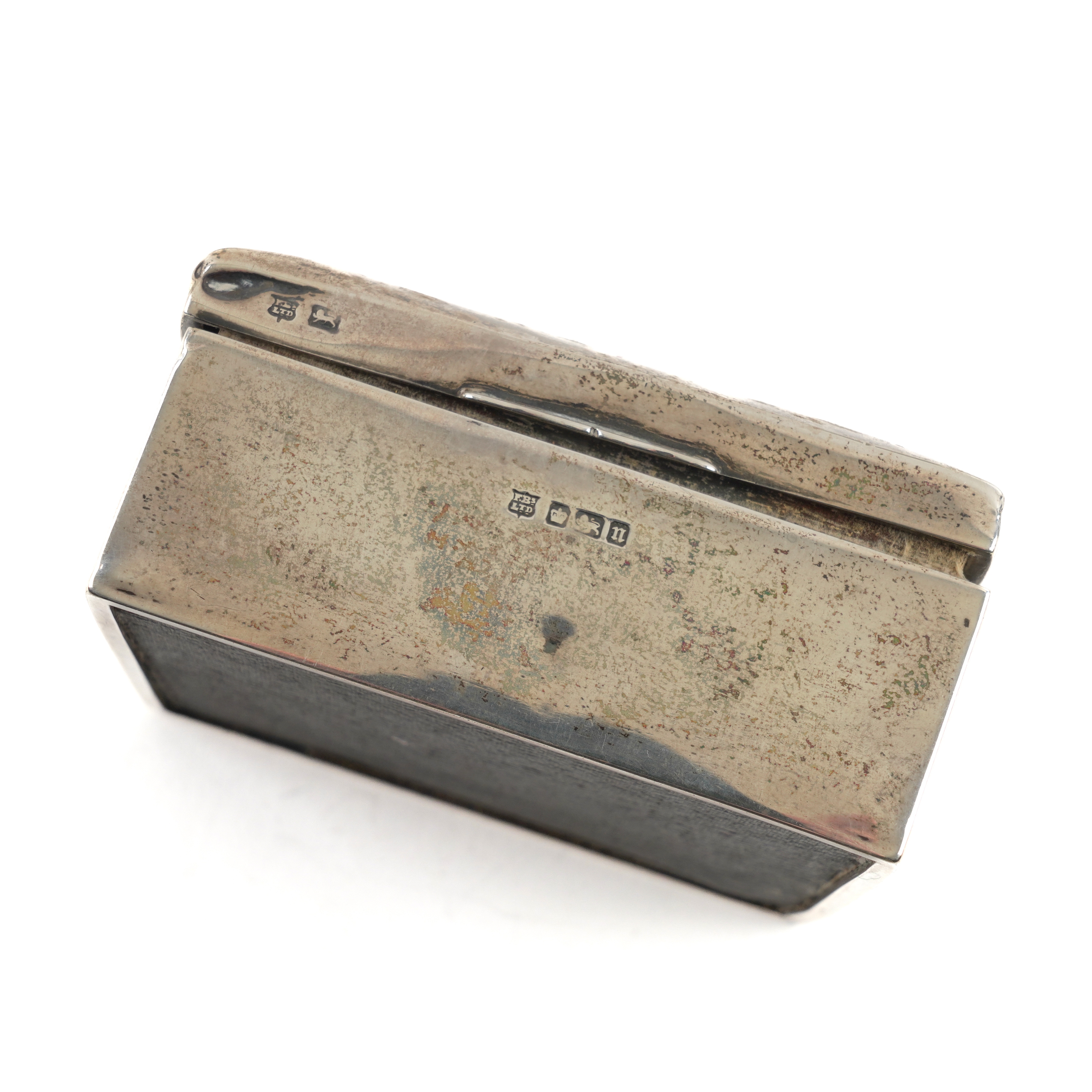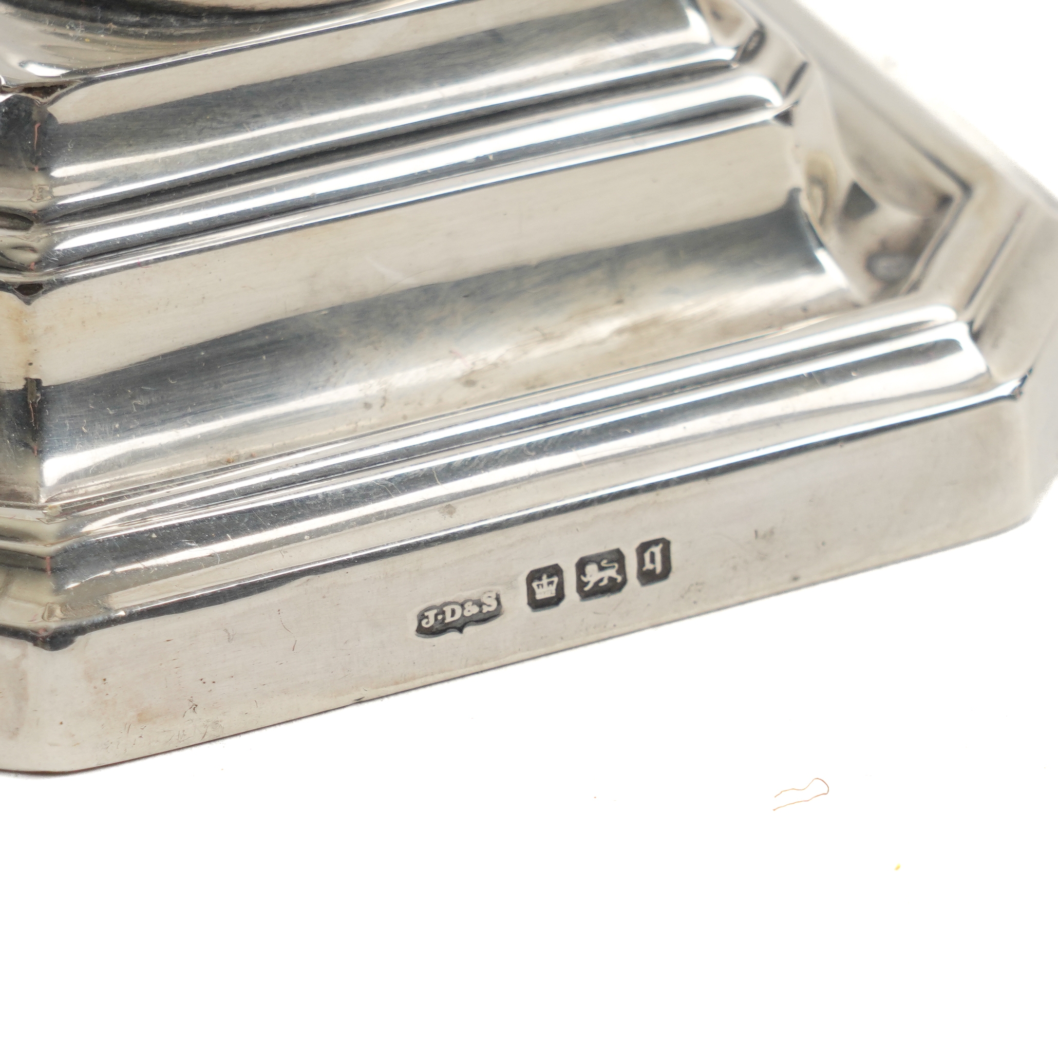 Comprising; a pair of candlesticks, Sheffield 1908, sample height 14cm, a capstan form inkwell, hallmark rubbed, diameter of base 12.5cm and a table cigarette box, wooden lined within, presentation inscribed, Sheffield 1905, all loaded
