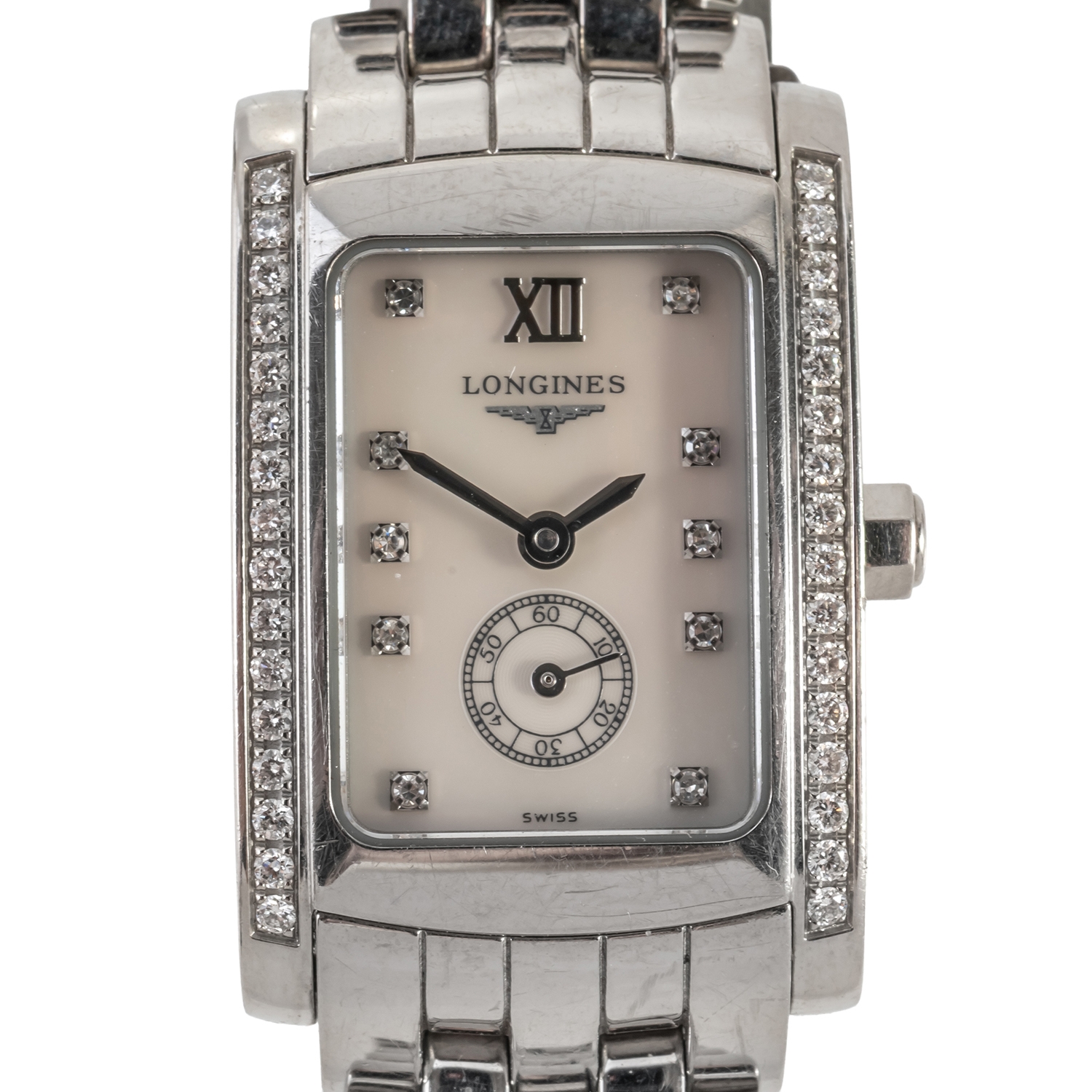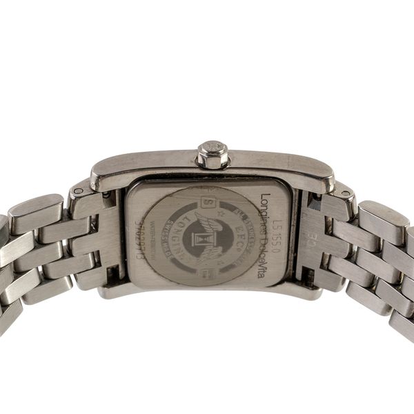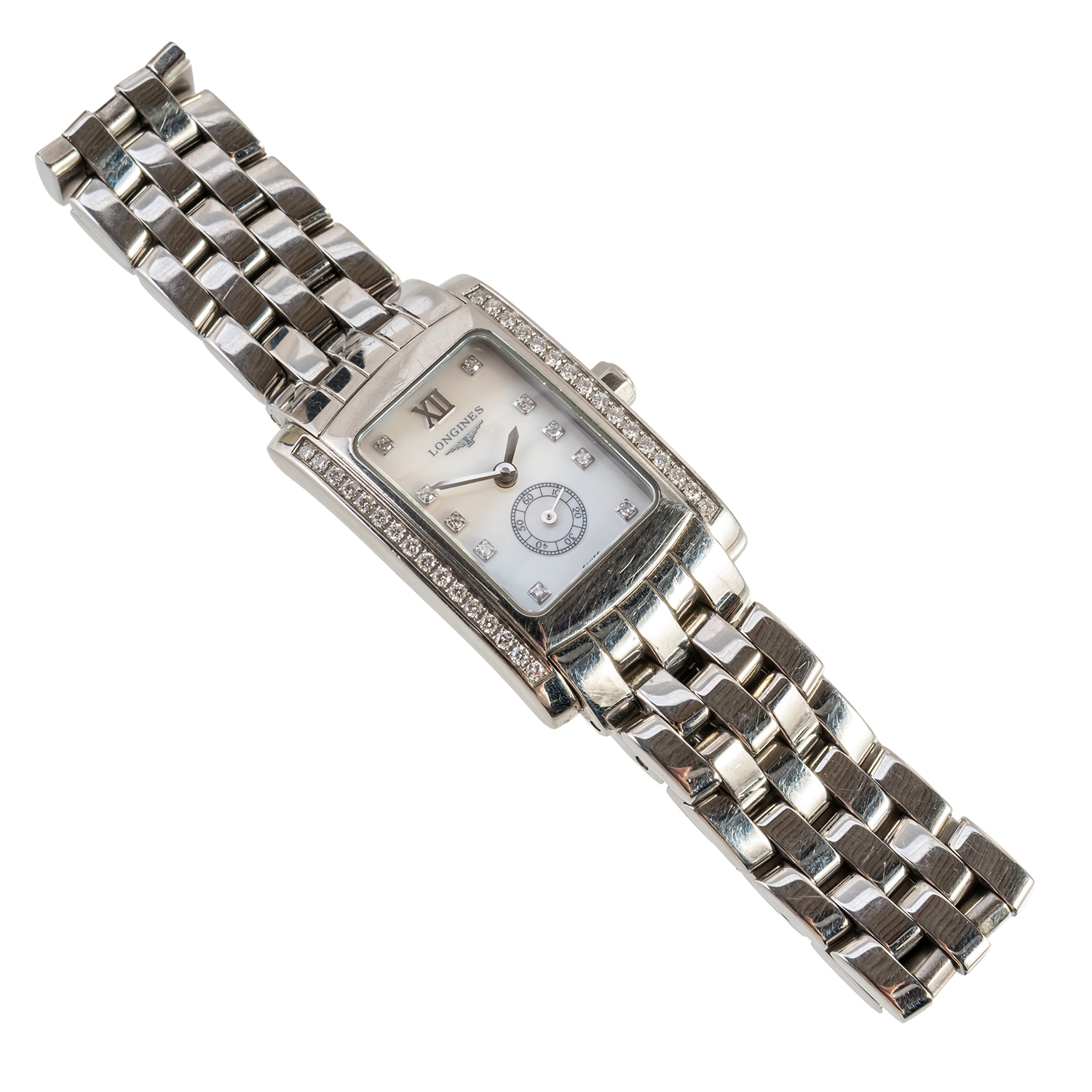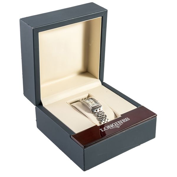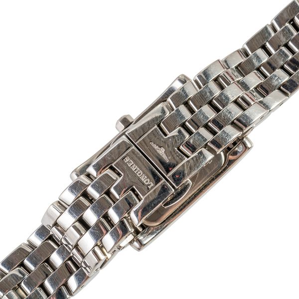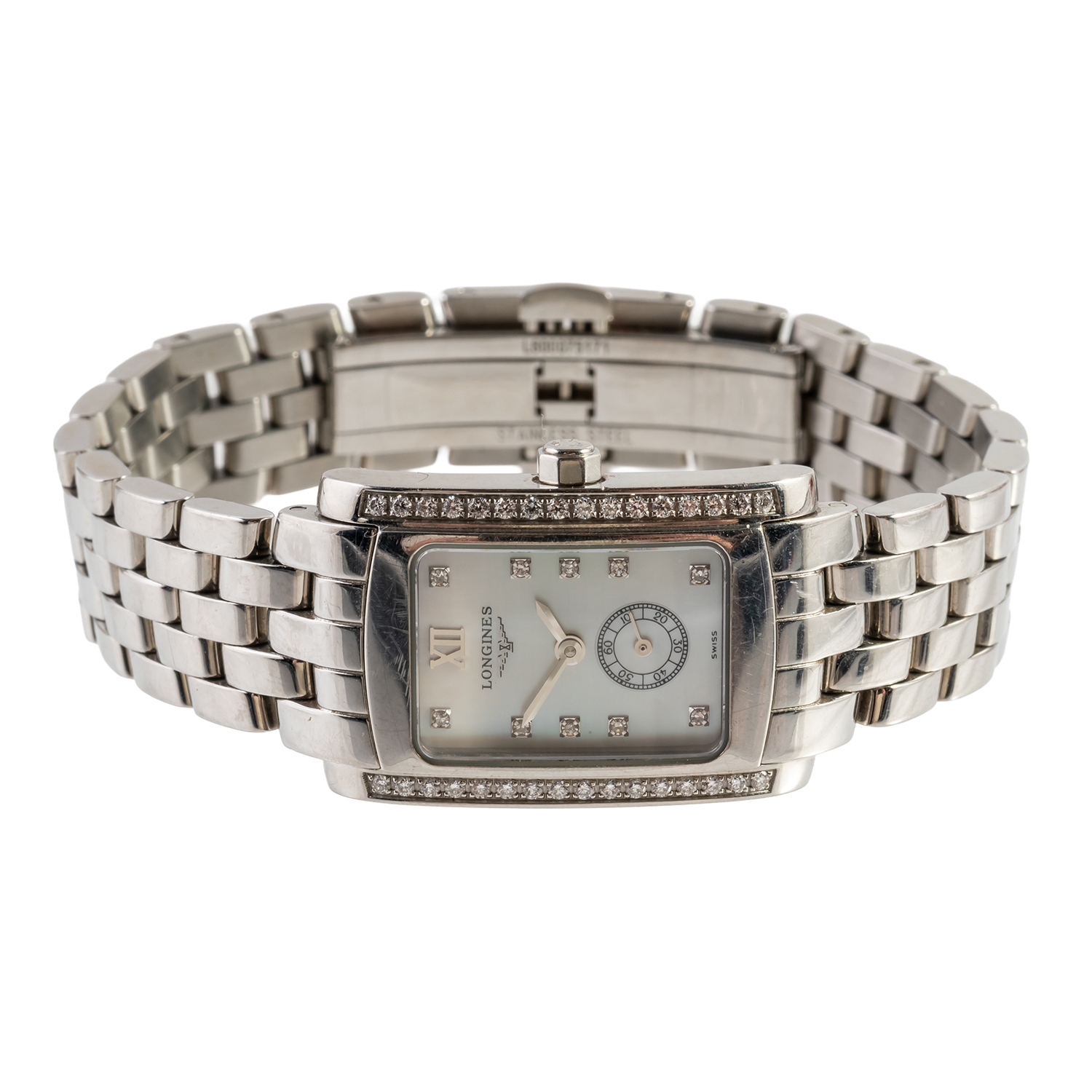 With rectangular signed mother of pearl dial, with diamond accents, with further diamonds set to each side of the face, on a stainless steel bracelet, the case back marked L5 155 0, with a quartz movement, with box