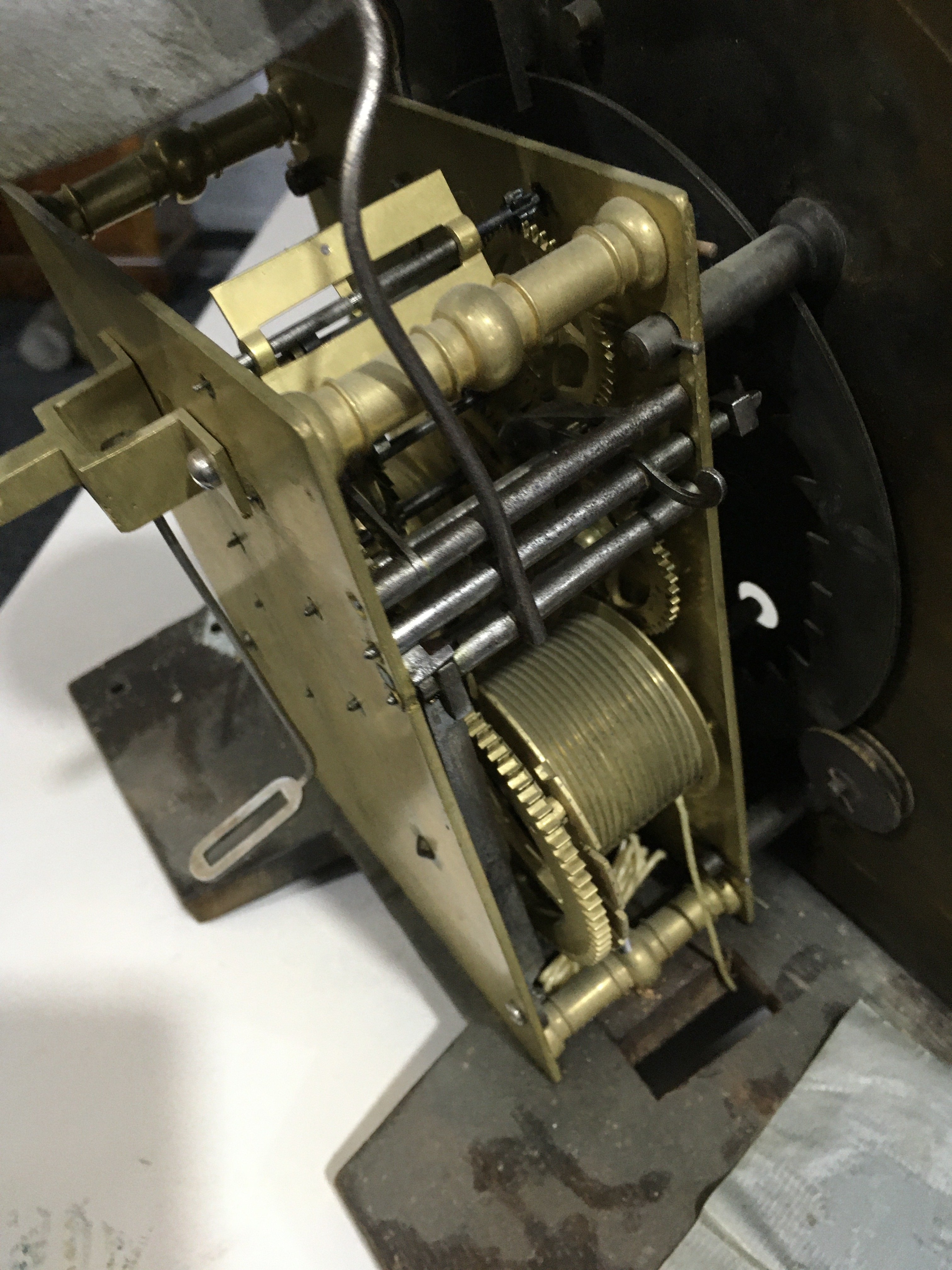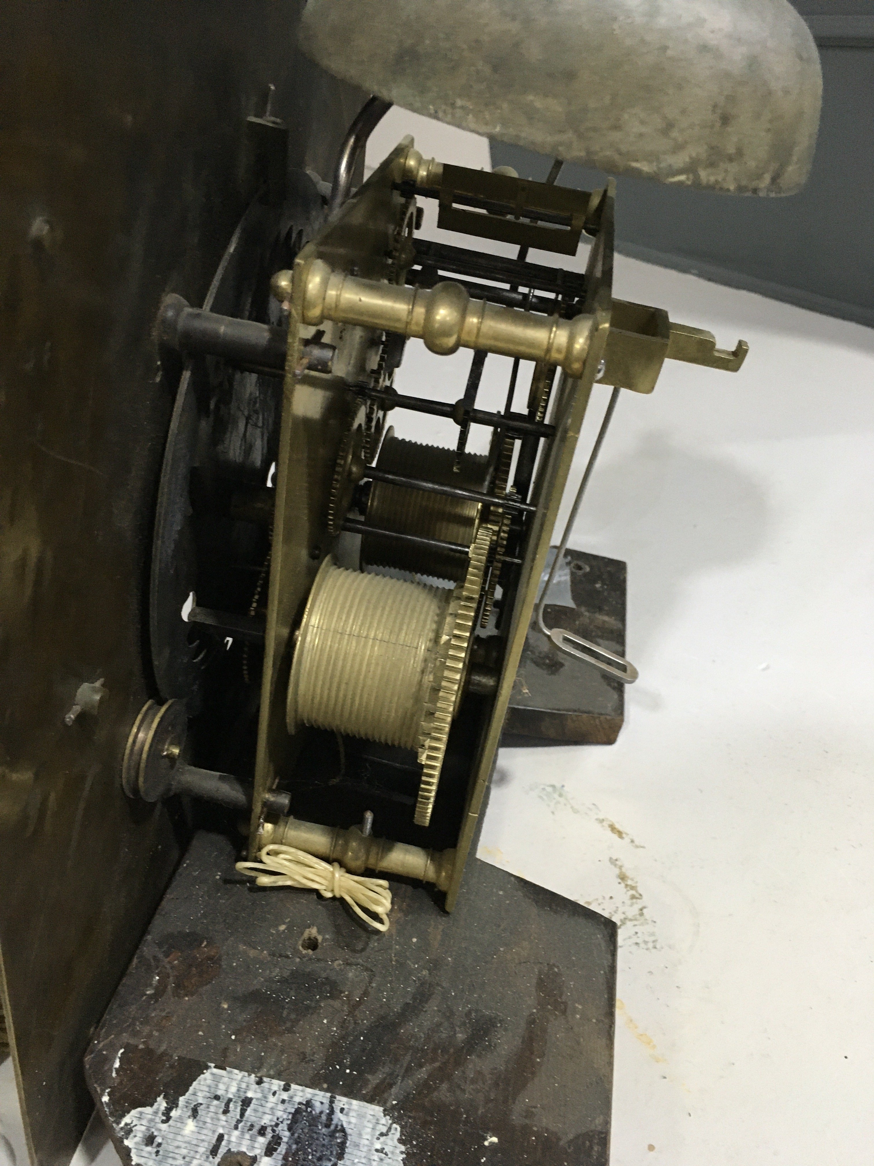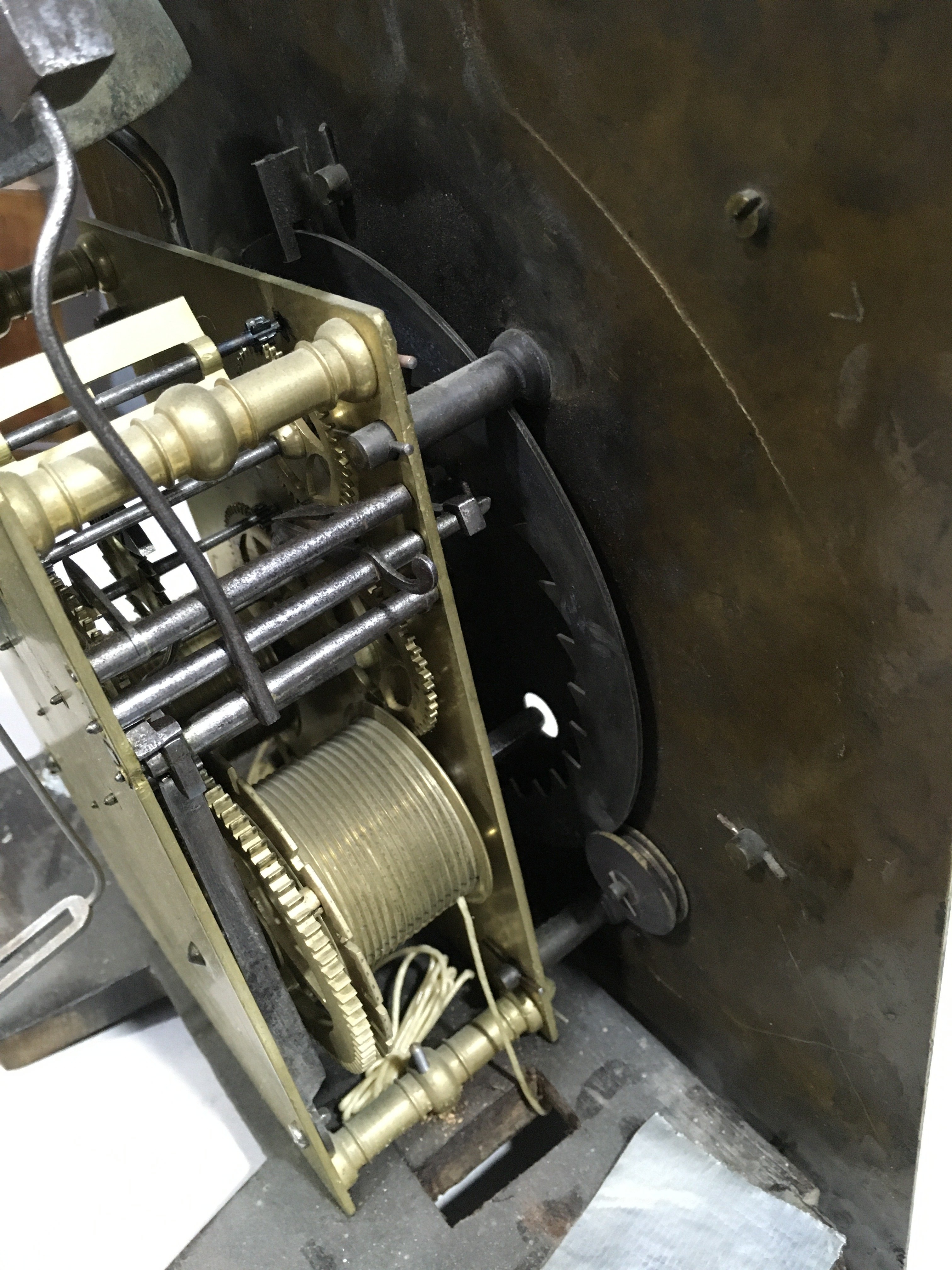 With brass bob pendulum.  Two brass-cased weights (not matching).  The case has been subject to extensive restoration and re-veneering.  The dial and movement are associated to each other and to the case.  Some new elements.  With a crank key.