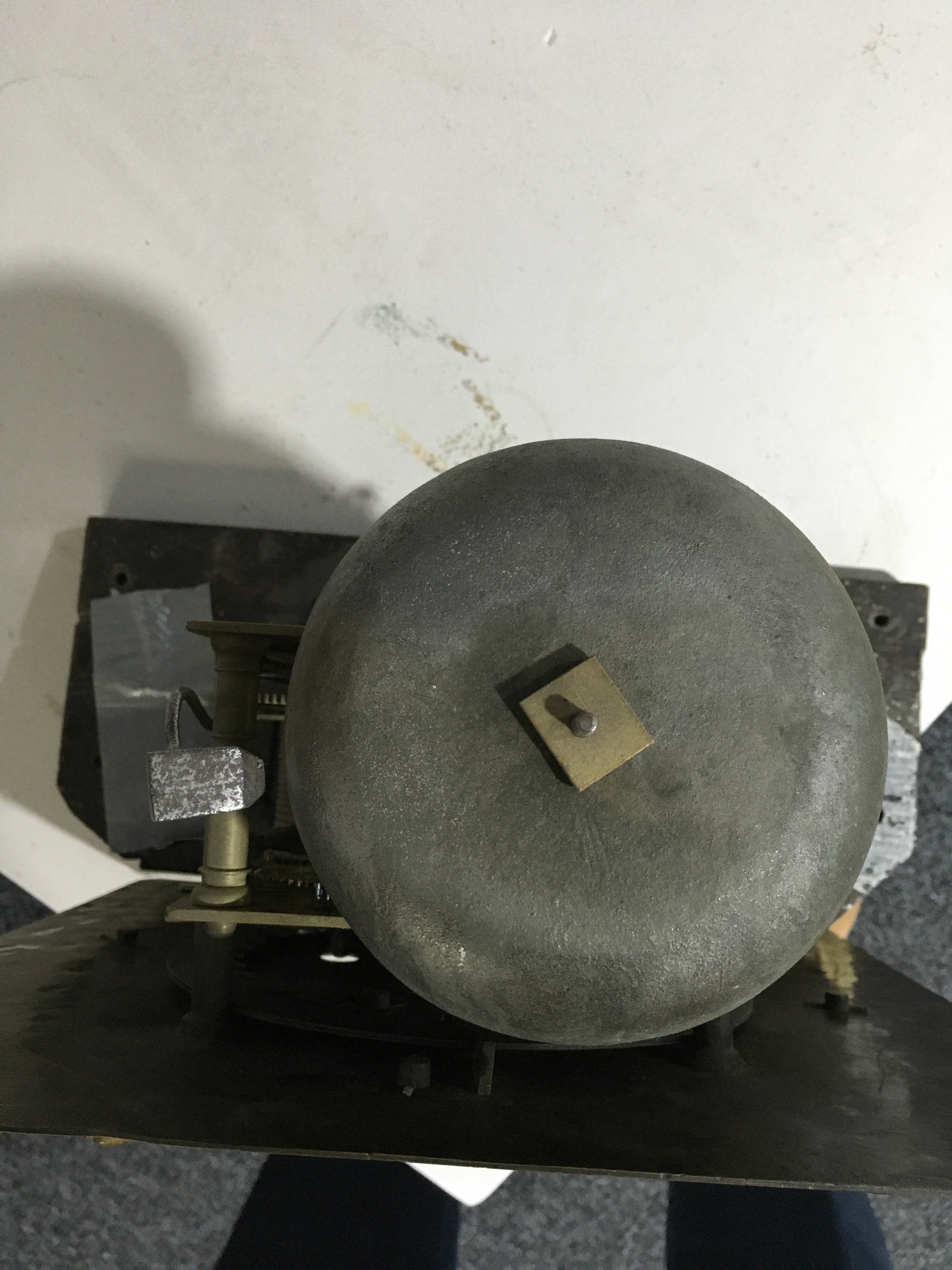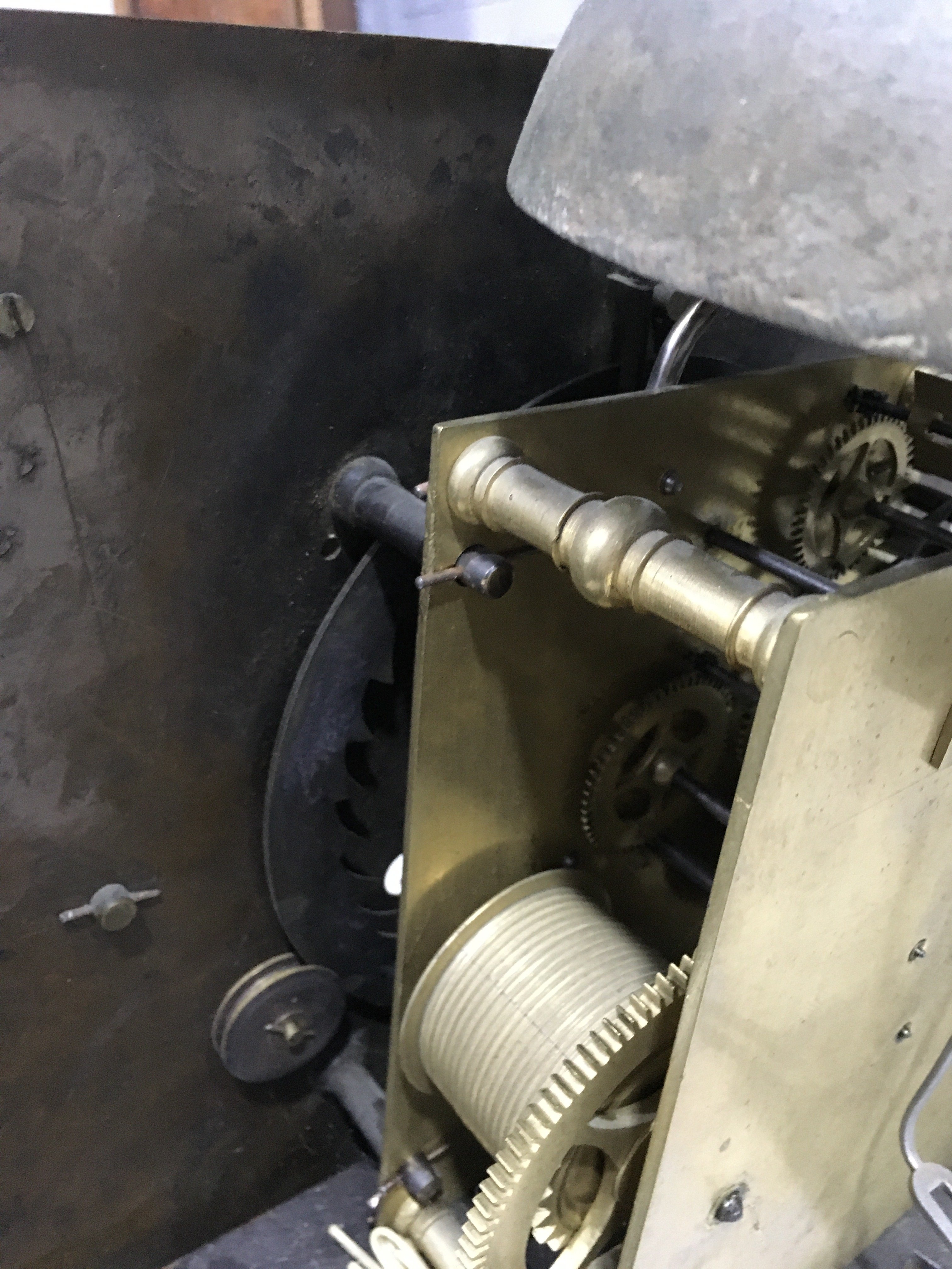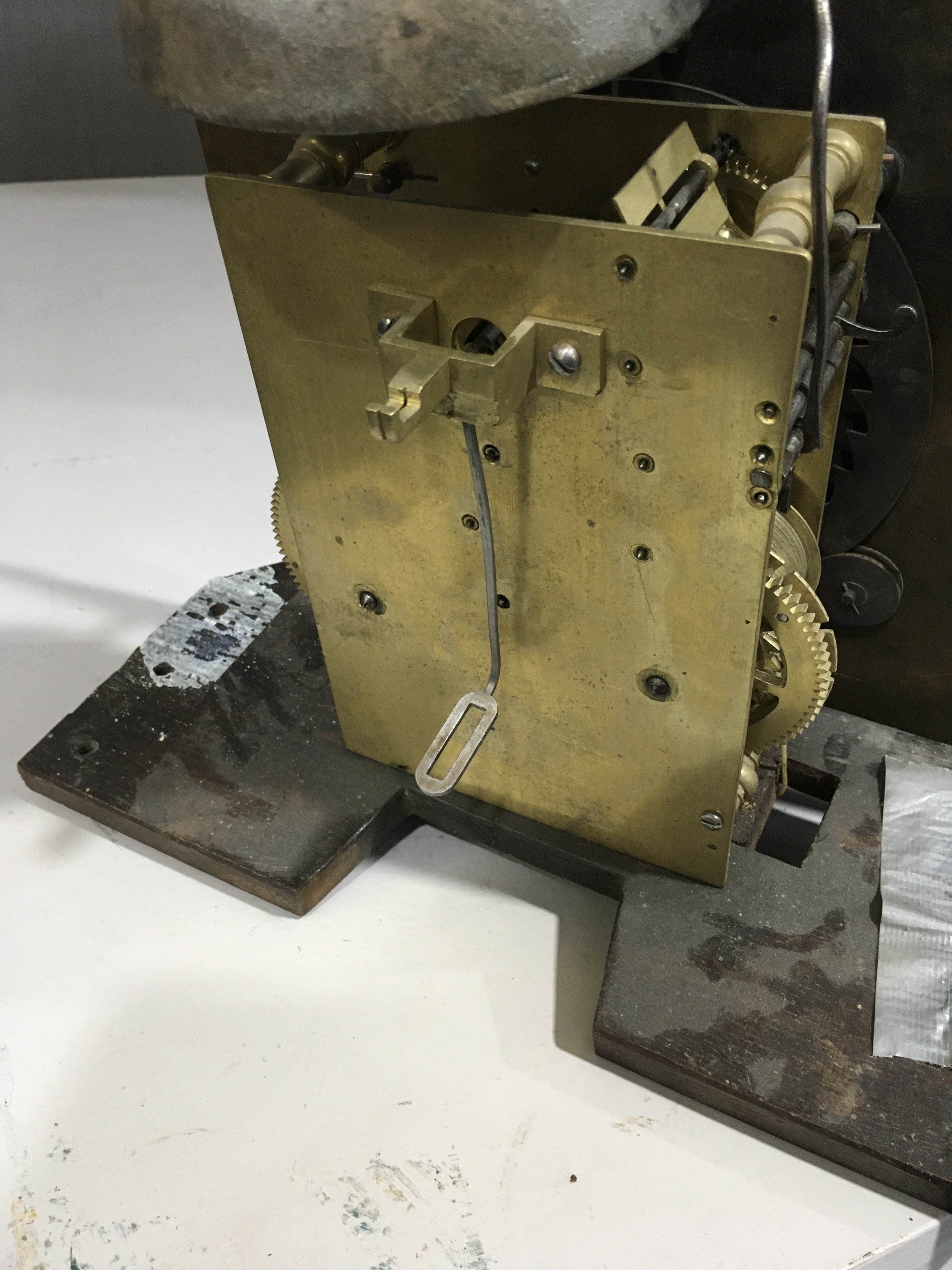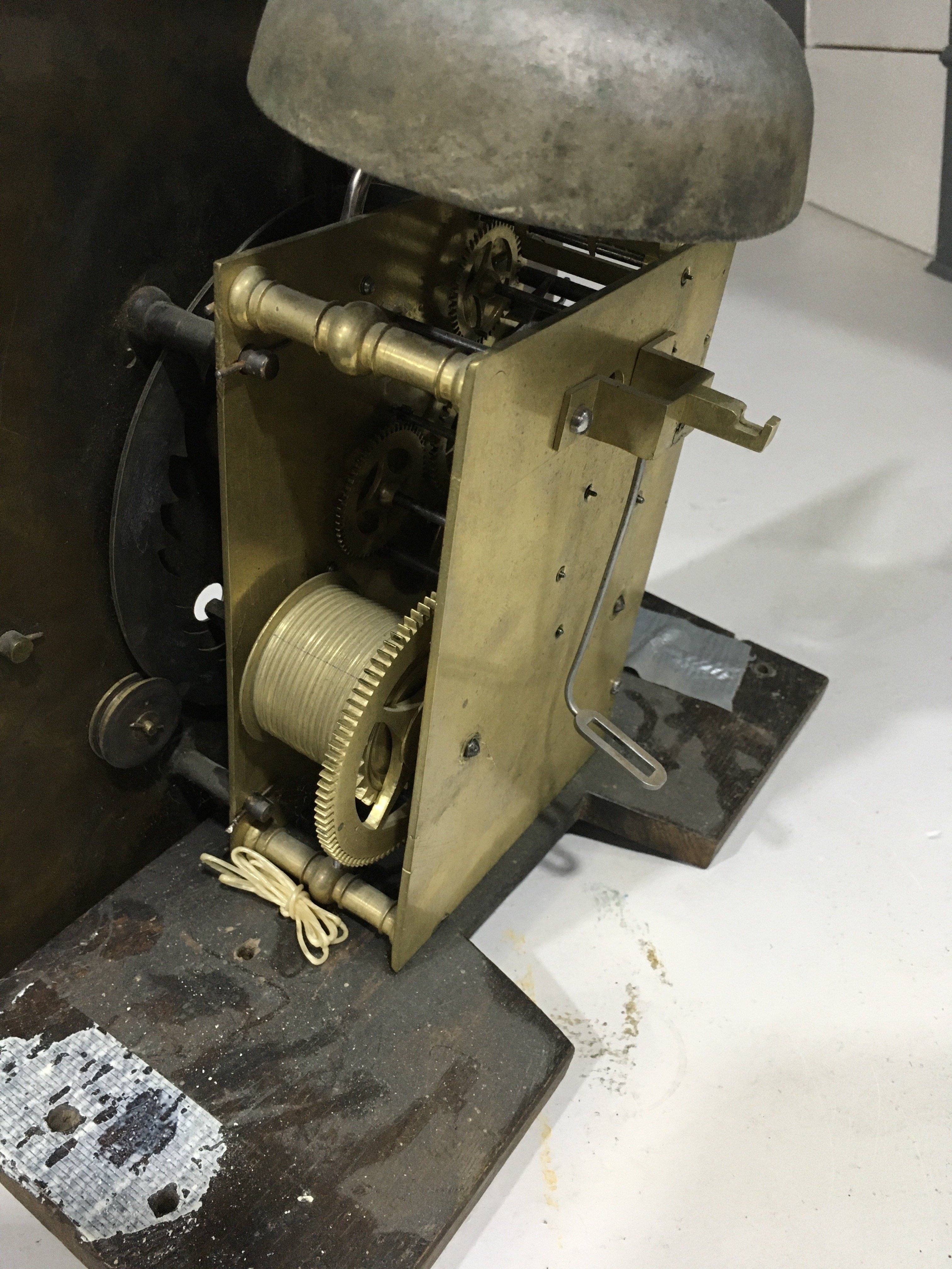 With brass bob pendulum.  Two brass-cased weights (not matching).  The case has been subject to extensive restoration and re-veneering.  The dial and movement are associated to each other and to the case.  Some new elements.  With a crank key.