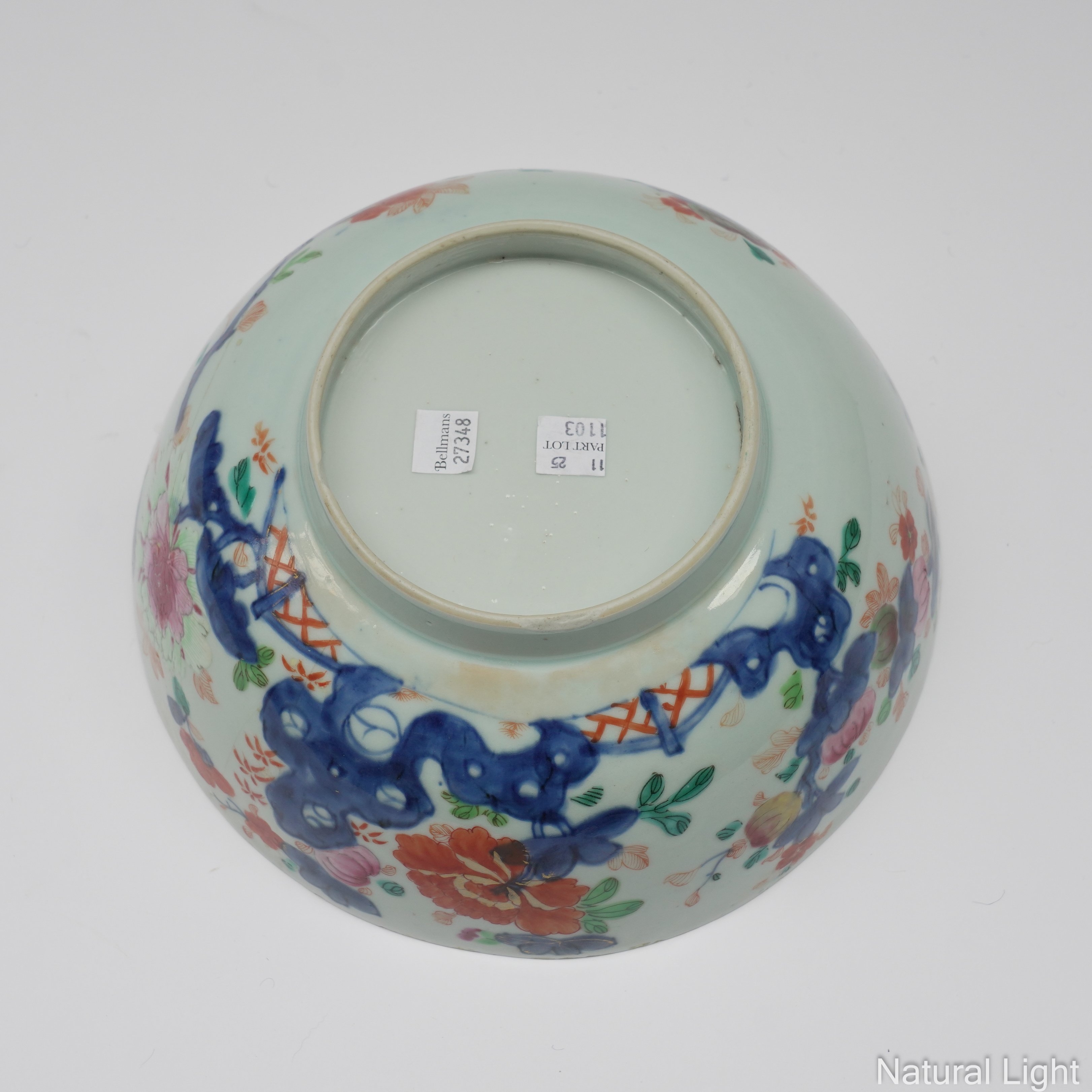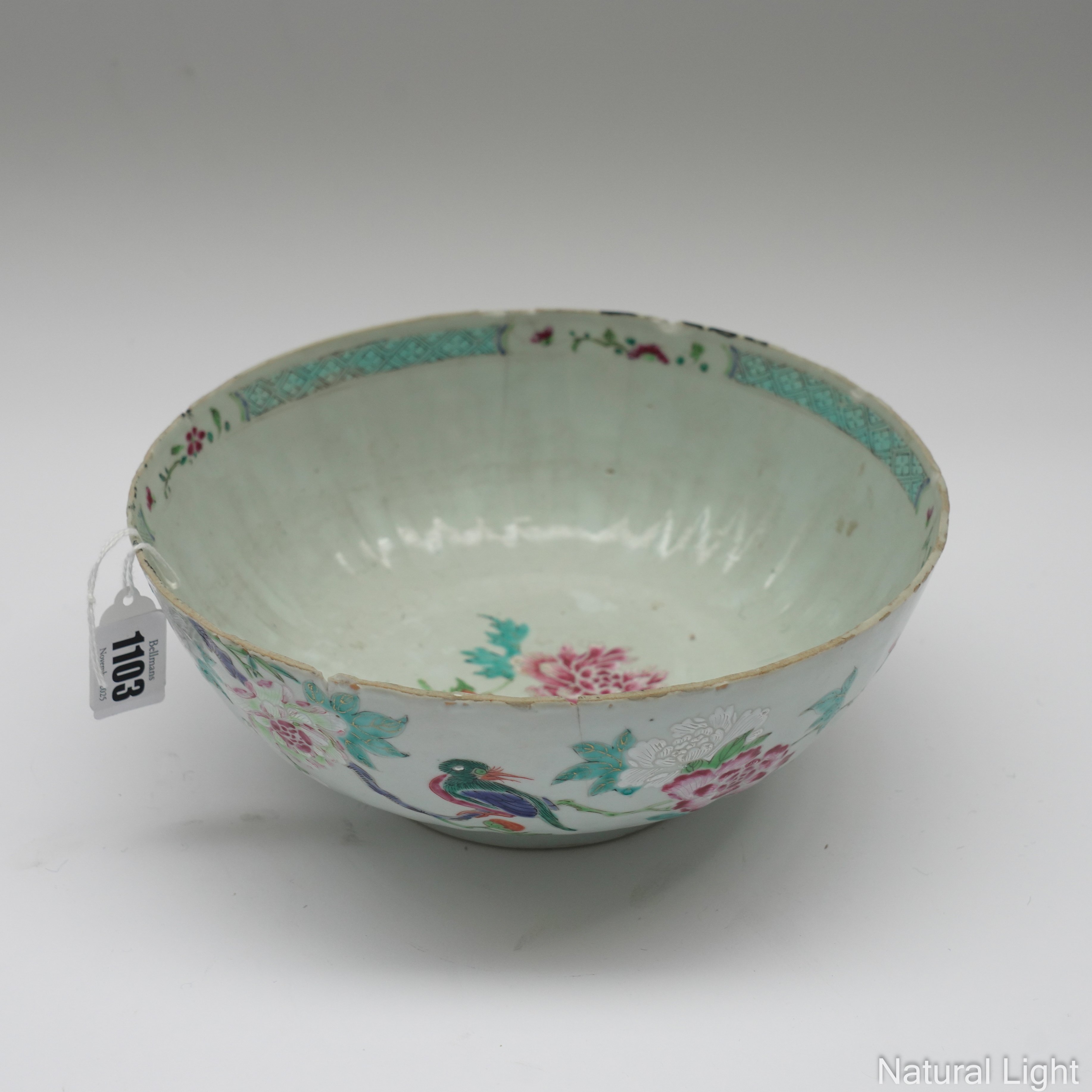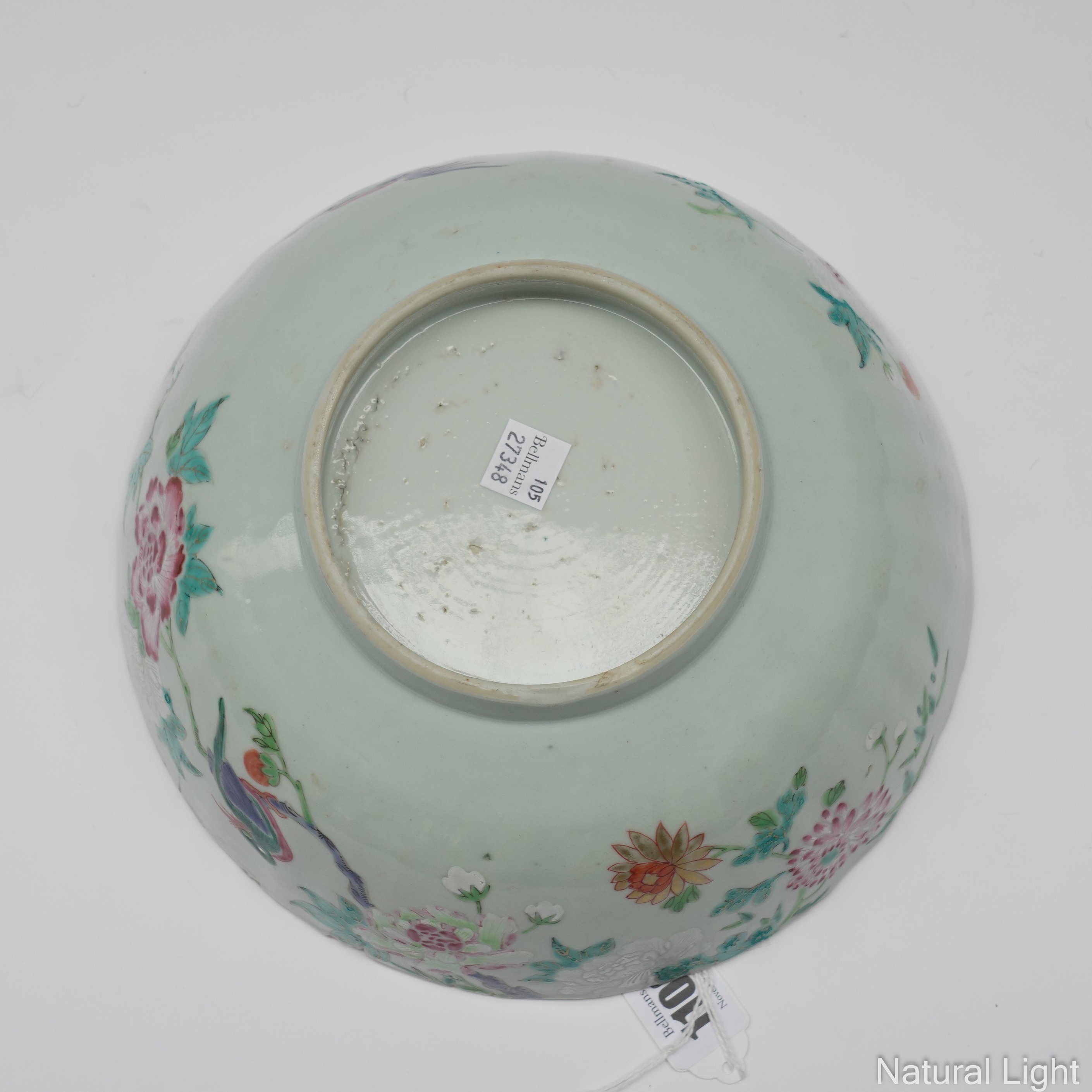 Painted in polychrome enamels with exotic birds and flowers, 23cm diameter; together with a Chinese Imari and famille rose porcelain bowl decorated with flowers and gourds, 24cm diameter and a famille rose blue-ground bowl reserved with three flower panels, 26.5cm diameter