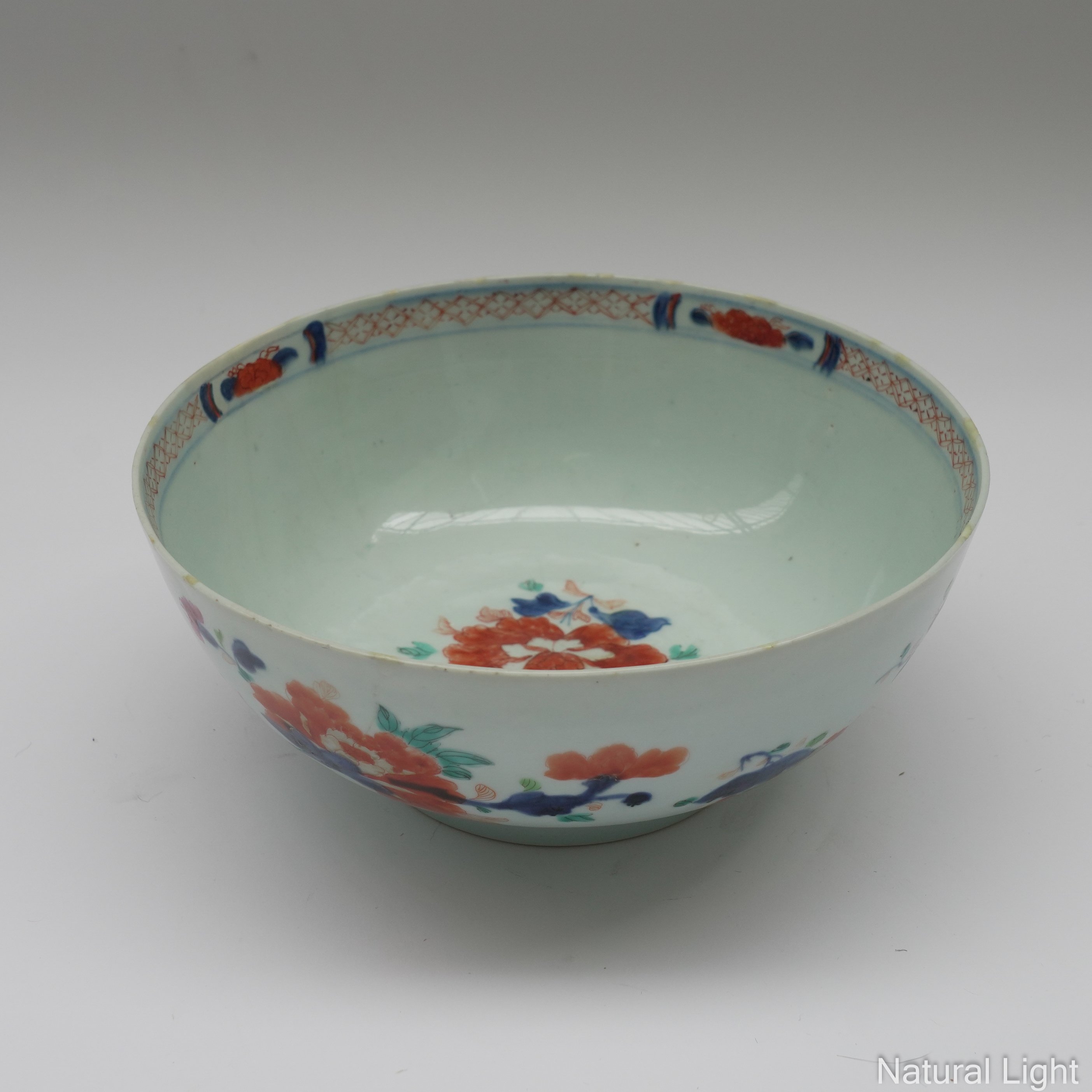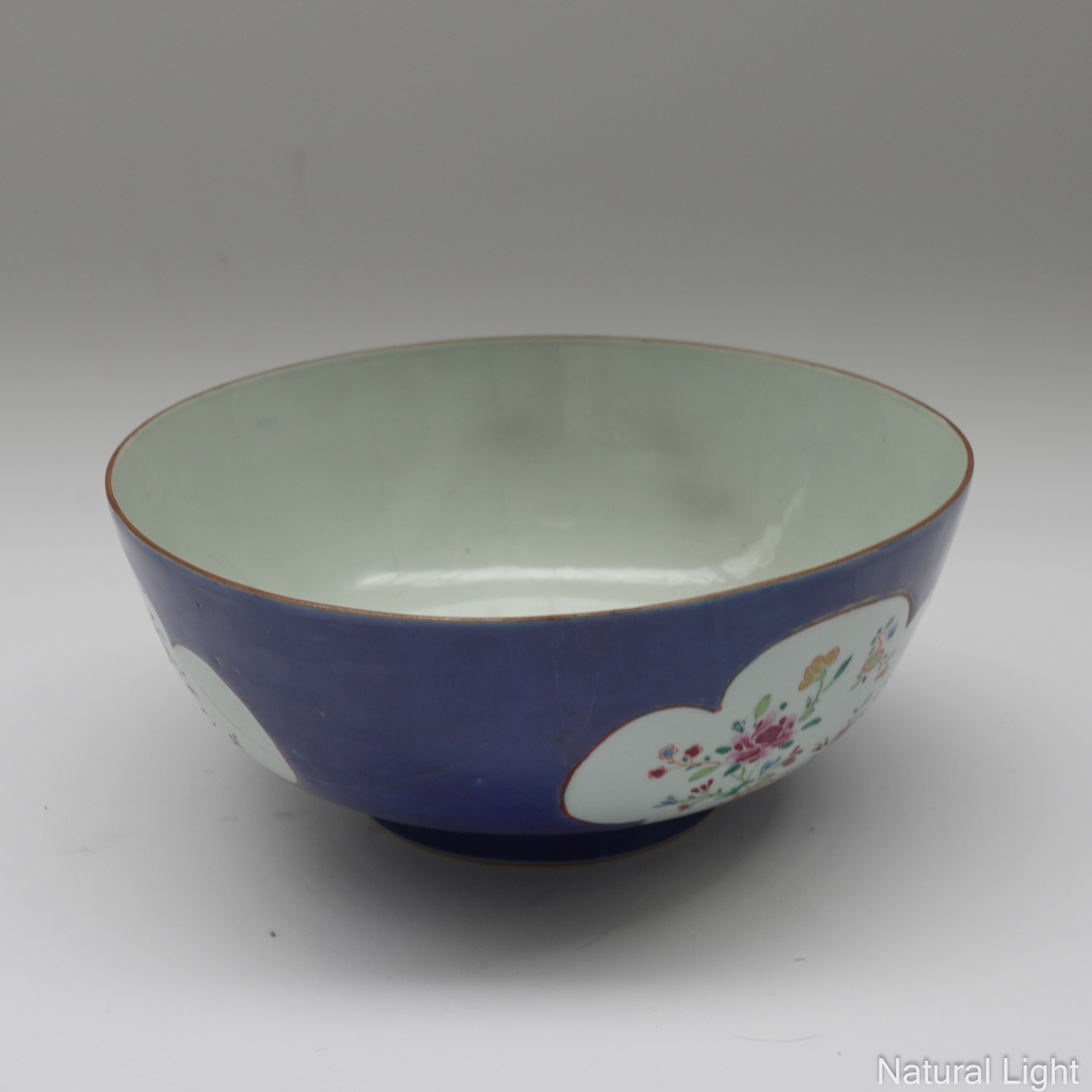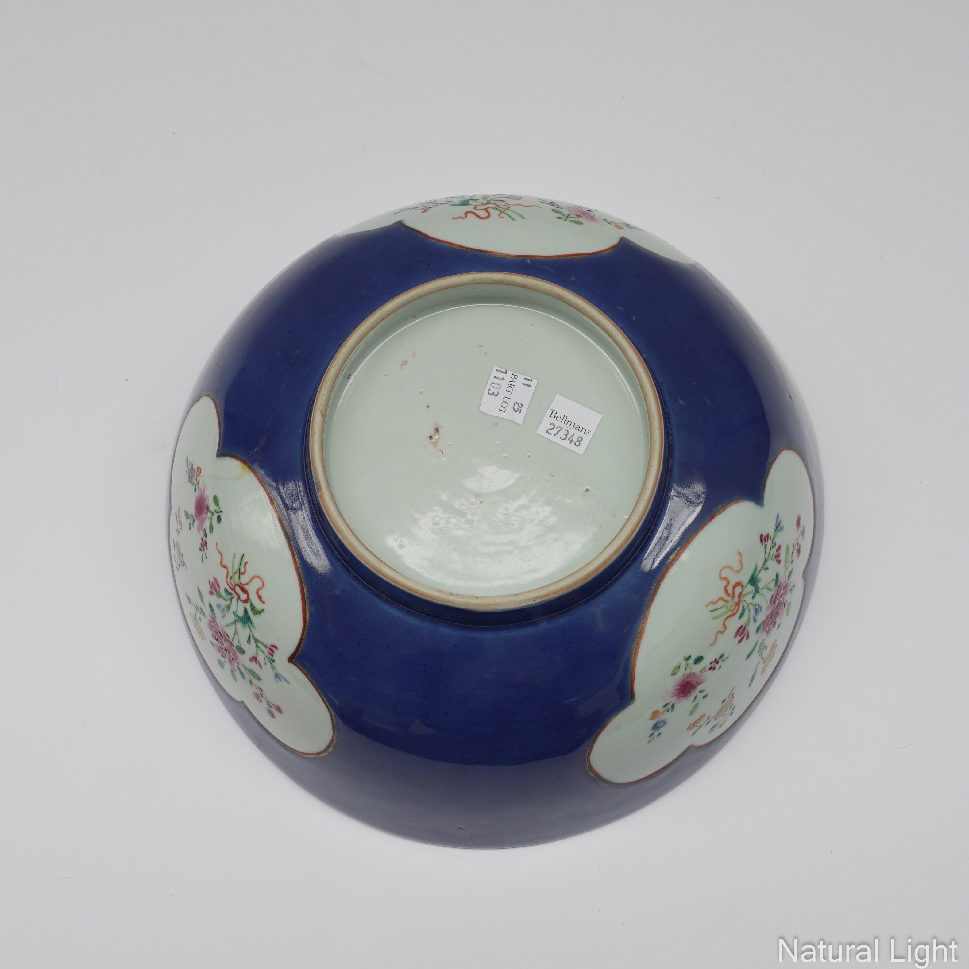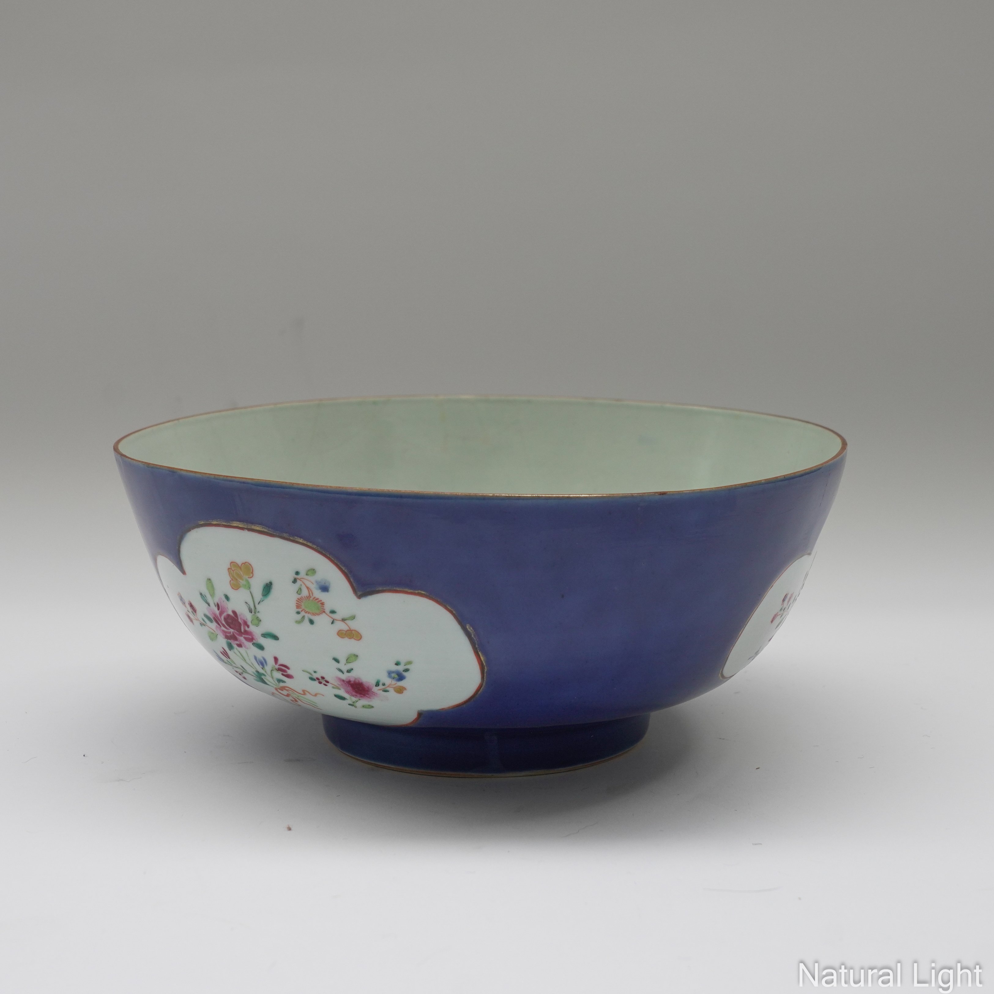 Painted in polychrome enamels with exotic birds and flowers, 23cm diameter; together with a Chinese Imari and famille rose porcelain bowl decorated with flowers and gourds, 24cm diameter and a famille rose blue-ground bowl reserved with three flower panels, 26.5cm diameter