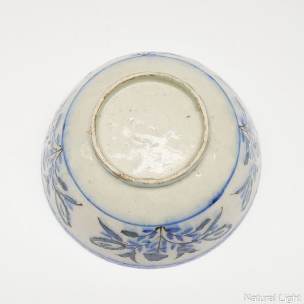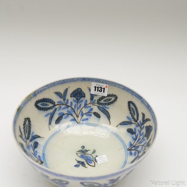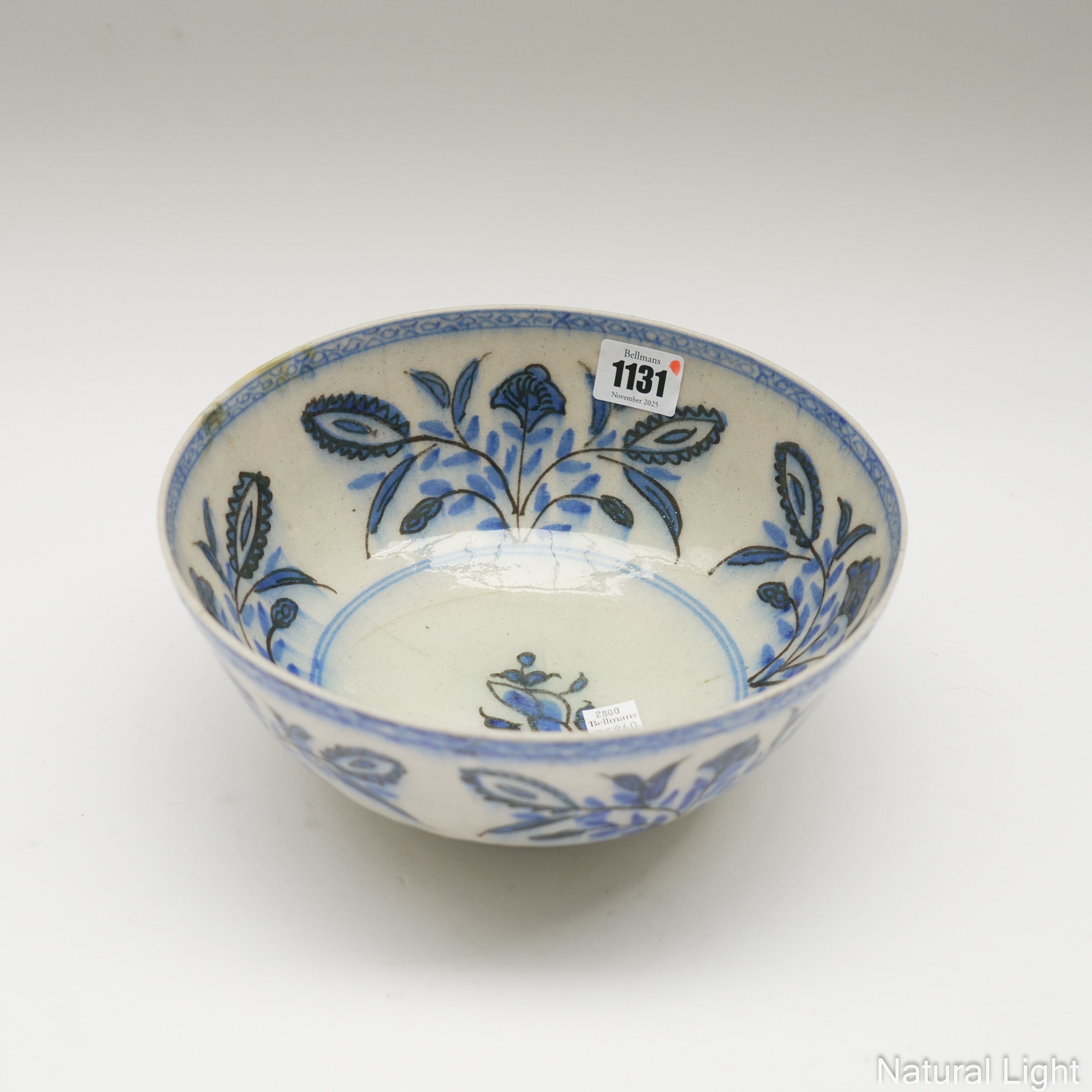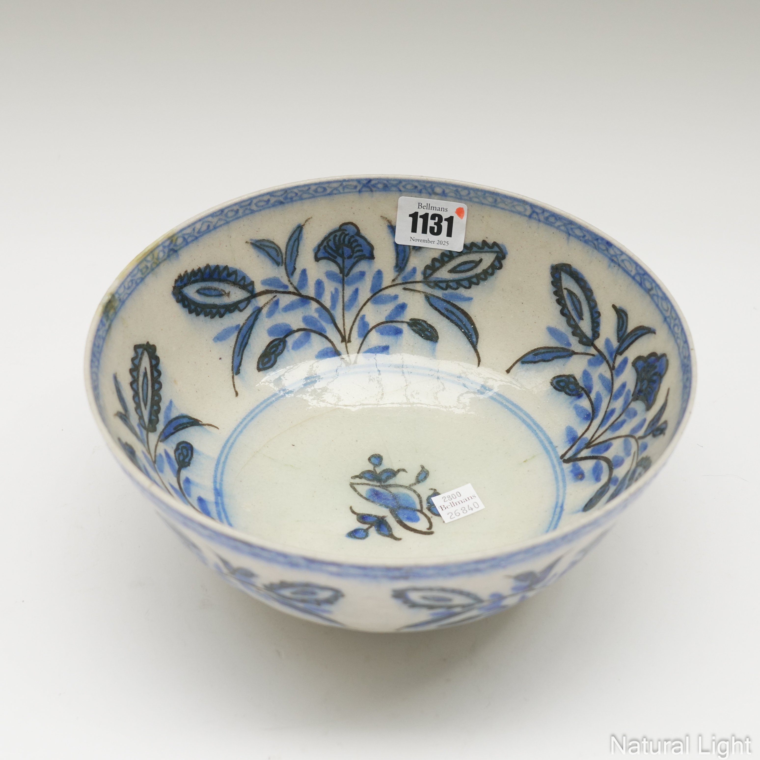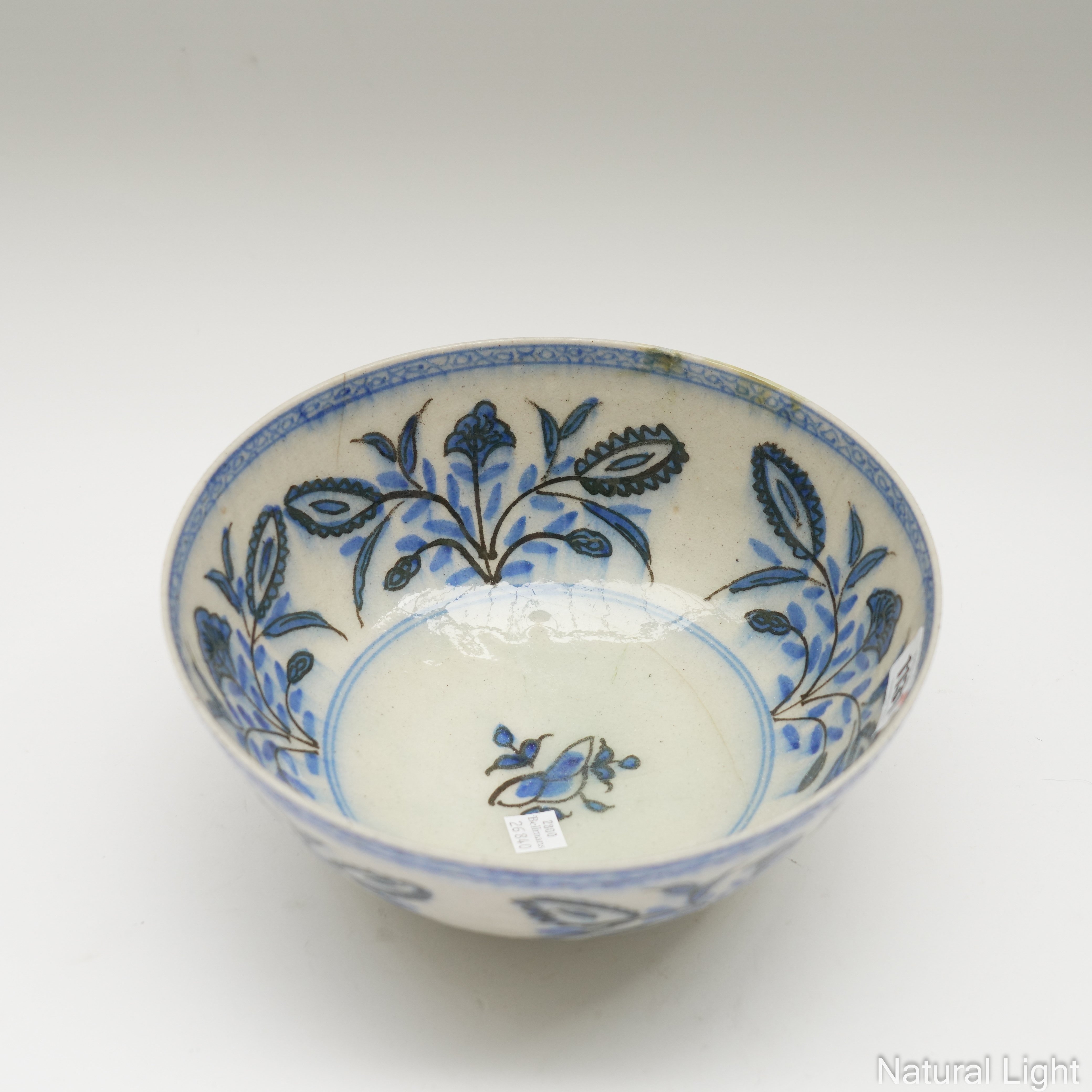 Underglaze painted fritware with cobalt blue and black floral decoration to both interior and exterior, 23cm diameter