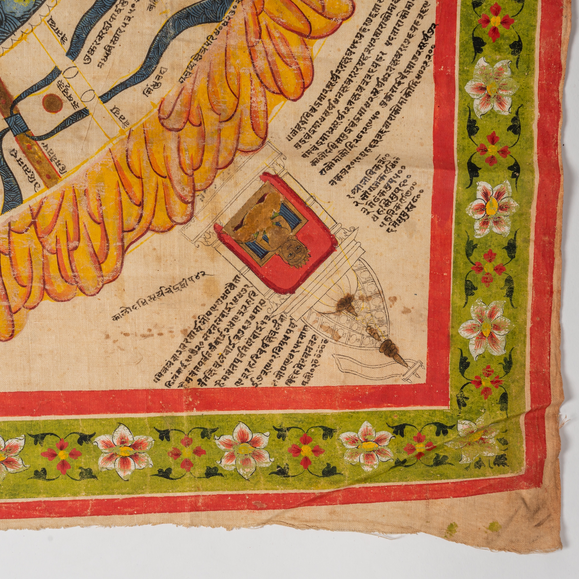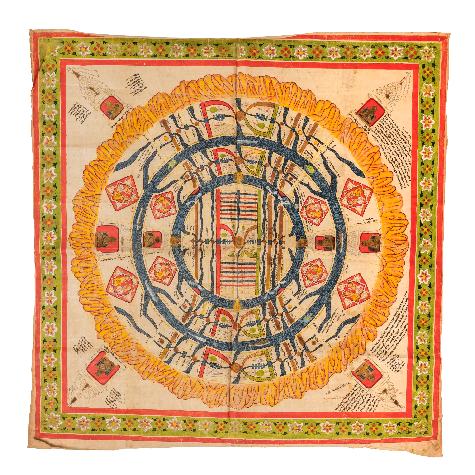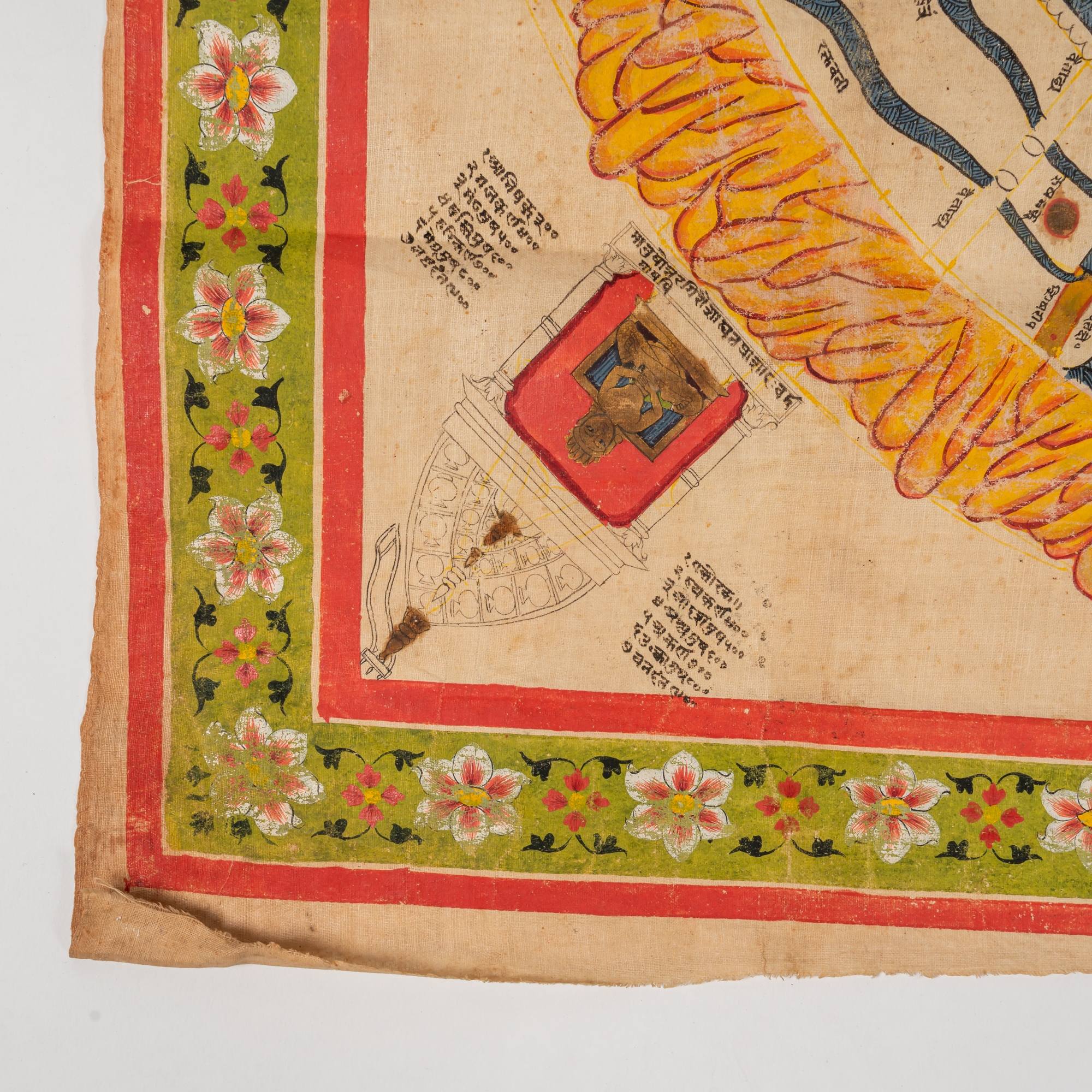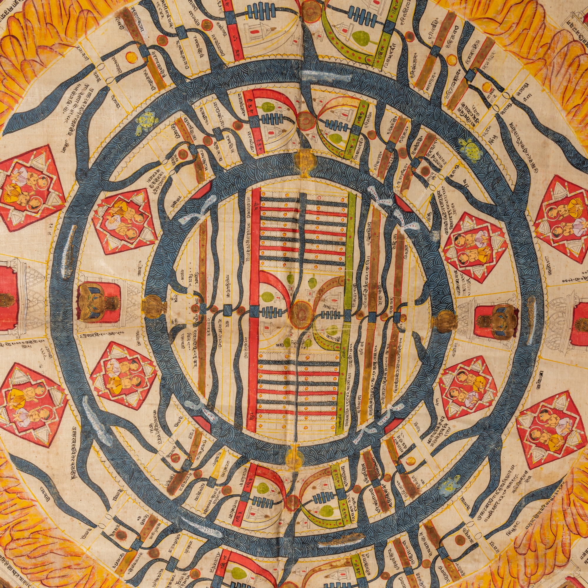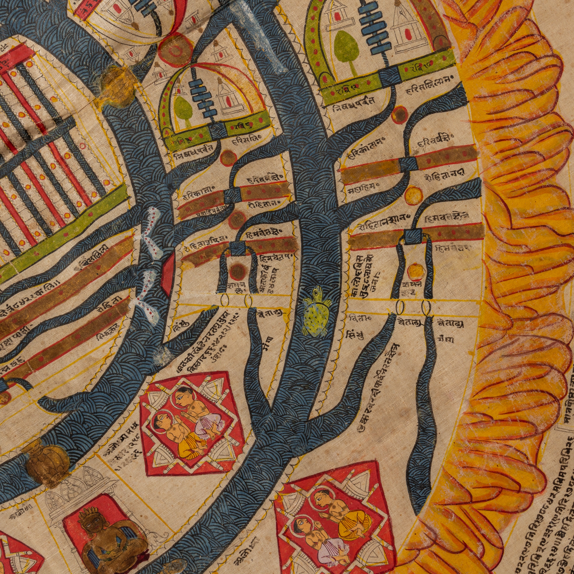 Depicting concentric islands divided by rivers and fringed with a mountain range interspersed throughout with various figures and shrines each labelled in devenagari script, floral border along the edges, 68cm by 70cm approx.