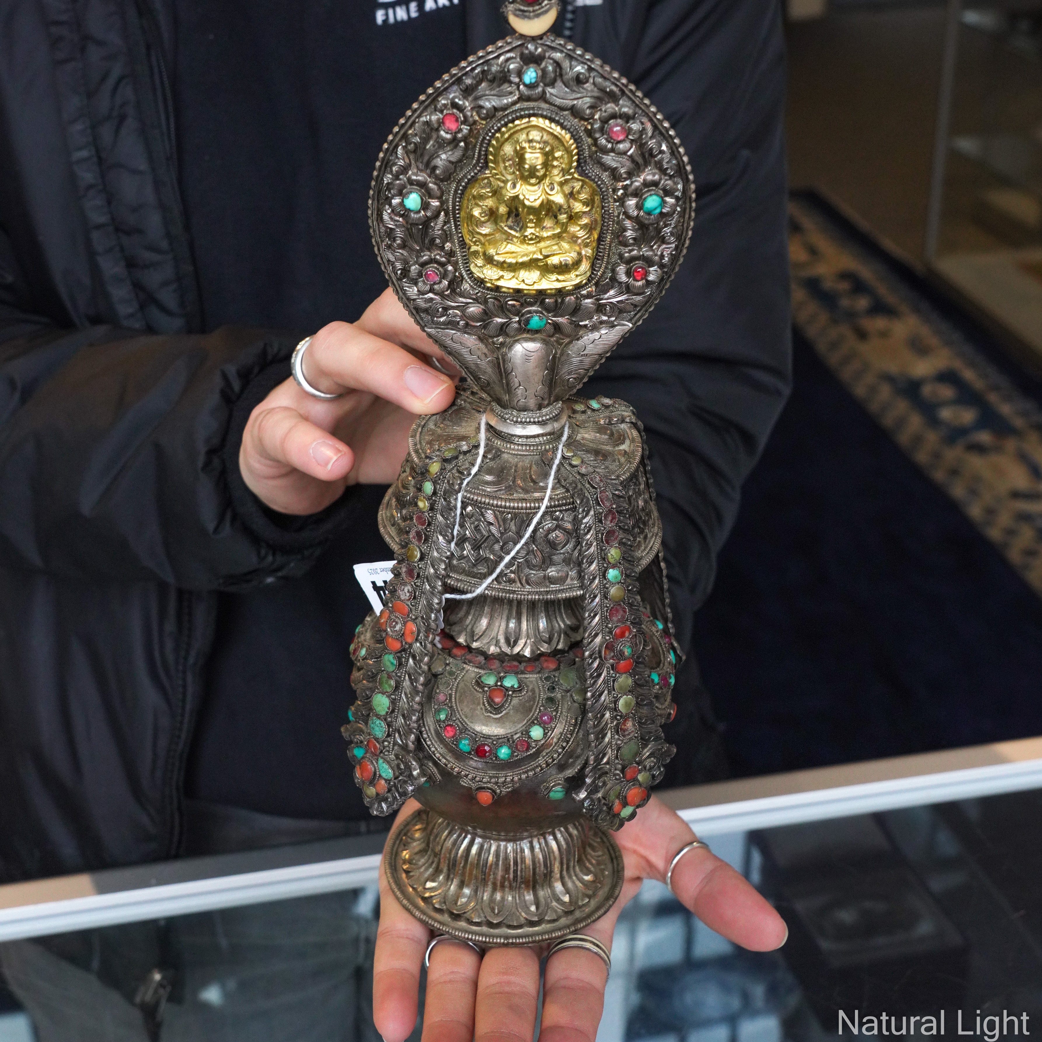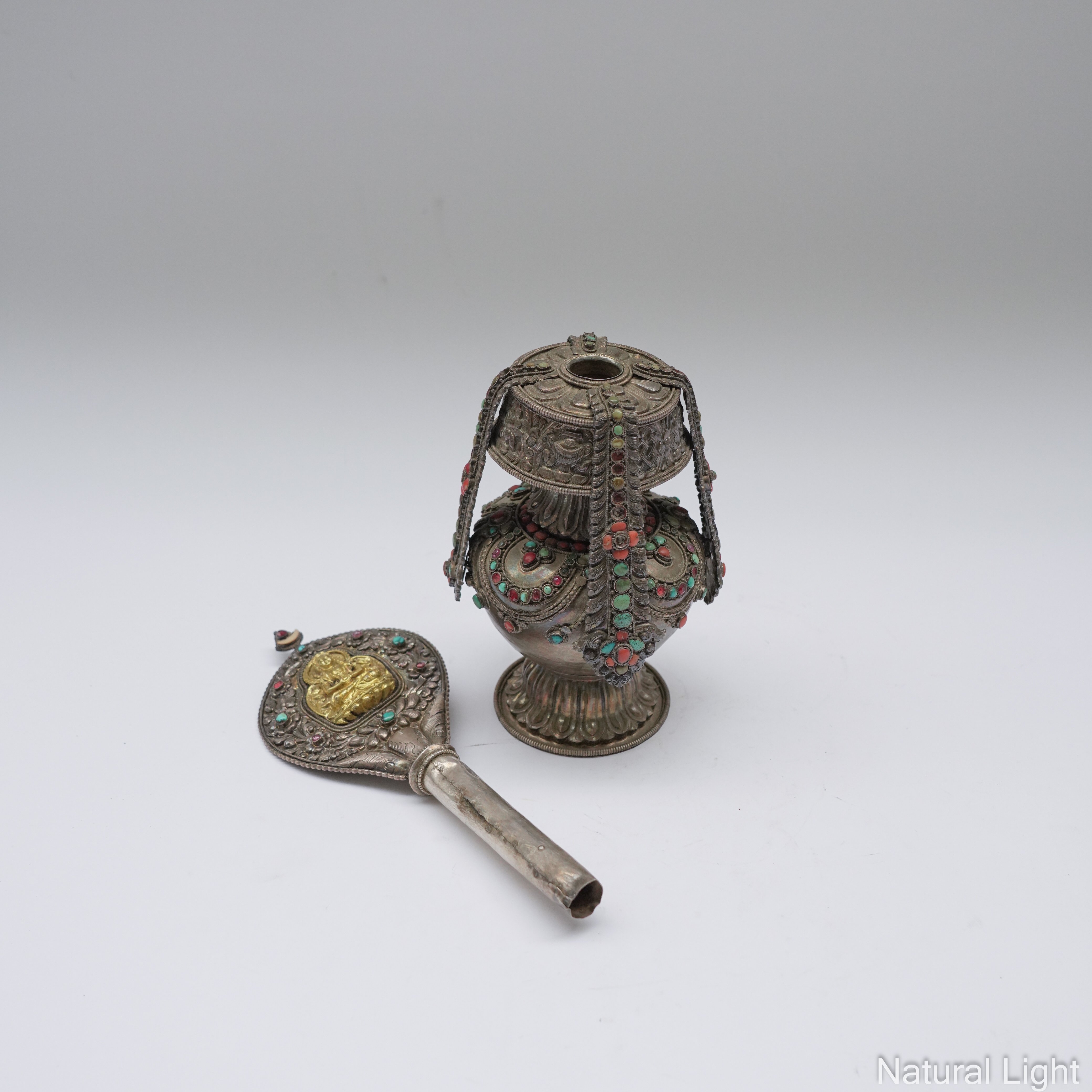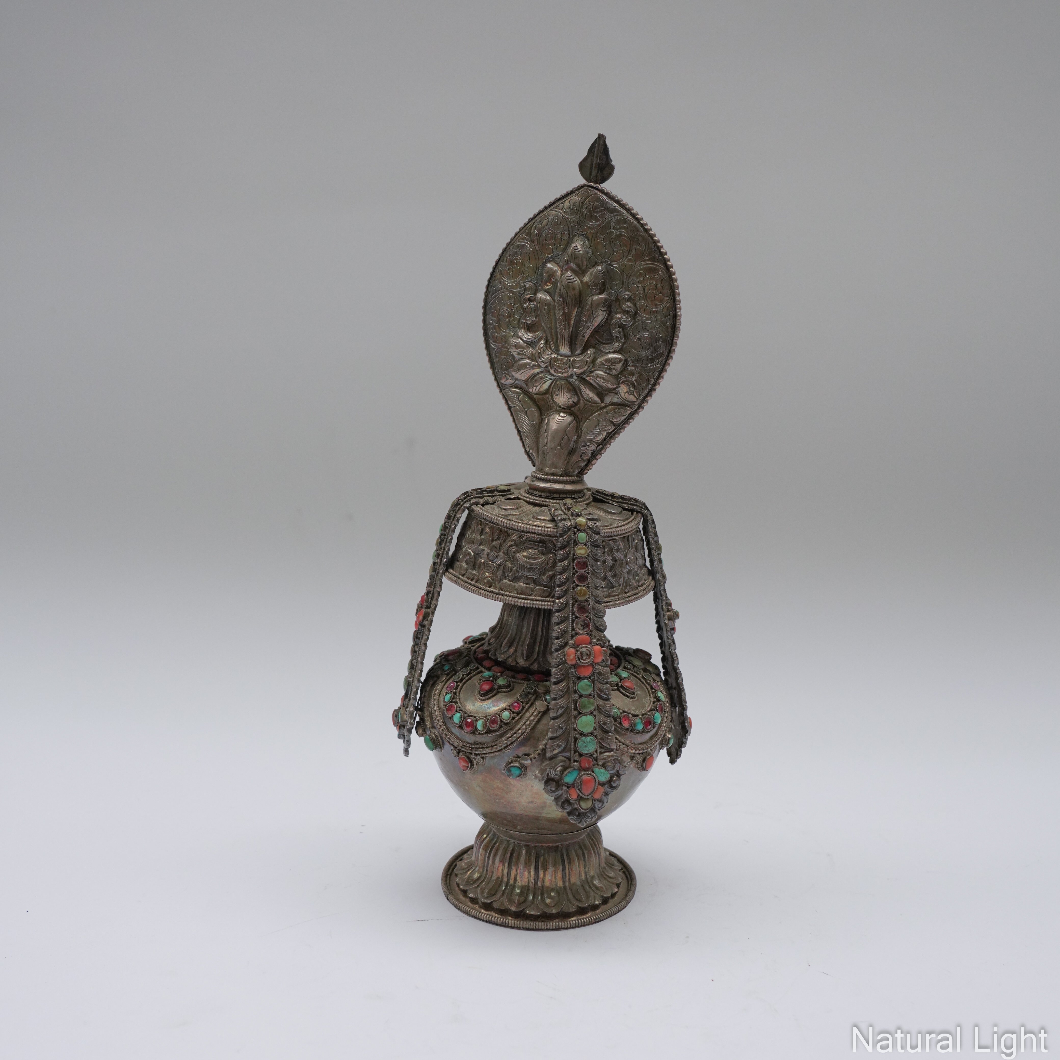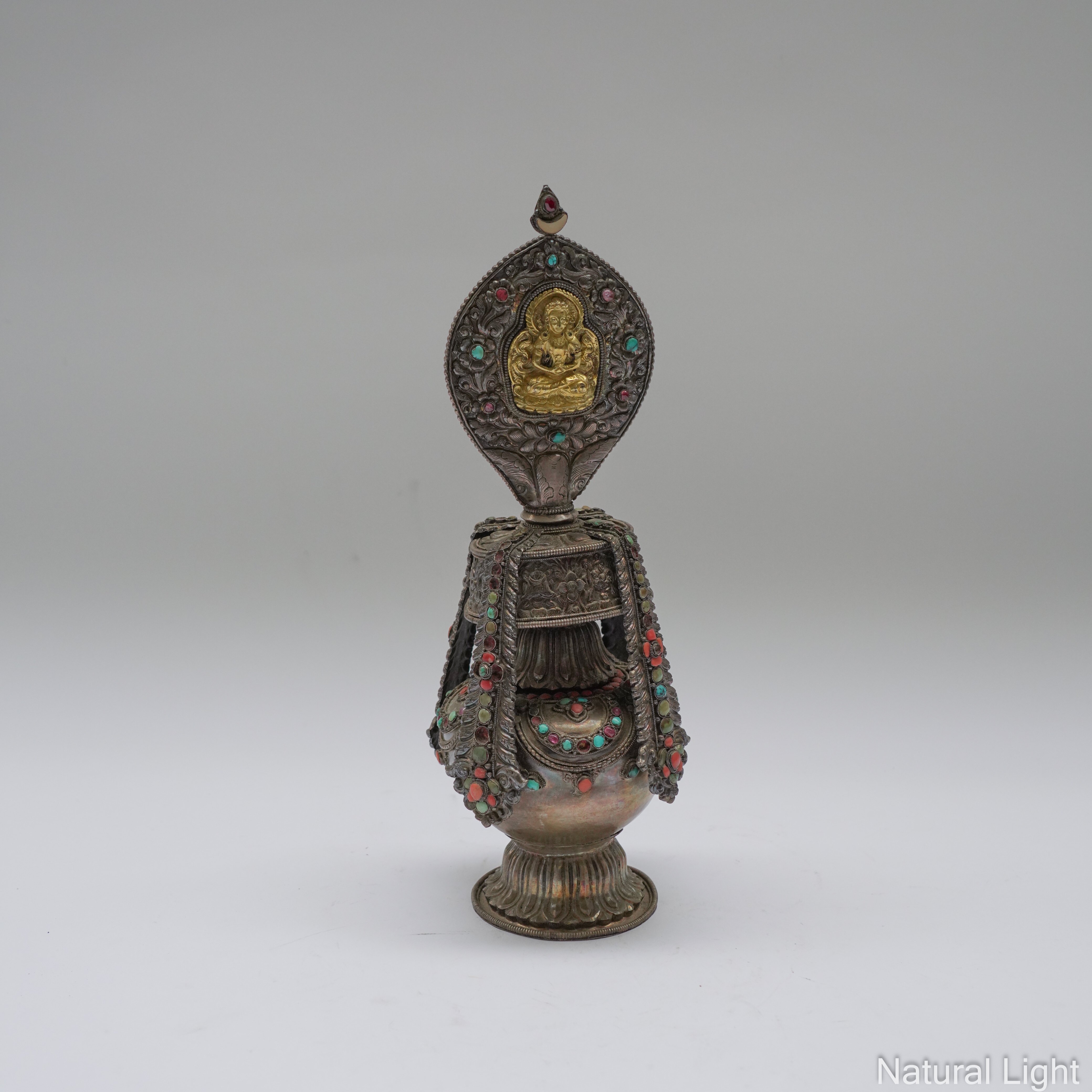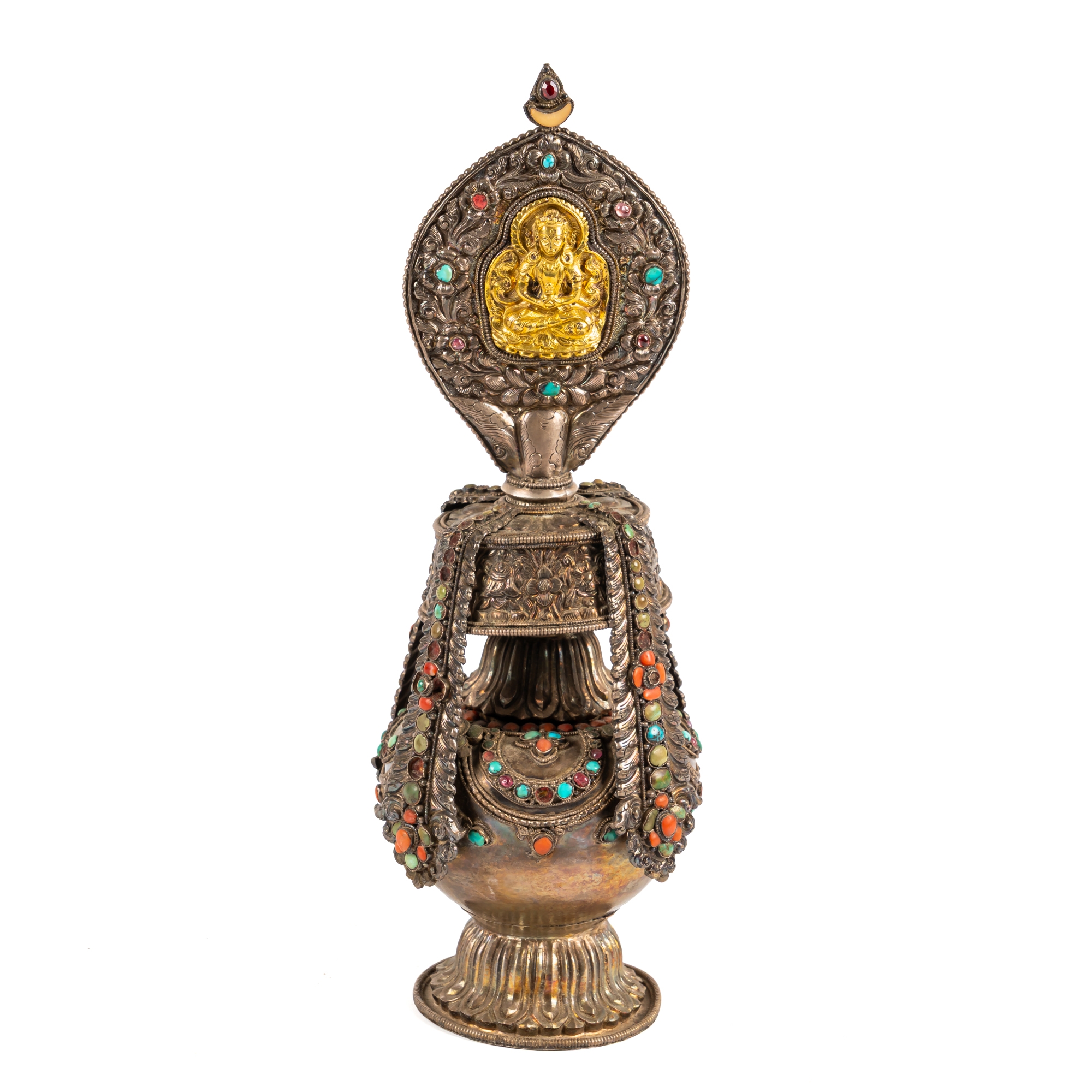 In the form of an overflowing vase on a flared lotus base, a separately made stopper with central gilt figure of Amitayus surrounded by scrolling foliage, set with turquoise, carnelian and other gemstones, 29cm high