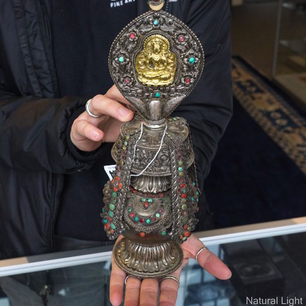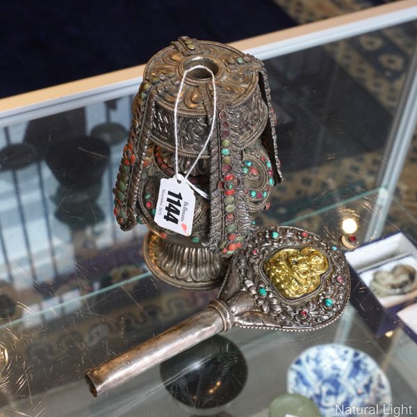 A TIBETAN PARCEL-GILT AND INLAID SILVER ALTARPIECE (2)