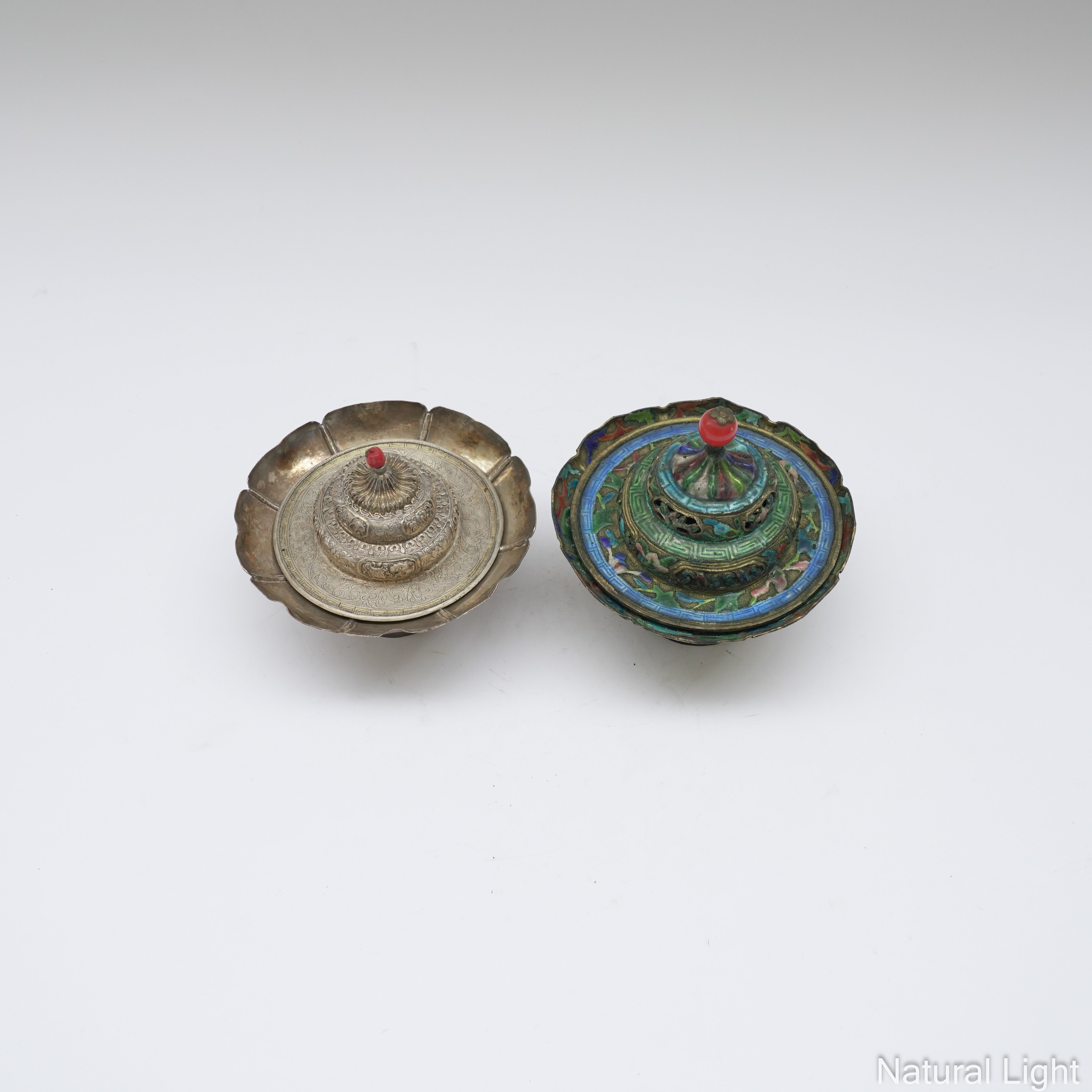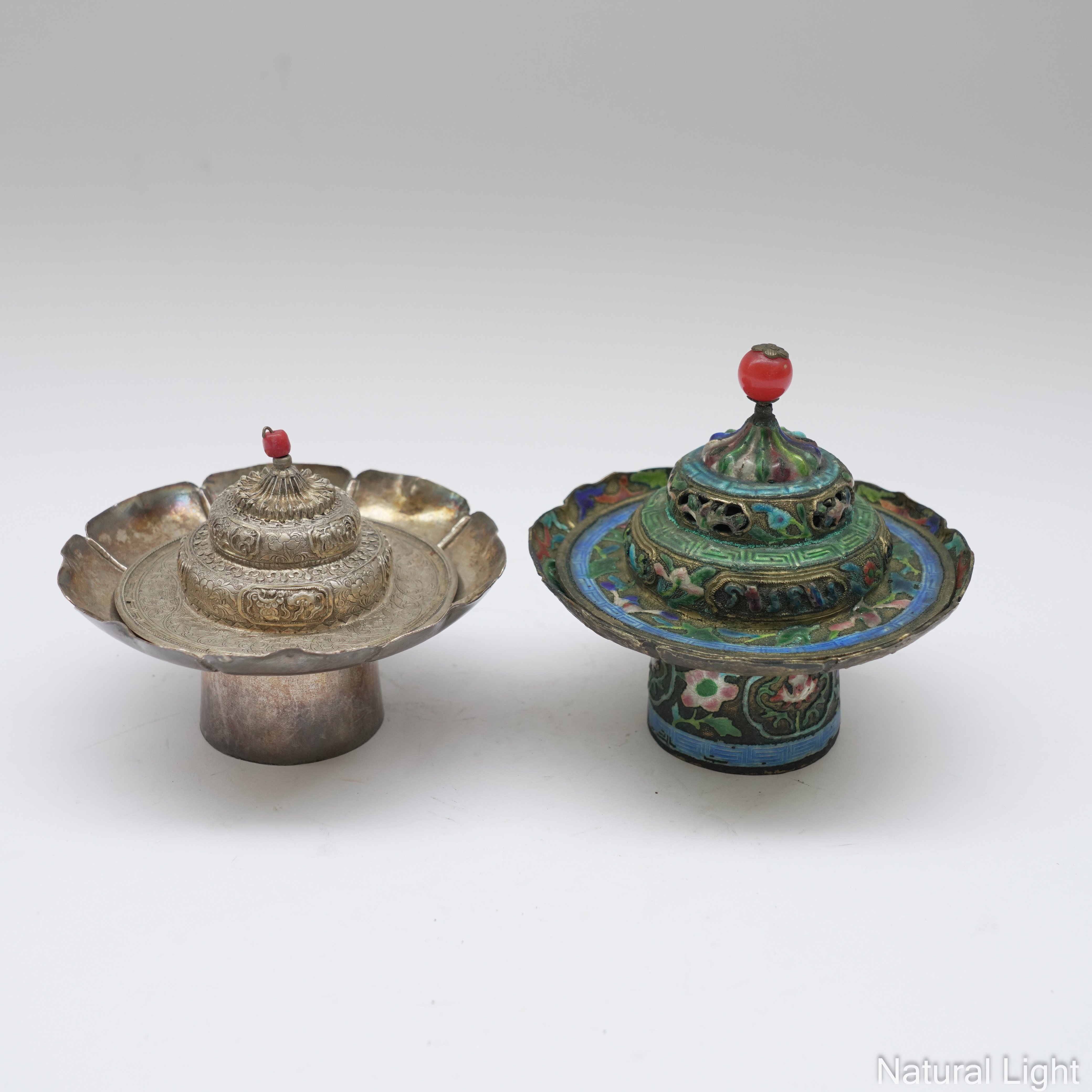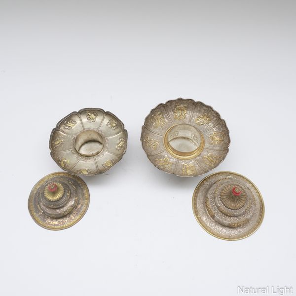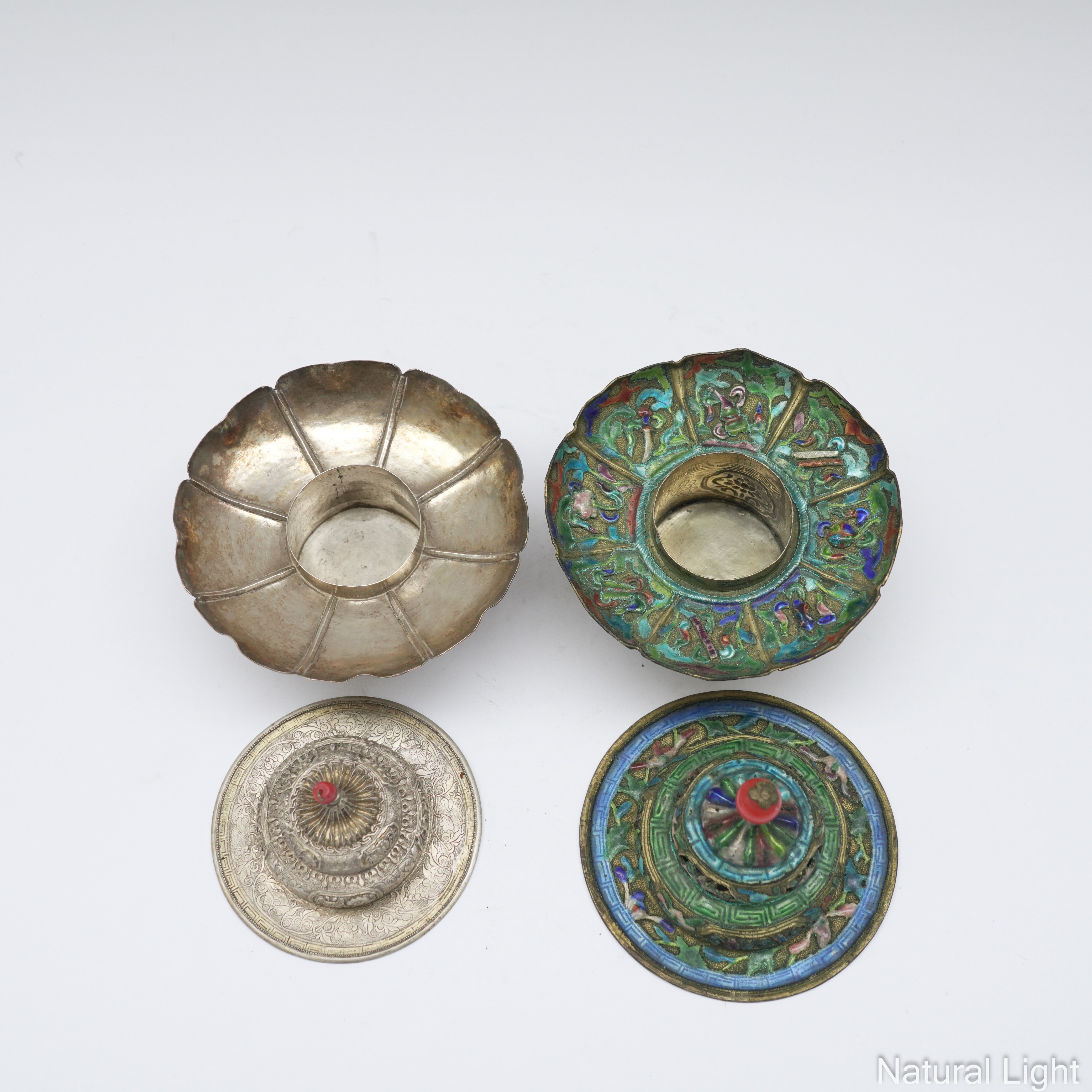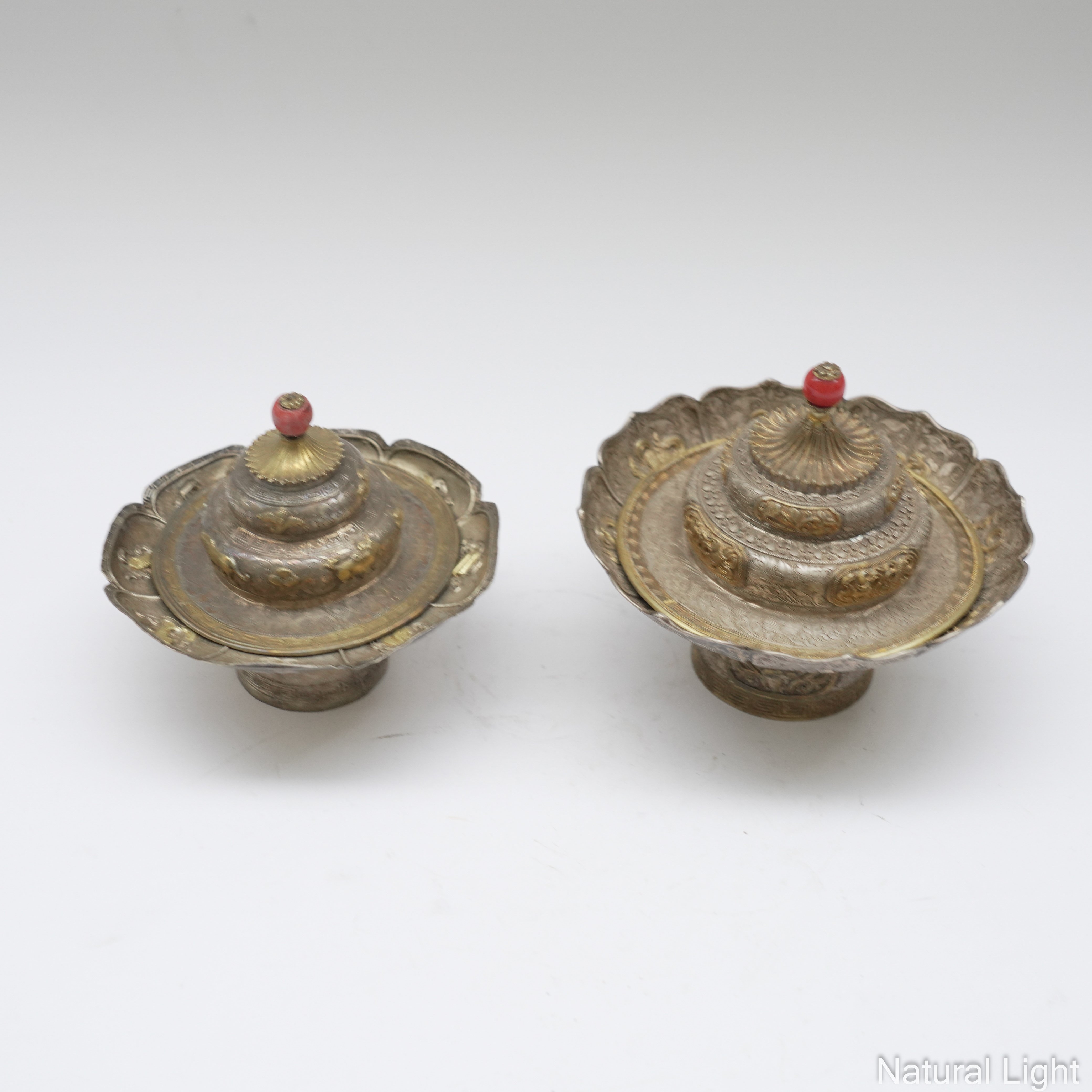 Each with a domed lid and carnelian finials, with engraved and repousse scrolling geometric decoration, the lower part in the form of a lotus, two with chased and repousse Buddhist emblems, another with enamel decoration and the fourth, plain, 10cm to 11.5cm high; together with a pair of Chinese blue and white teabowls, 7cm high