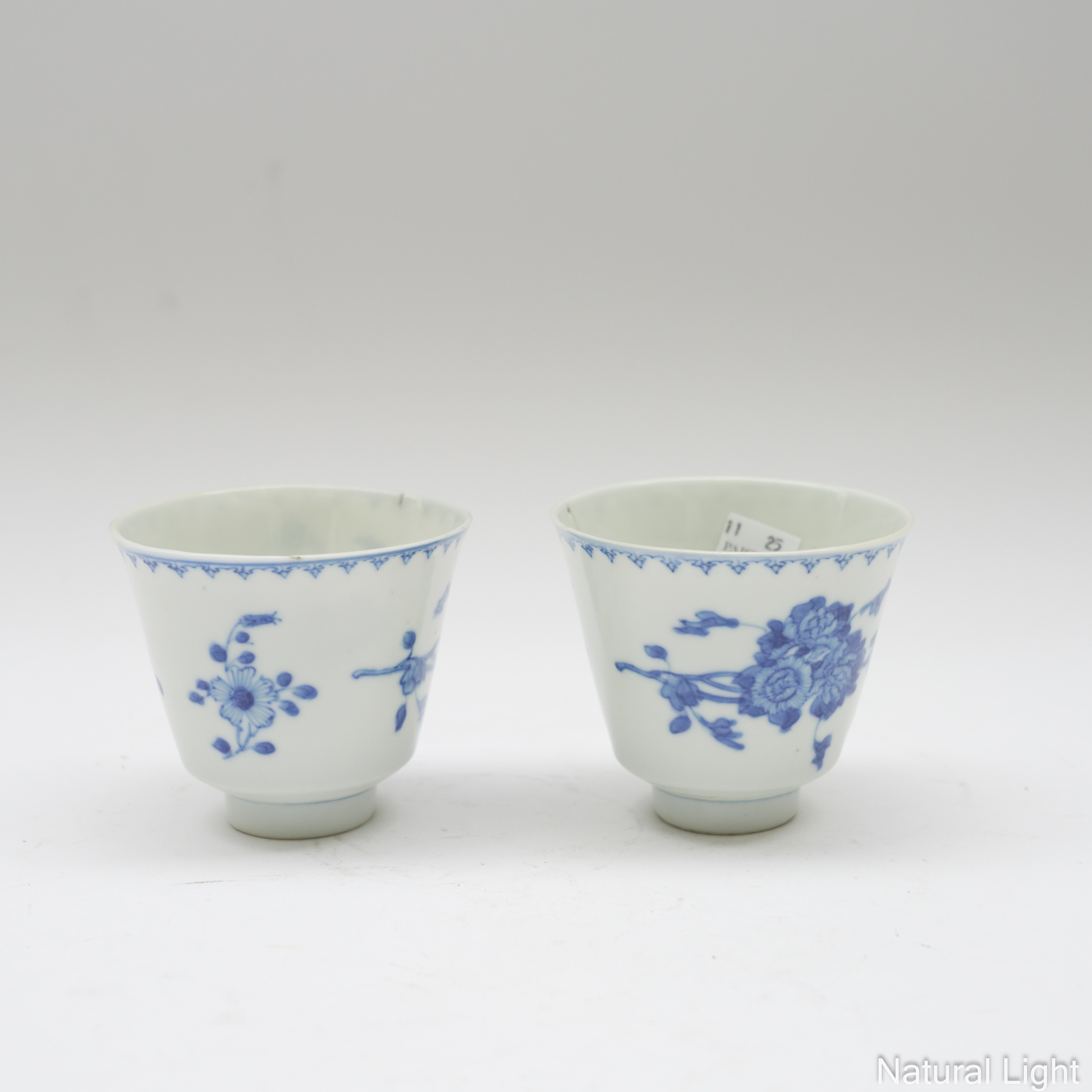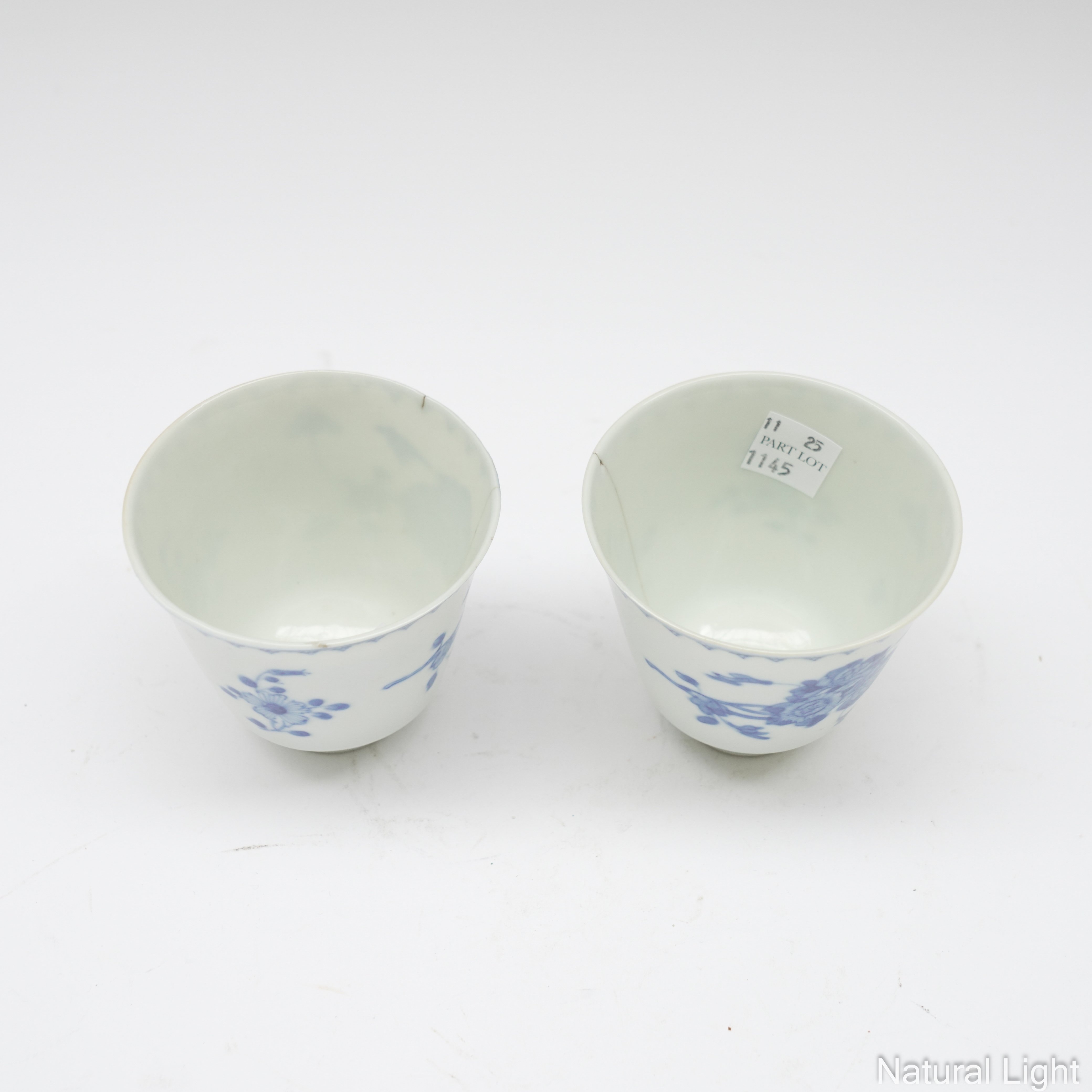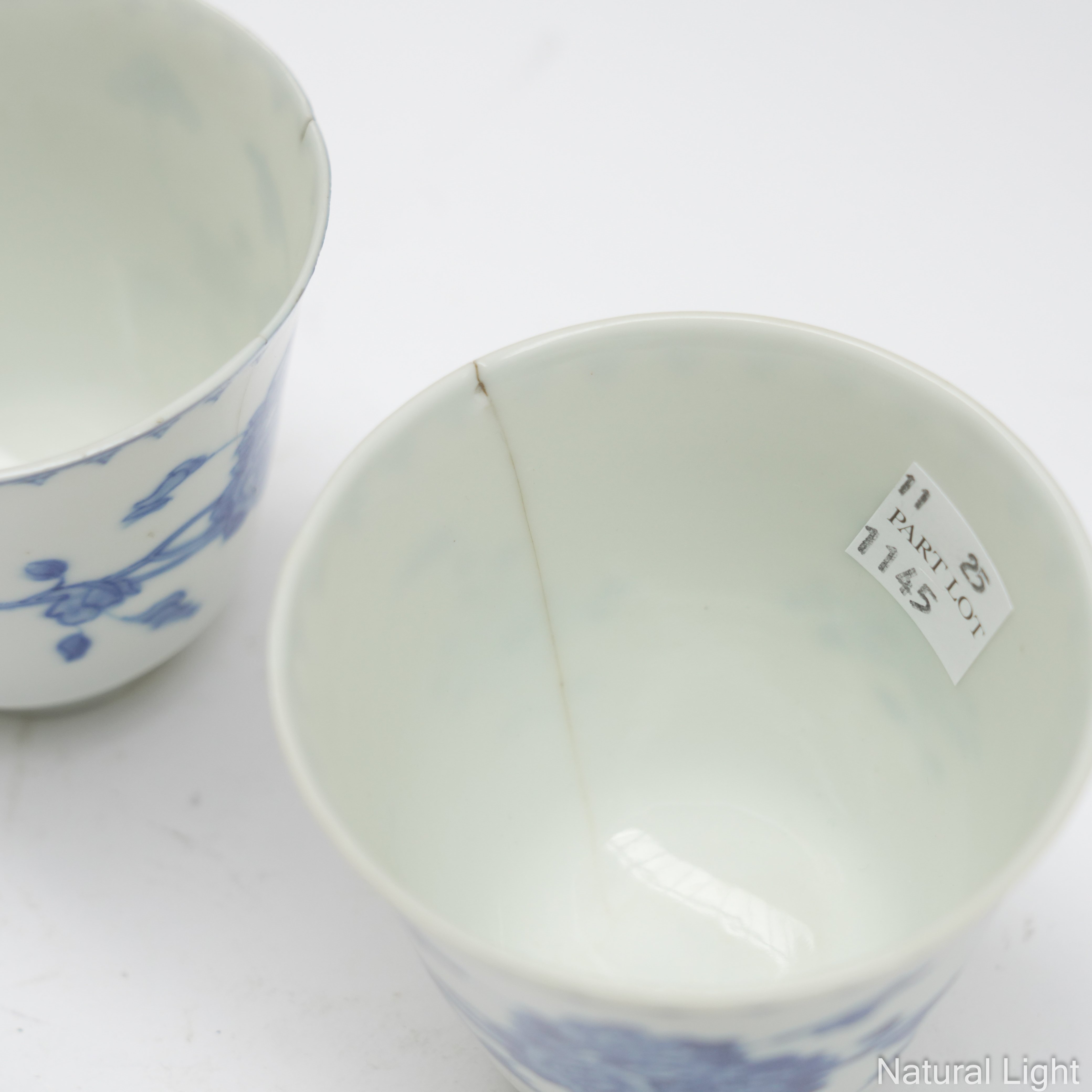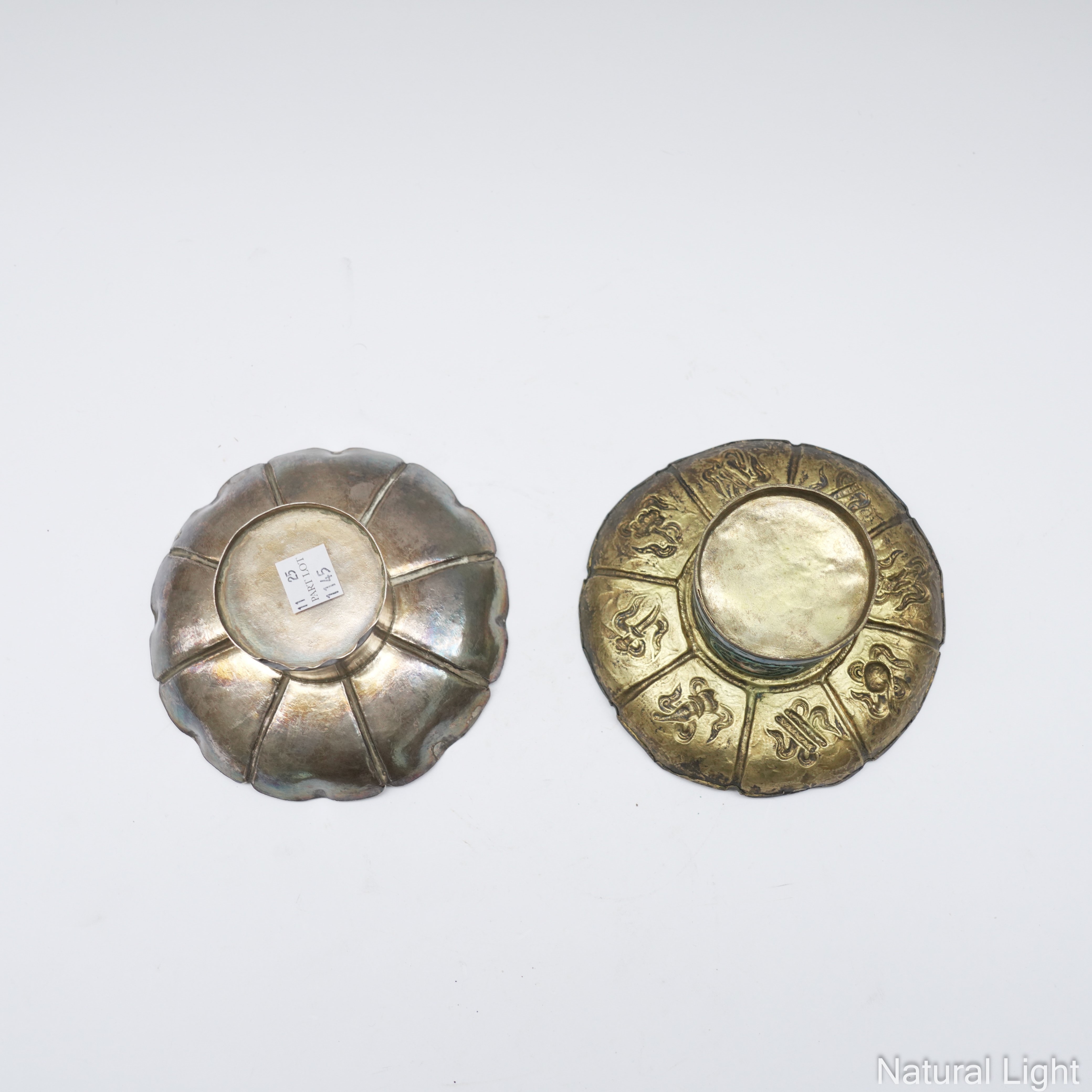 Each with a domed lid and carnelian finials, with engraved and repousse scrolling geometric decoration, the lower part in the form of a lotus, two with chased and repousse Buddhist emblems, another with enamel decoration and the fourth, plain, 10cm to 11.5cm high; together with a pair of Chinese blue and white teabowls, 7cm high