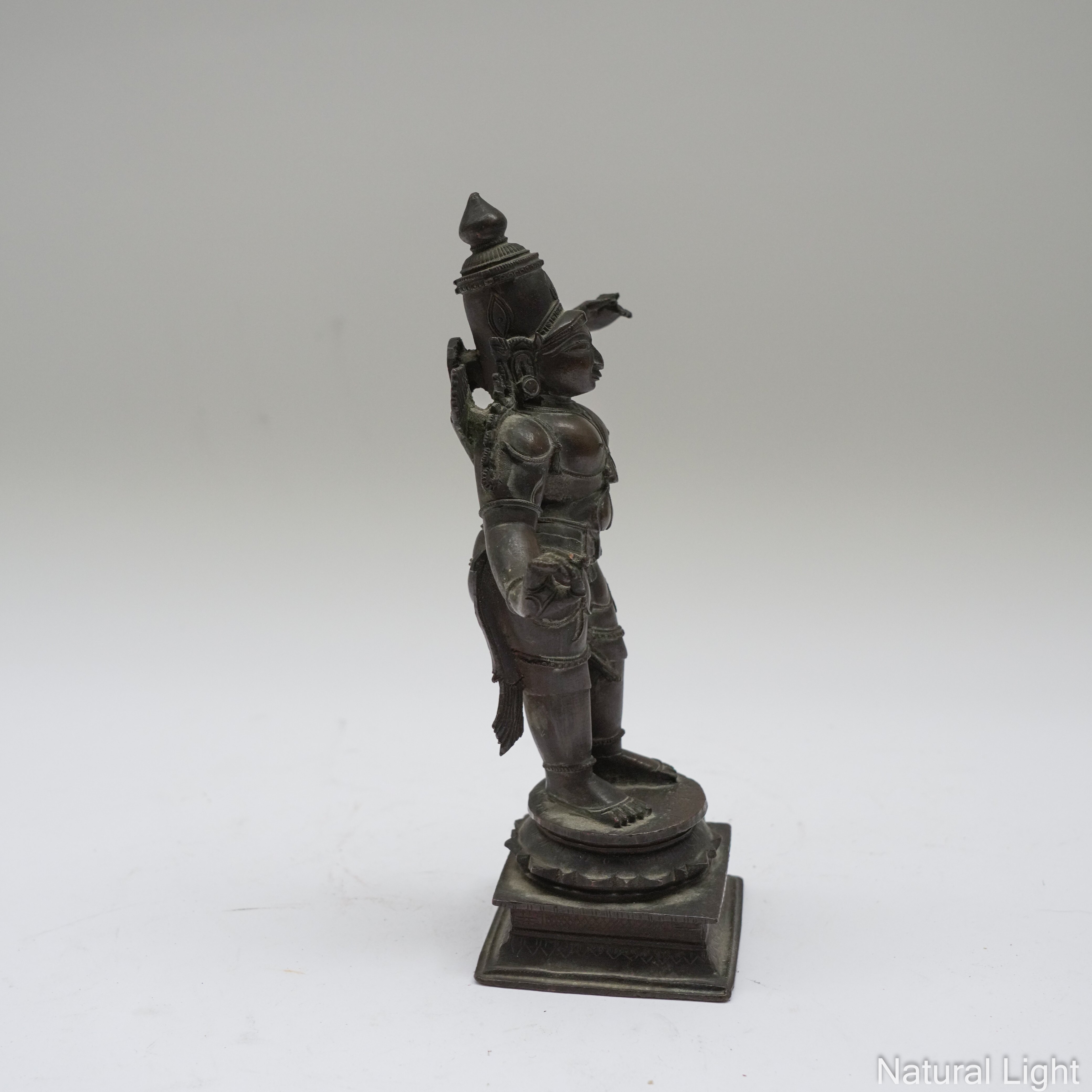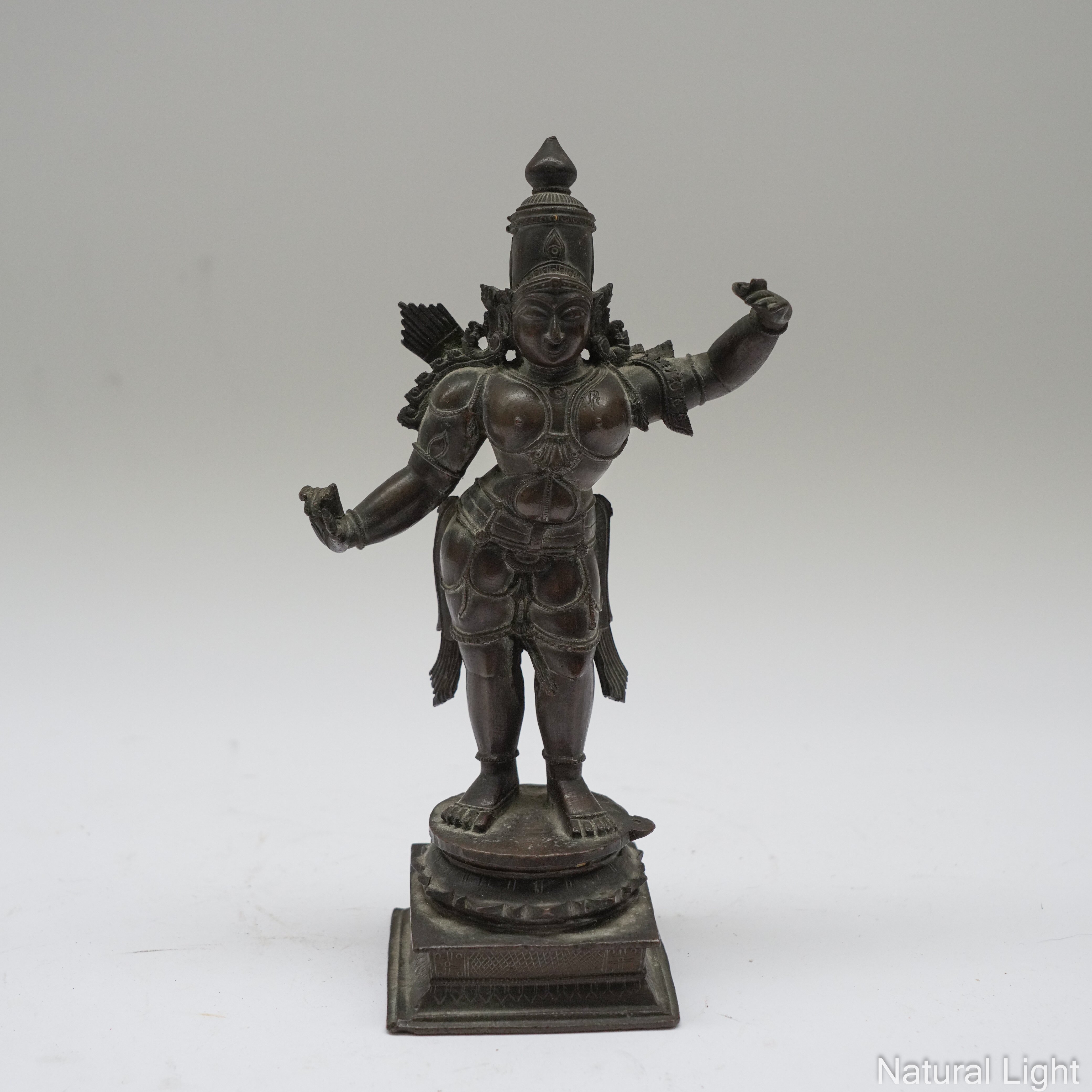 Standing in tribhanga, with left hand raised. a quiver behind his right shoulder, his head with a tall headress surmounted by a bud finial, 21cm high