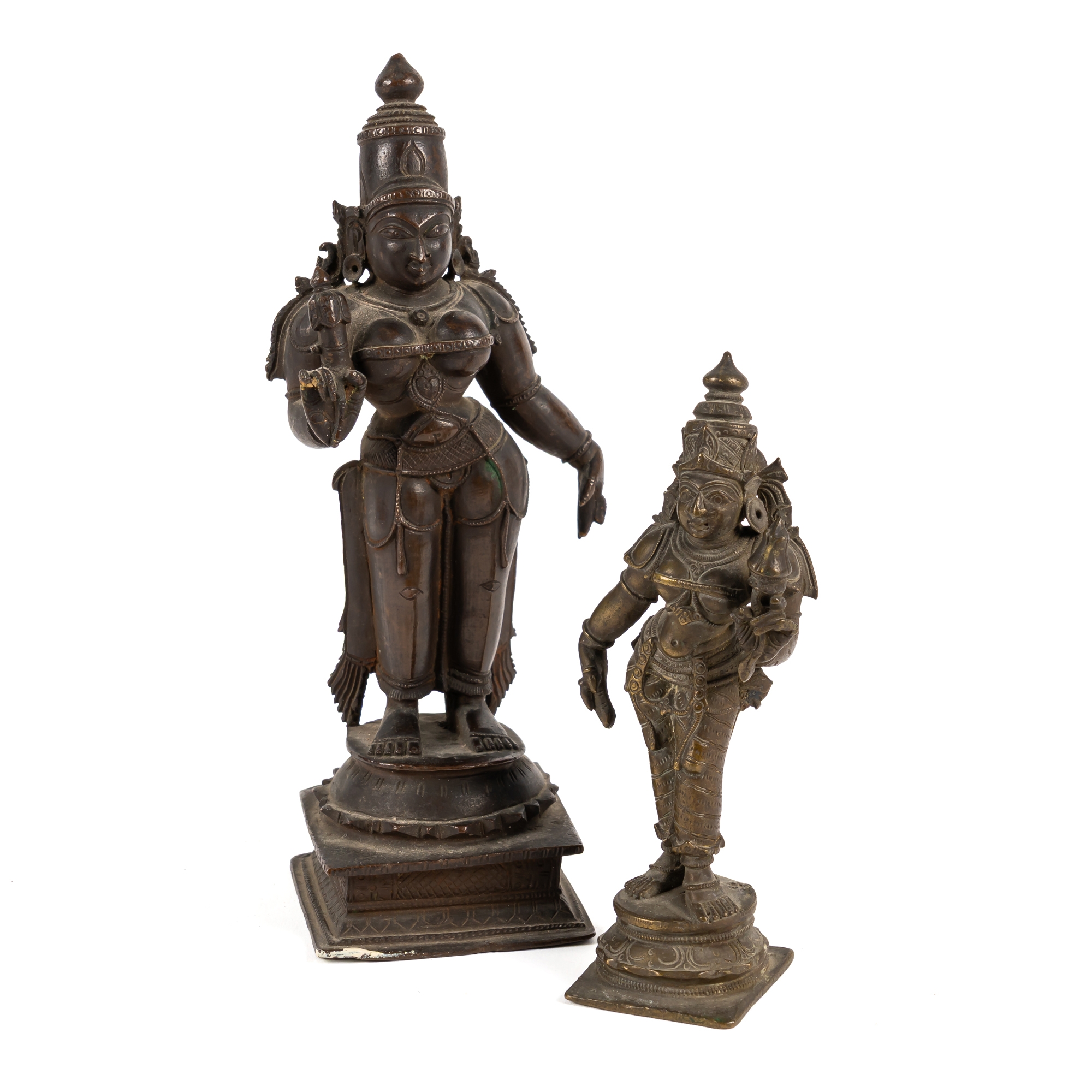 Standing in tribhanga on a raised lotus base, her left arm by her side, her right raised holding the stem of a lotus, her tall headress with bud finial, 18cm high; together with a smaller bronze figure of Sri Devi, 19th century, 12.7cm high