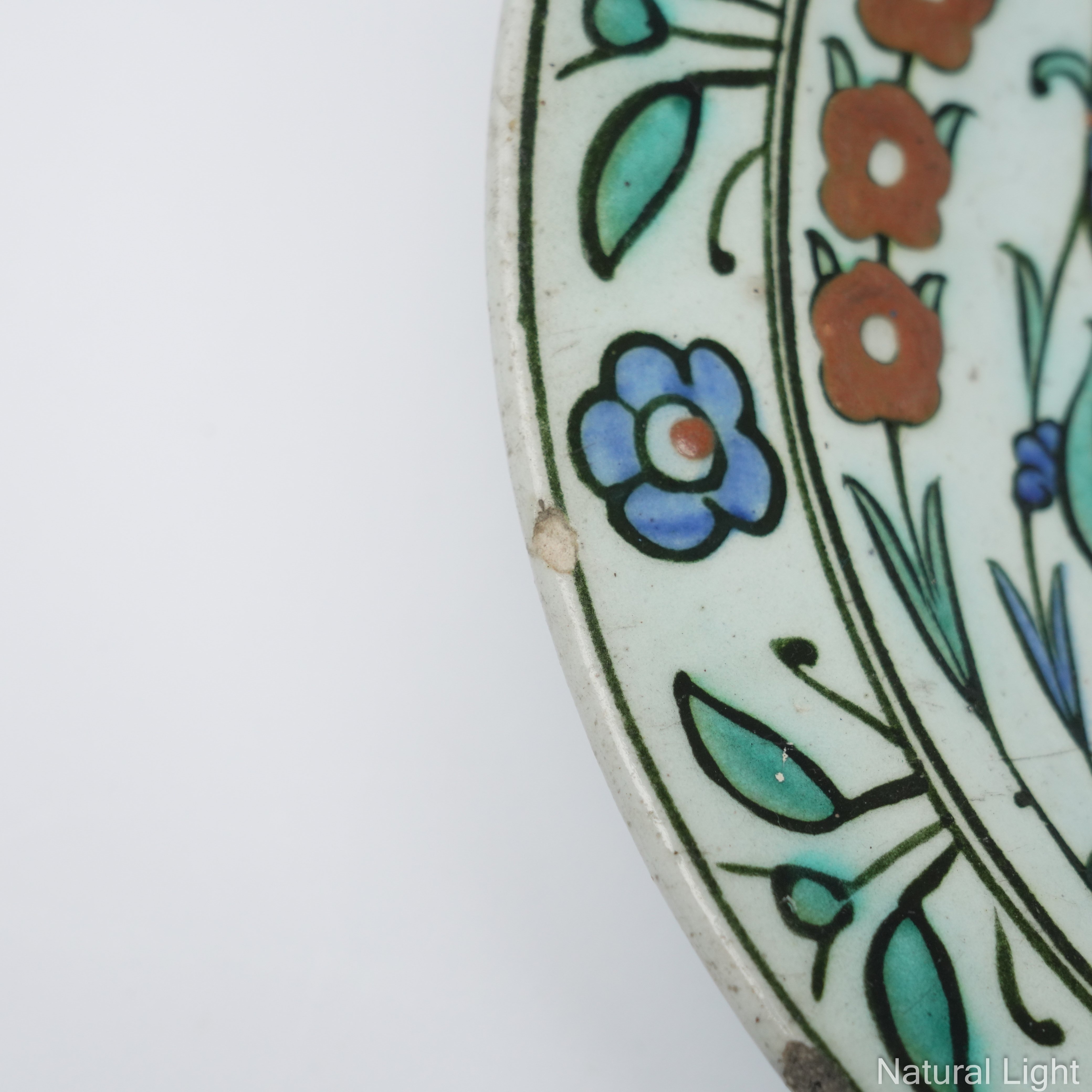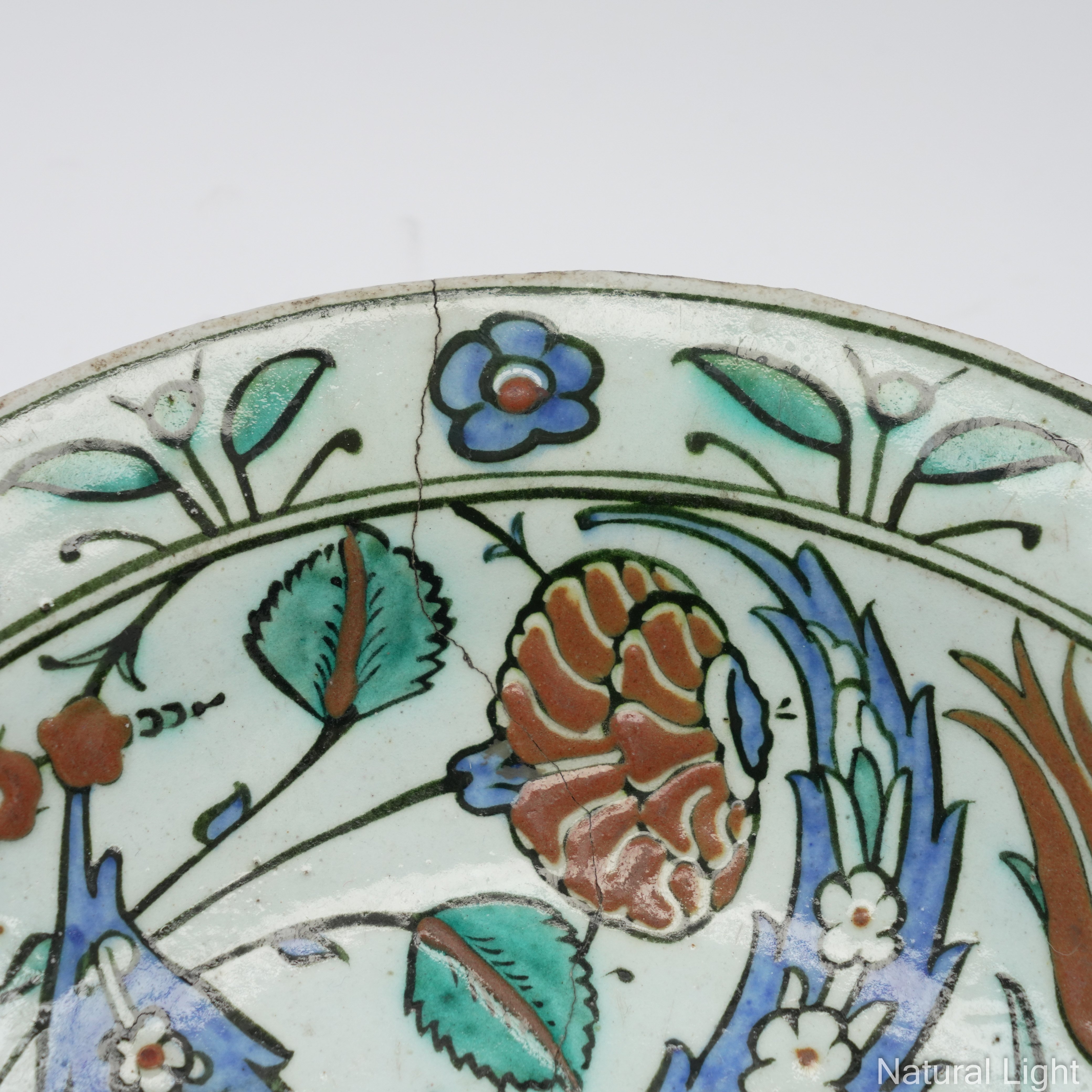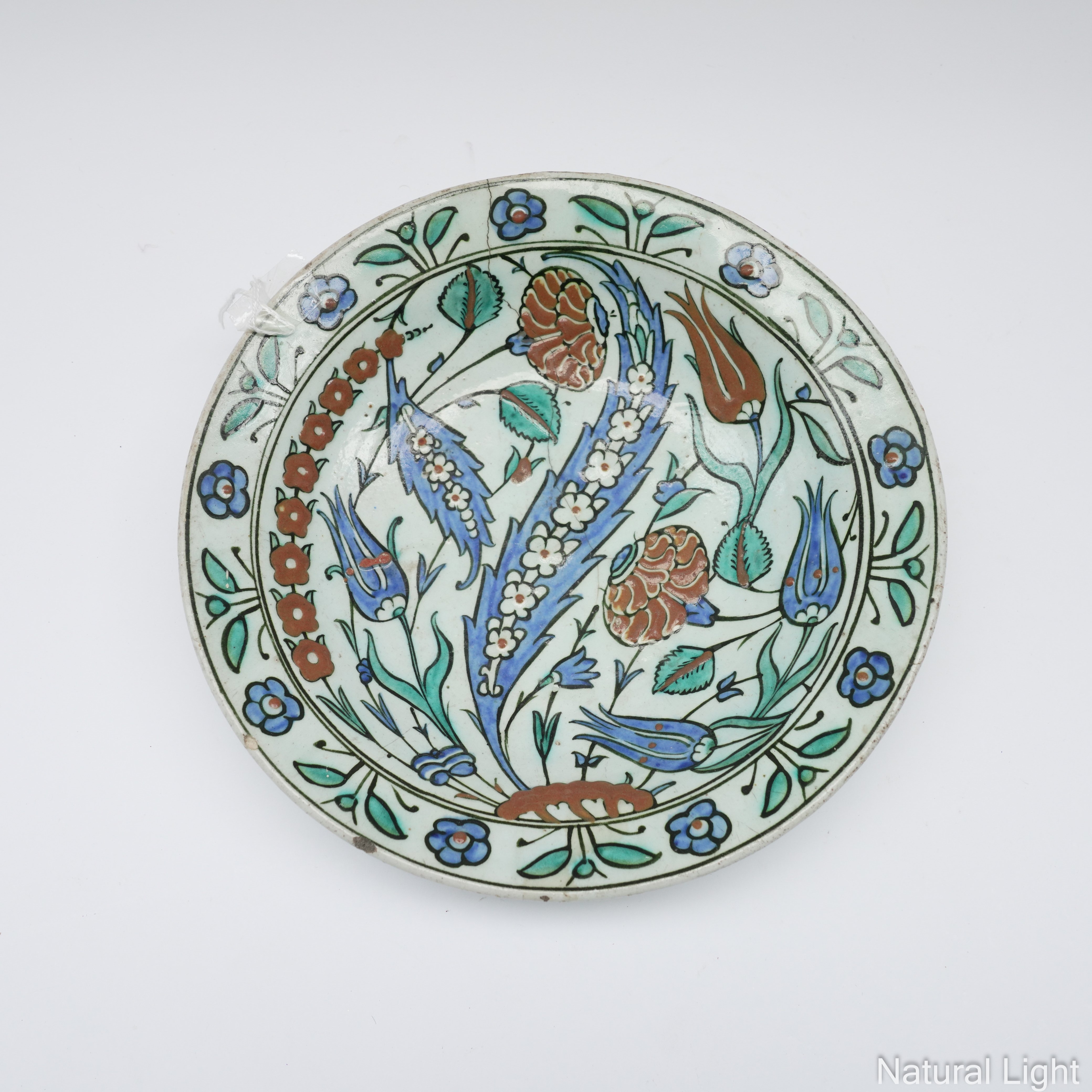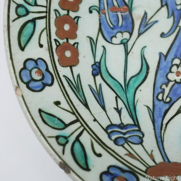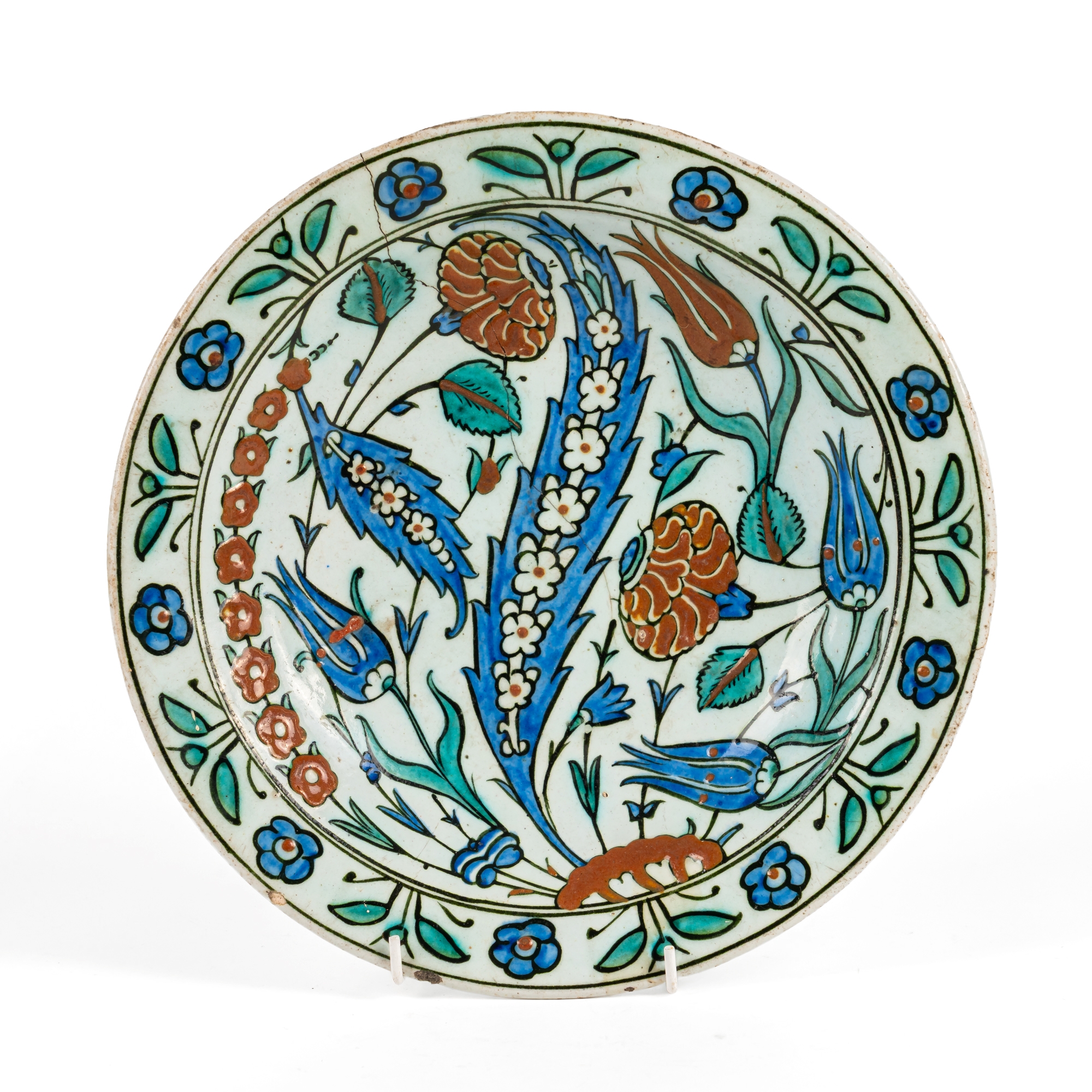 Painted in the centre with saz leaves, roses and tulips, the border with alternating flowers and leaves, 29.75cm diameter